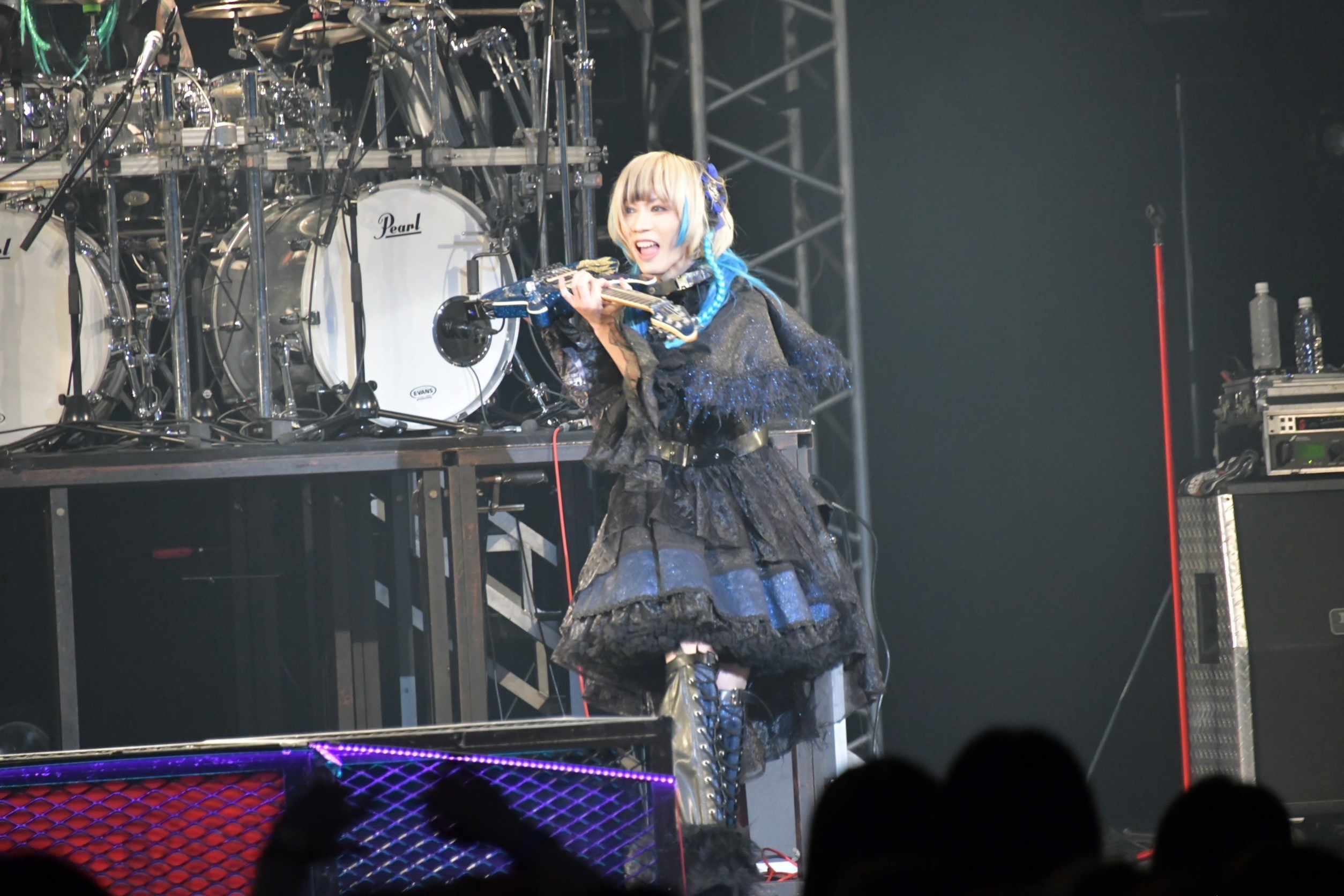 まだまだ行くぞ。TAKAを除く4人のセッション曲では、叫とYAMATOの見せ場もたっぷりある。MASATOと呼太郎のかけあい、そして呼太郎の驚異のソロとライトハンド奏法。楽器好きにはたまらない至福の時間のあと、ケンタウロスの着ぐるみで戻って来たTAKAの姿に全員が大笑いでずっこける、この落差もまた彼らの得意技。「マッスルドッグ試作型001」で尻尾フリフリ、馬の下半身をひきずりながら歌いまくるTAKAを、なぜかドラム台から下りて来たYAMATOが支える。もはや何でもありのカオス状態の中で、炎とレーザーにまみれたヘドバンソング「ADVANCE」へ。馬を脱ぎ捨てたTAKAの引き締まった肉体が激しく躍動する。クライマックスはもうすぐだ。