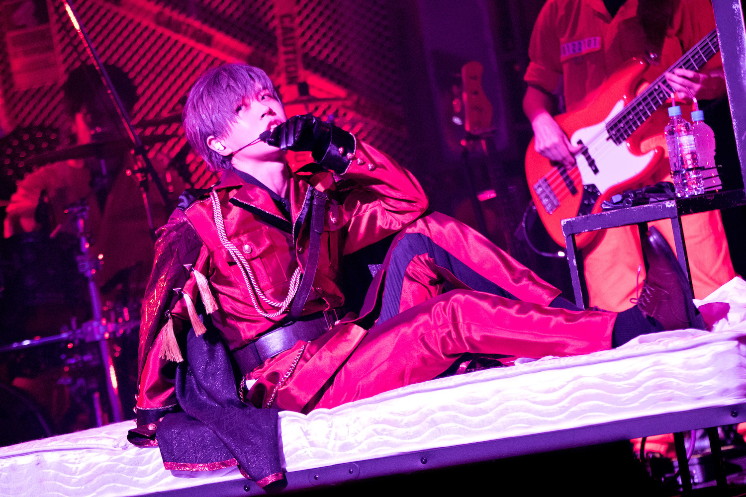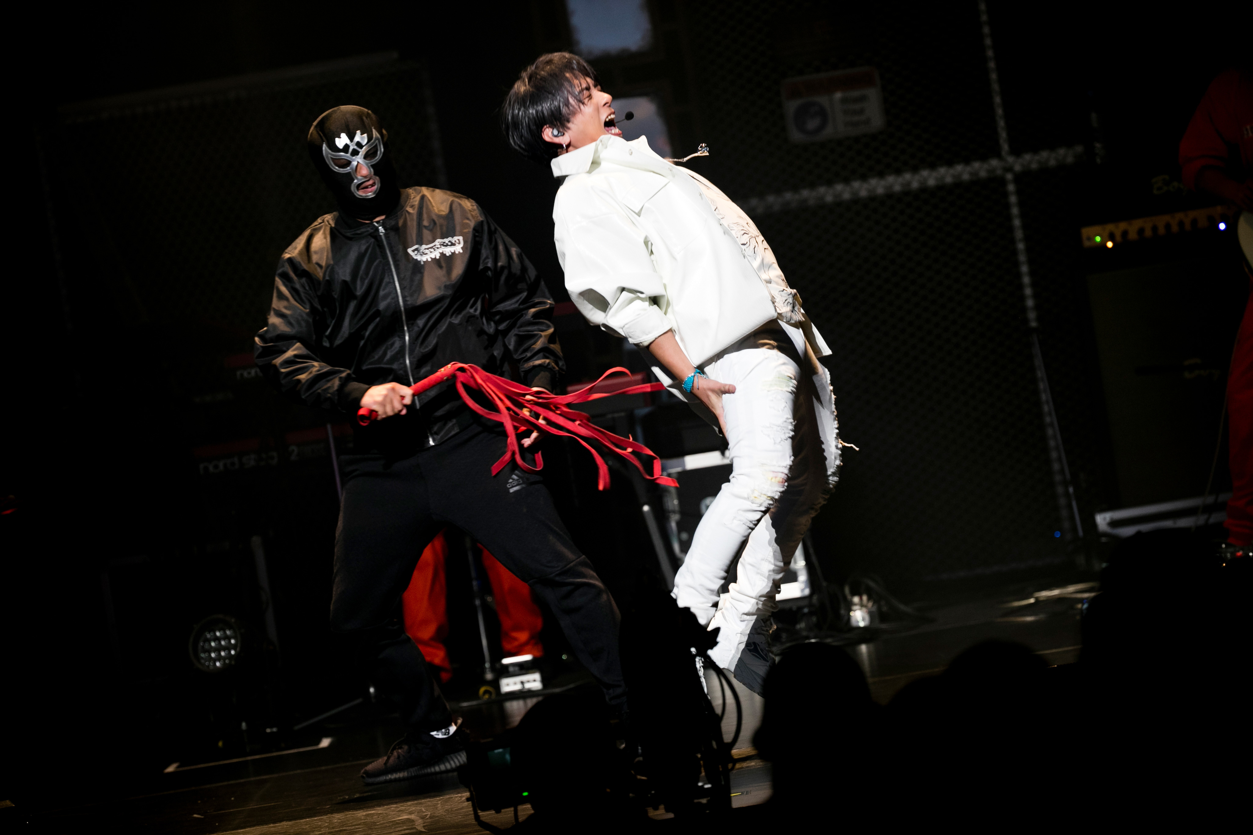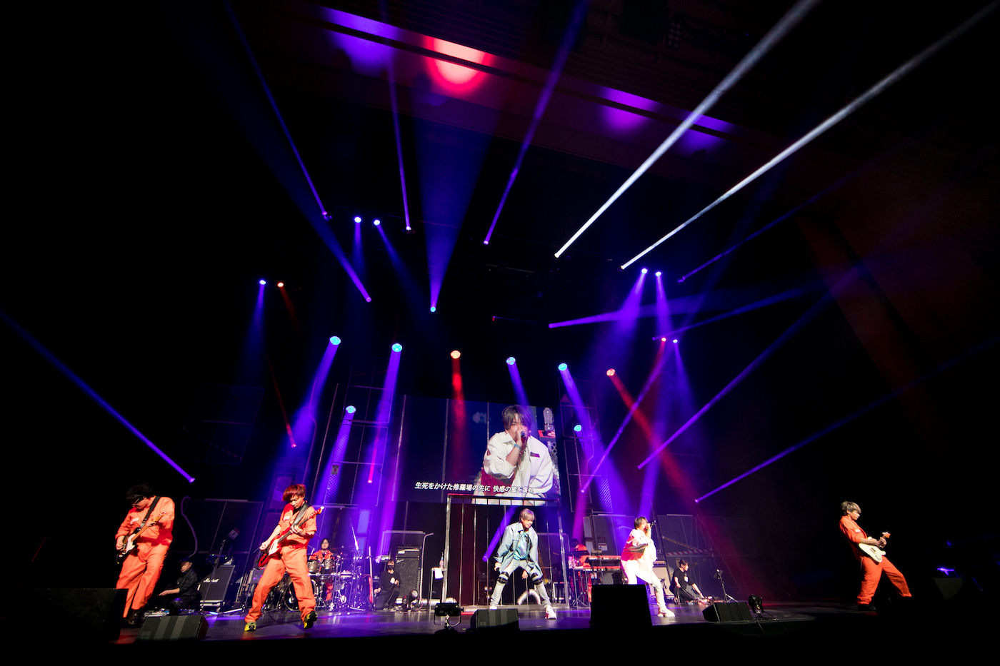 “DeePrison”というライブタイトルに相応しく、セキュリティフェンスや鉄格子などが目を引くステージ。不穏なオープニングがあけると、キービジュアルそのままの看守衣装に身を包んだ志麻とあほの坂田。が登場し、手にした警棒で鉄格子を叩きながら「地獄へようこそ」「生まれてきたことを後悔させてやる」「俺たちに従え」「ここでは俺たちがルールだ」といきなりたたみかけ、「My Sweet Prisoner」へ。オレンジの囚人服を着たバンドメンバーにがっちり支えられ、「ほら声出せ!」と煽り、眼光鋭く<ここじゃ俺がルール>とがなり声も交えて歌う2人。ドSが極まっているではないか。