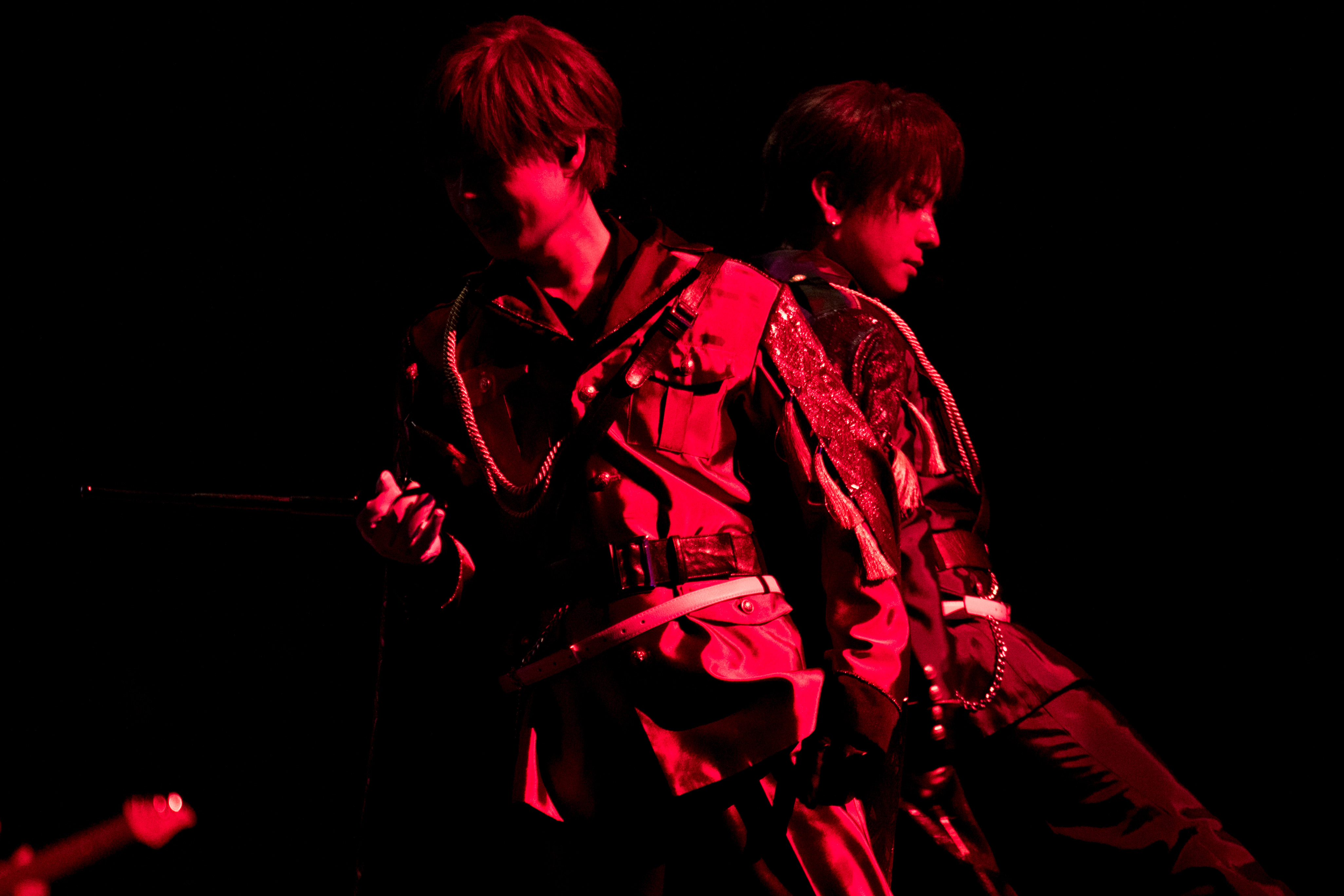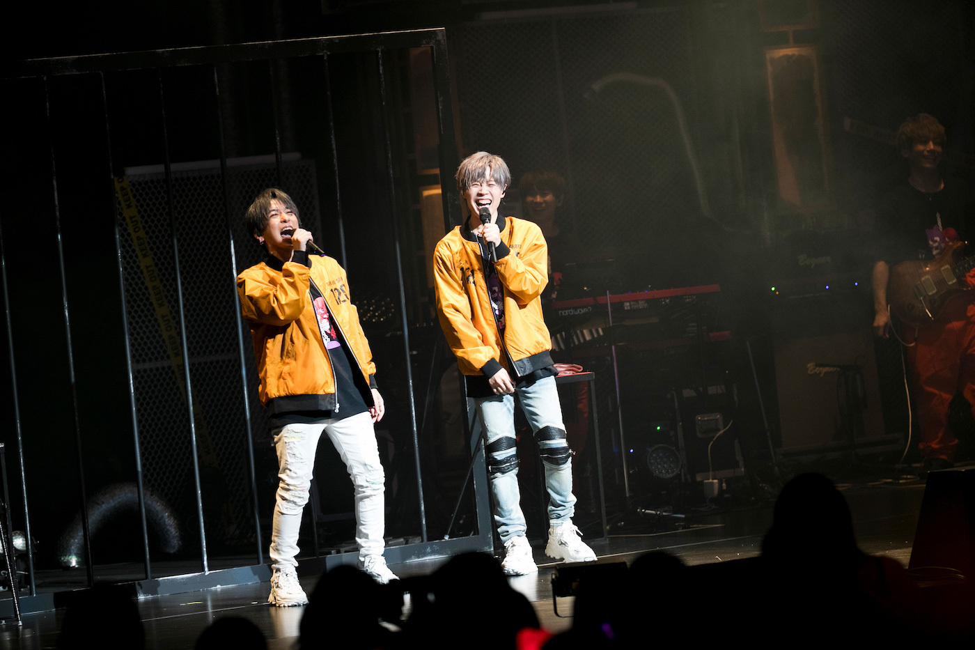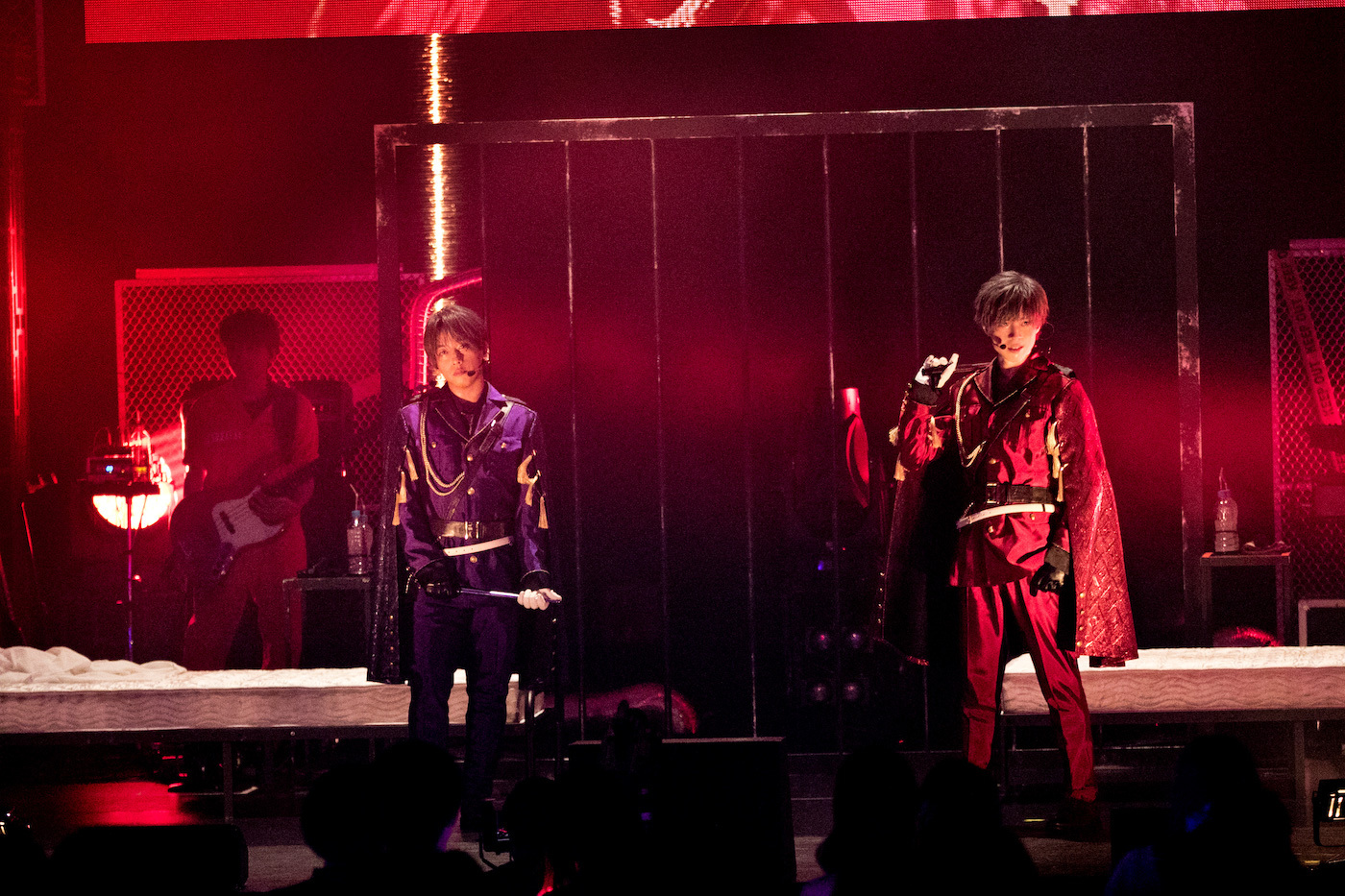 一転、赤いライトが飛び交い緊急事態発生のサイレンが鳴り響くと、「おまえは逃げないのか?」「自由になりたかったんだろ?」「逃げるかここで一生俺たちに飼われるか選べ」と選択肢が与えられ、2023年11月29日に動画公開されたばかりの「脱獄 -Rock Arrange ver.-」へ。生で聴くロックアレンジ、それに映える2人のパワフルな歌声、「よくついてきたな」「一生俺たちがかわいがってやるよ」というトドメの言葉。やっぱり、一生2人に飼われるしかない。