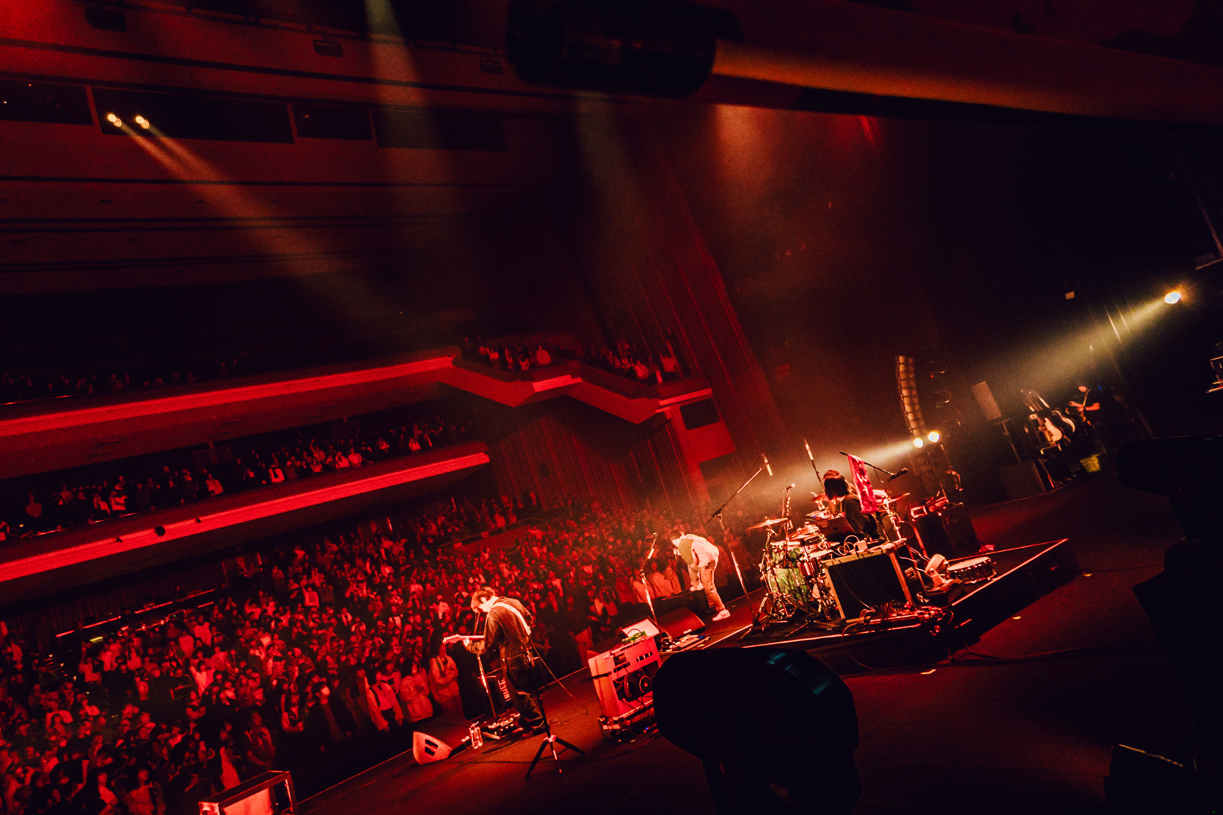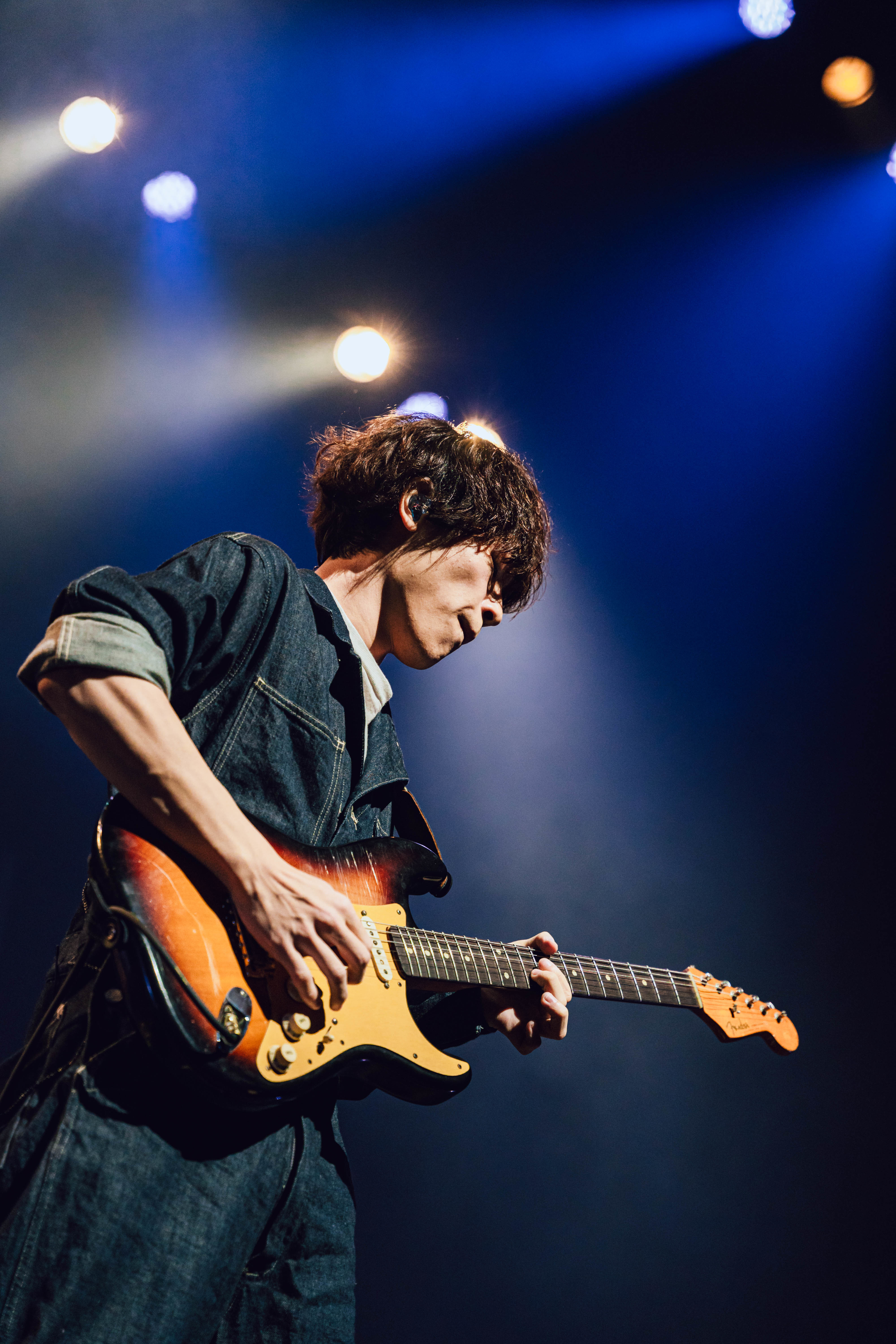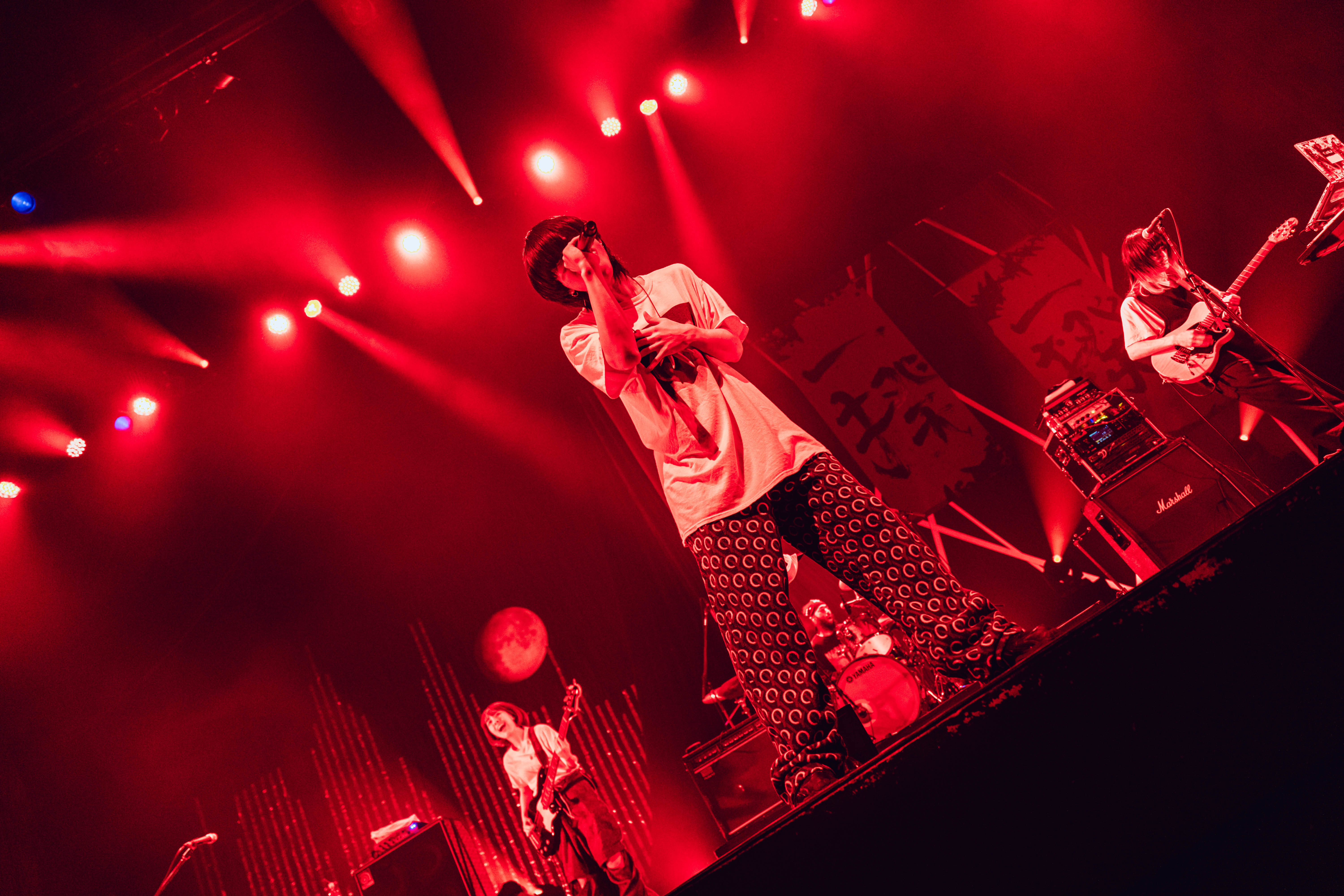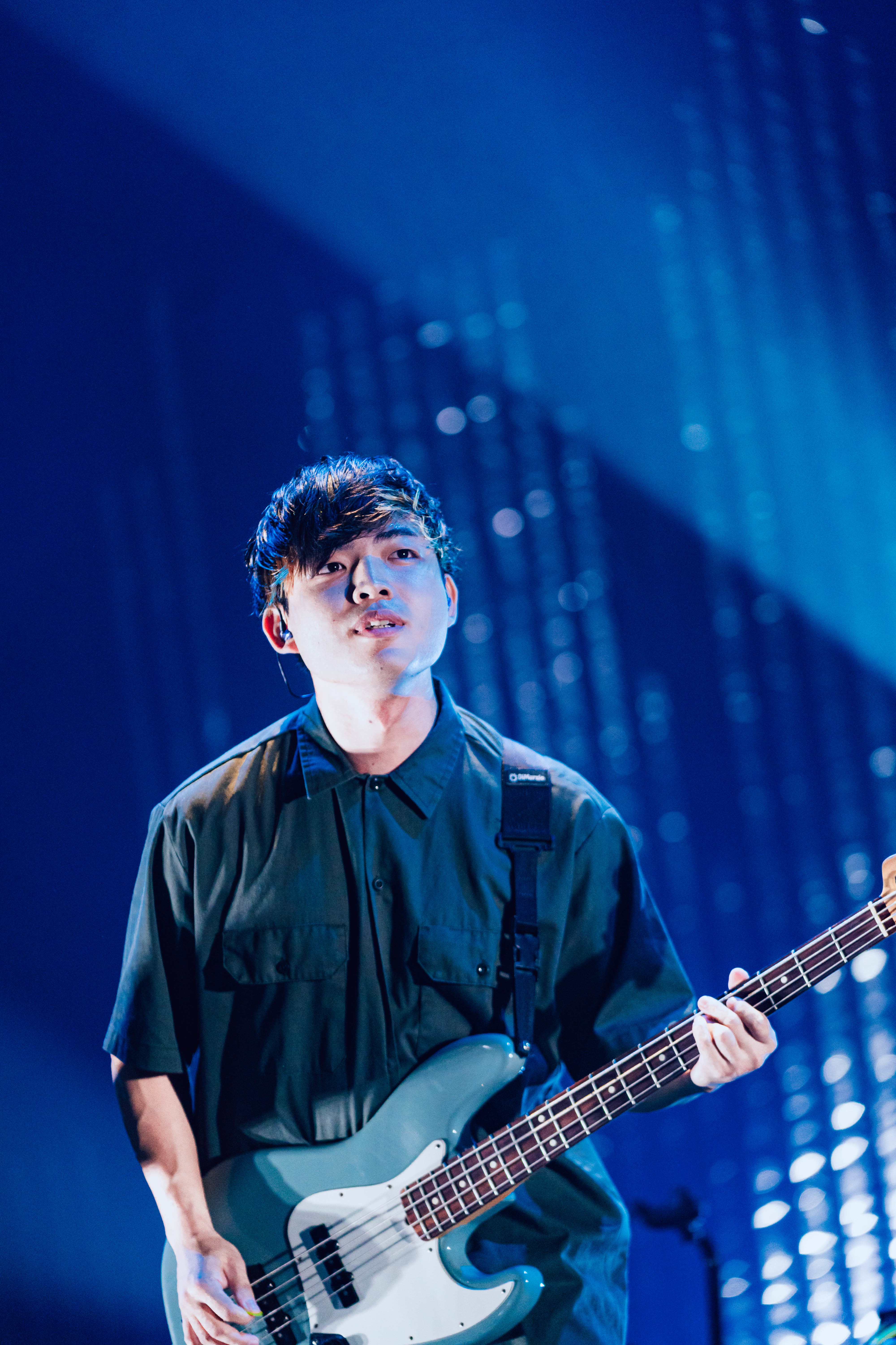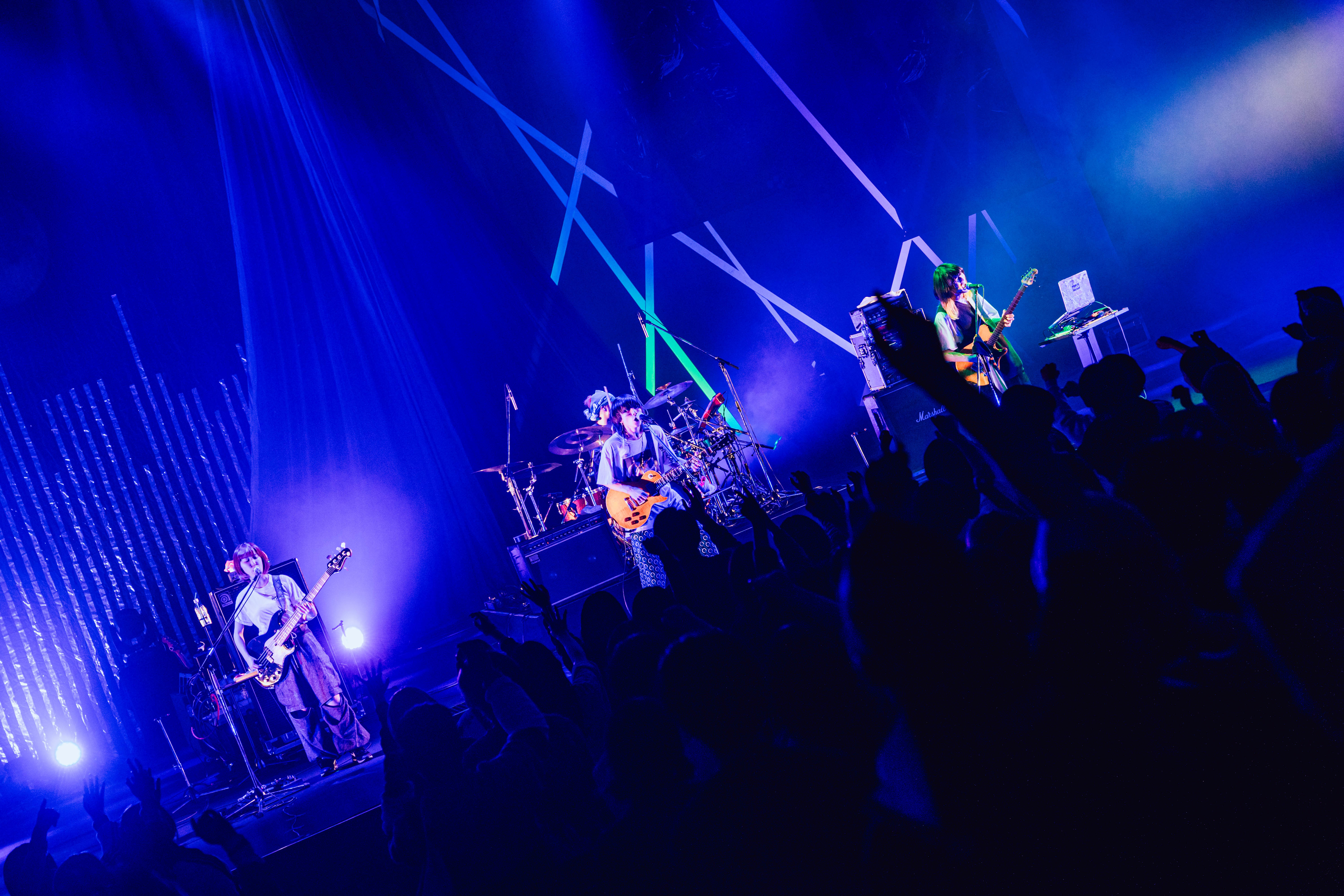 稲生が亡くなった大切な友人と自分が前に進むために書いたという「49」では、稲生の周りを丸い円が囲む。<もう夜が明けるよ>では浮かんでいた月が一瞬消え、ステージに光が溢れて4人が明るい円で包まれた。歌詞に合わせた演出は見事で、懸命に声を響かせる稲生の姿も胸を打つ。続く「エンジェルラダー」では、福岡はシンセベースを操り、よりメロディアスに、少しダークな雰囲気も感じさせつつ会場を引き込み、秘めたものを感じさせるパワーで圧倒した。