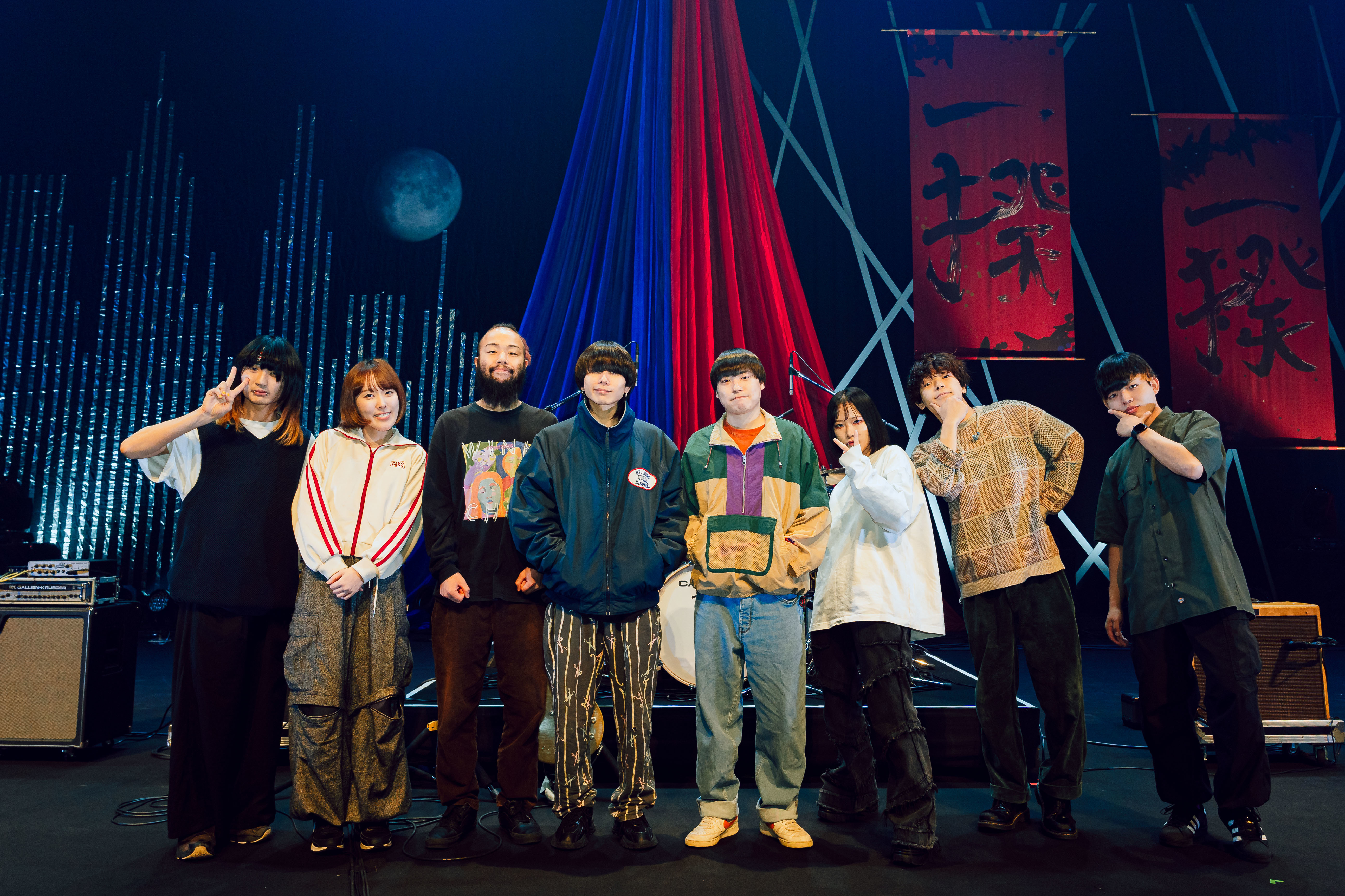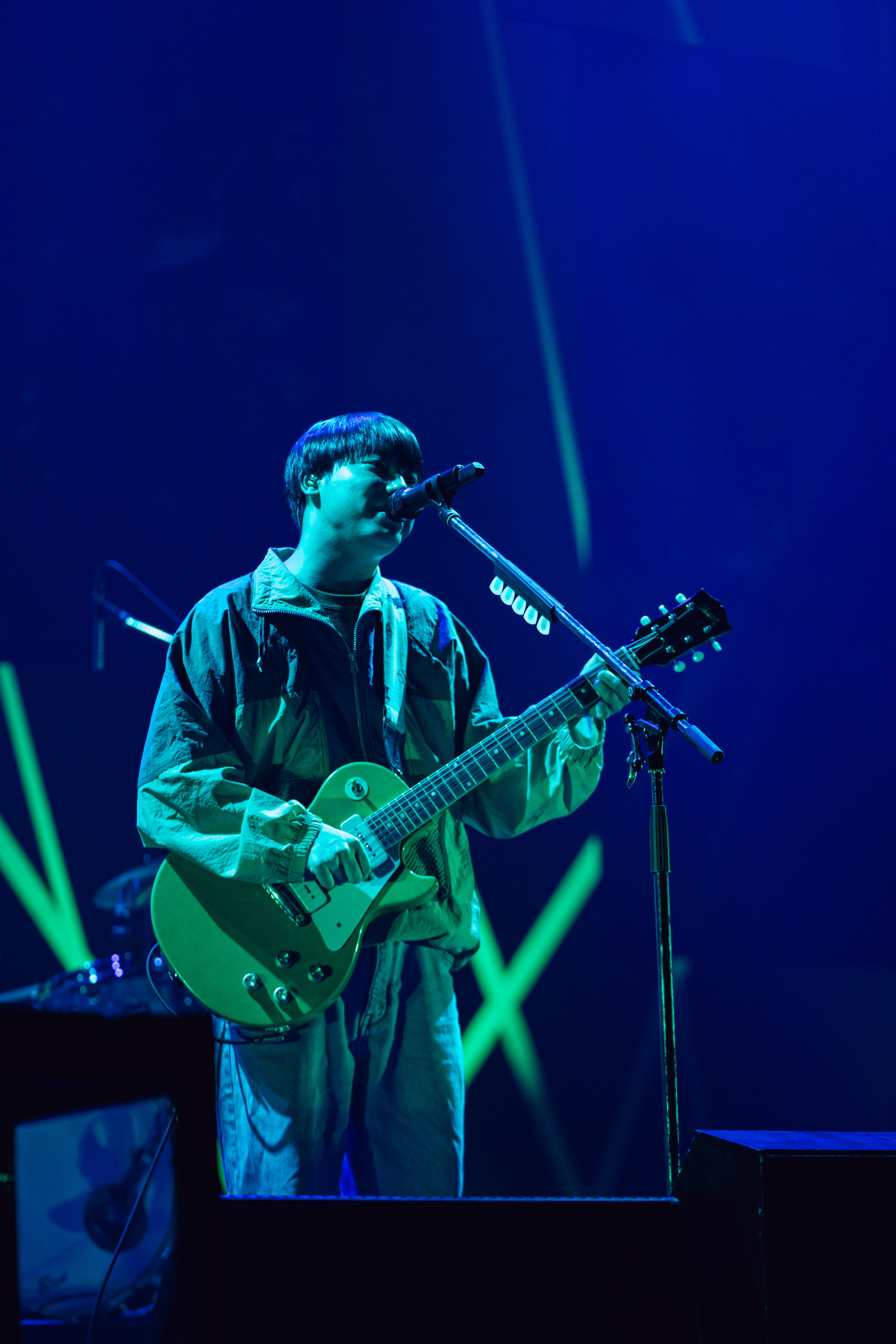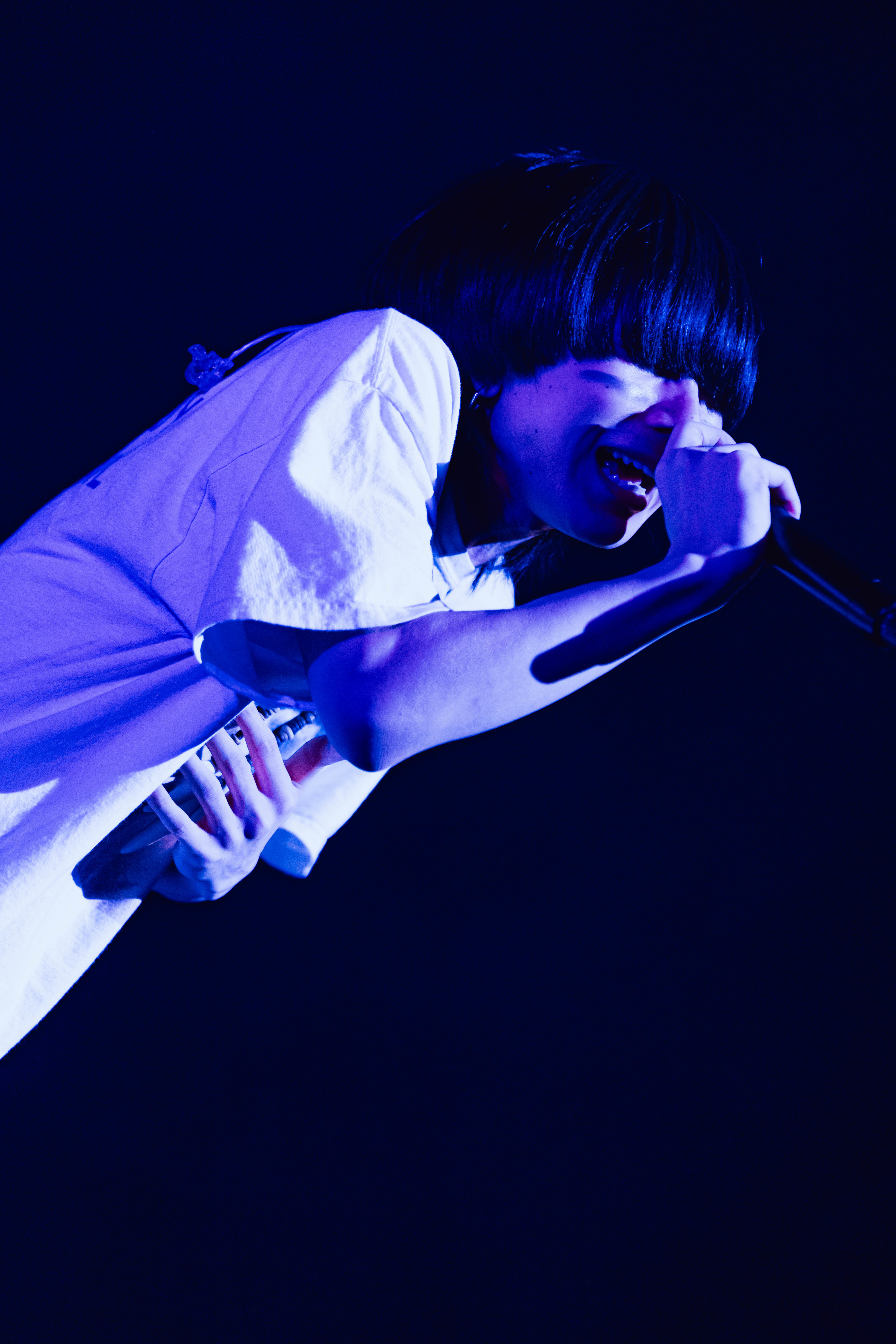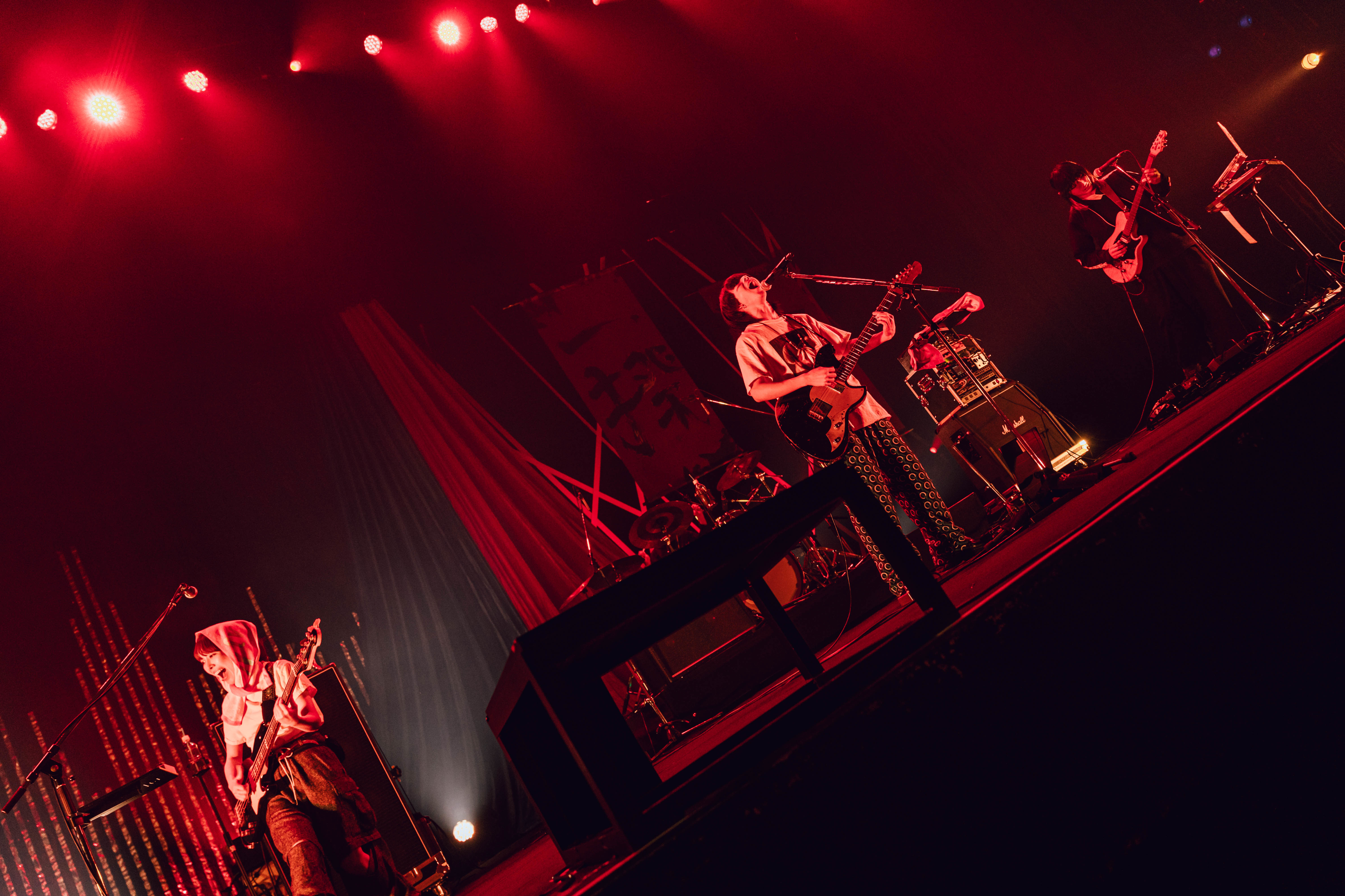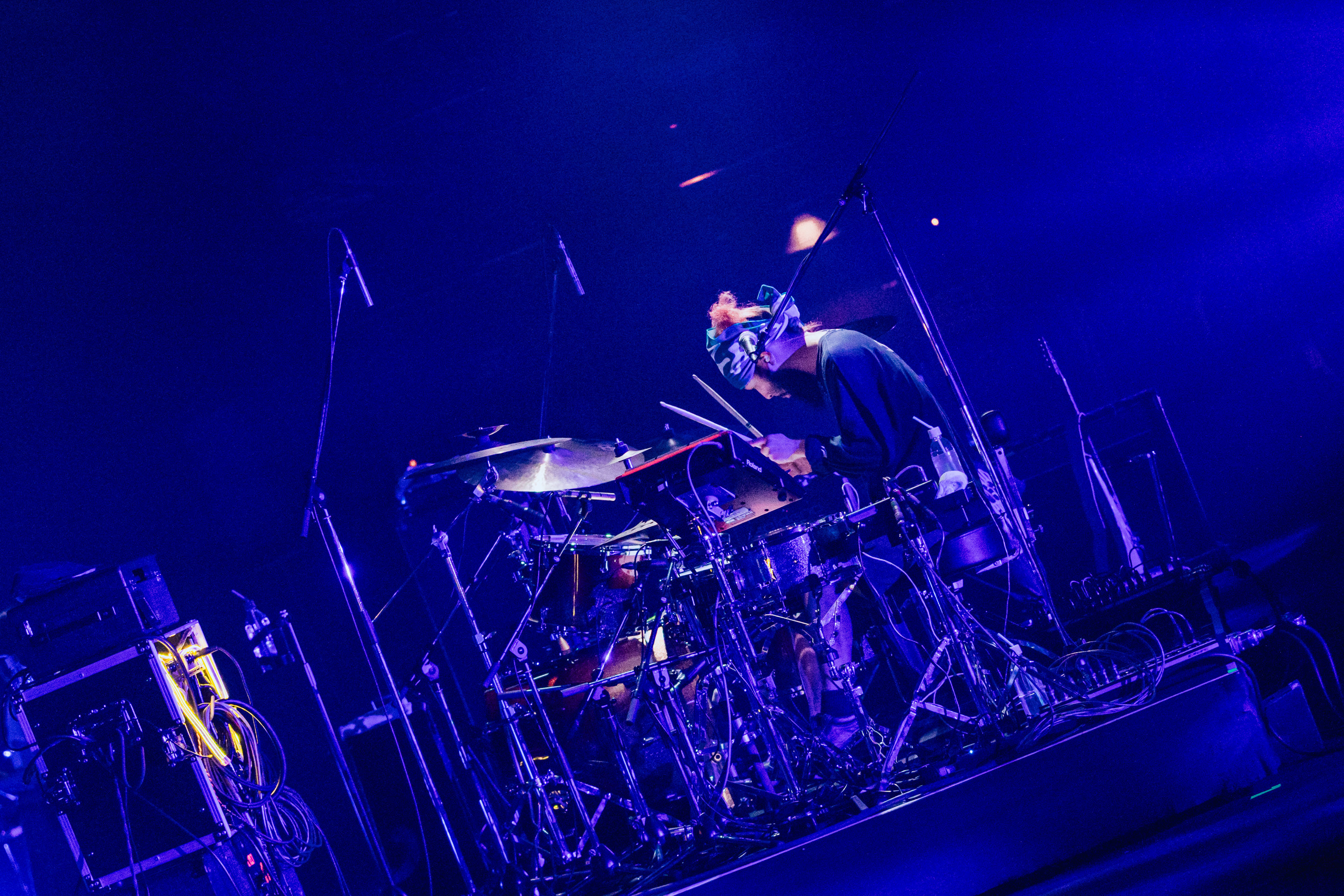 ほぼ1曲暗転した状態で披露された「病の魔法」は、ホールならではの照明ワークが寂しげなサウンドを引き立て、強烈な印象を残した。続く「九鬼」のイントロでは、ダイナミックな大樹のビートに夕日のギターが絡みつき、かほとくぅのバッキングがノイジーに重なり、夕日のギターリフから爆発するようにバーン! と音が前に放たれた時、鳥肌が立つと同時に脳内で銀テープが飛んだ(ぜひいつかお願いしたいところだ)。NEE節炸裂の転調祭り、夕日のテクニカルなギター、予測不能な曲展開、これぞNEEの真骨頂! と言わんばかりのプレイを見せつけた。