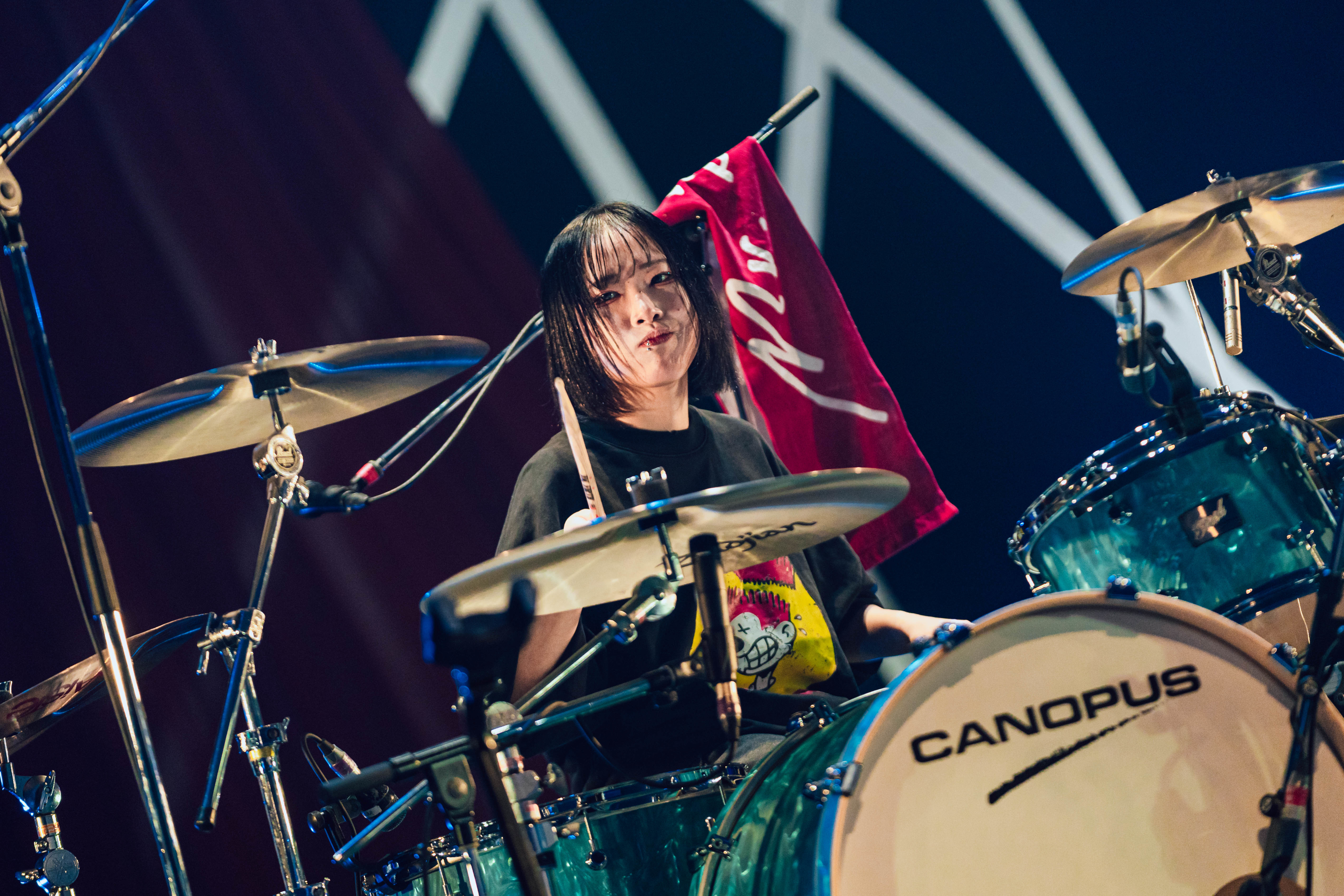 ここからさらに加速してラストスパート。「本日の正体」をど級のパワーで叩き込み、「大阪革命起こそうぜ! 全部出しきれ! 行くぞ大阪! 革命は起こりません」とお決まりのフリから「不革命前夜」へ。夕日の超絶テクと大樹の雷のようなビートが炸裂し、くぅが「歌ってー!」と煽ると客席はシンガロング。かほはとびきりの笑顔を見せ、くぅは崩れ落ちて床に寝転んでギターを弾く。ものすごい興奮と熱狂の中で曲を終えると、くぅが「ありがとう! 革命起こったぞ!!」と叫んだ。個人的に革命が起きたライブに居合わせたのは初めてだったので、いたく感動してしまった。