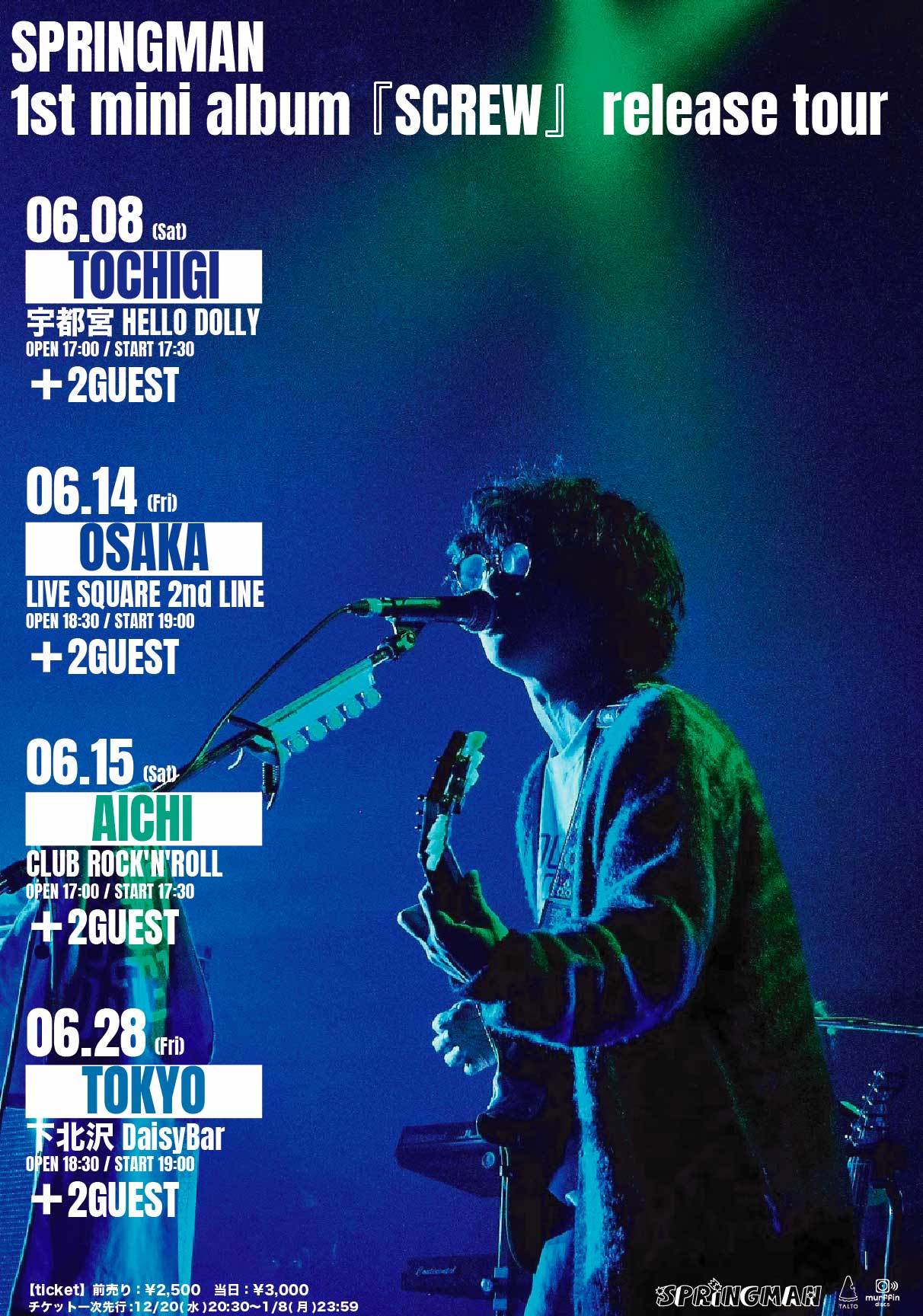 さらに、来年6月より『SPRINGMAN 1st mini album「SCREW」release tour』を開催することもあわせて発表された。6月8日(土)に荒川(Gt.Vo)の地元でもある栃木からスタートし、大阪・愛知を巡りツアーファイナルは6月28日(金)東京・下北沢Daisy Barにて開催される。全公演ゲストバンドを招いての開催となるので公式HPやSNSでの続報を要チェックだ。