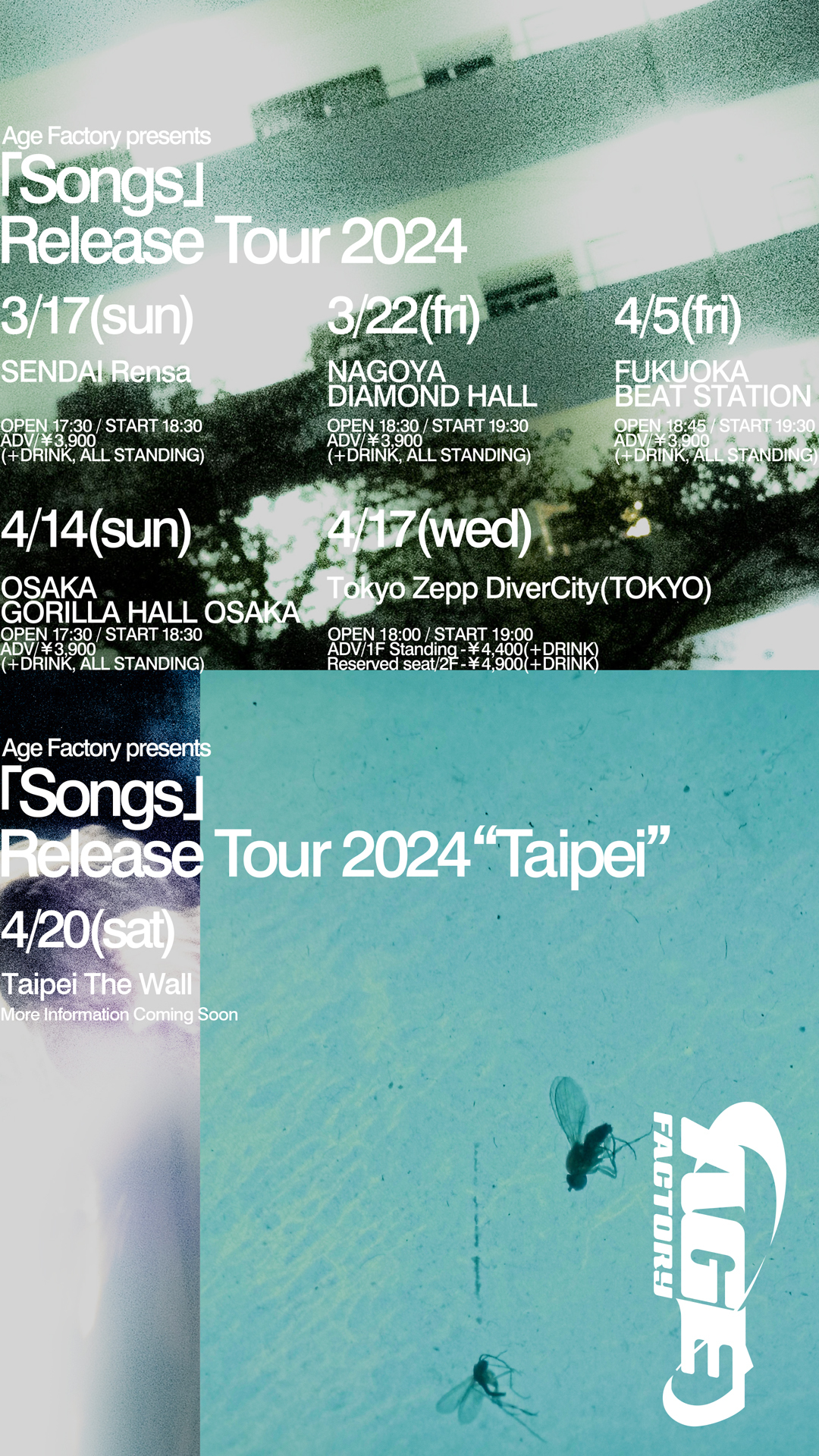 Age Factoryが2024年2月21日(水)に、先行配信曲を含めた10曲入りの5thアルバム『Songs』をリリースし、3月17日(日)から全国5カ所と台湾をめぐるワンマンツアー『Age Factory presents 「Songs」 Release Tour 2024』を開催すると発表した。