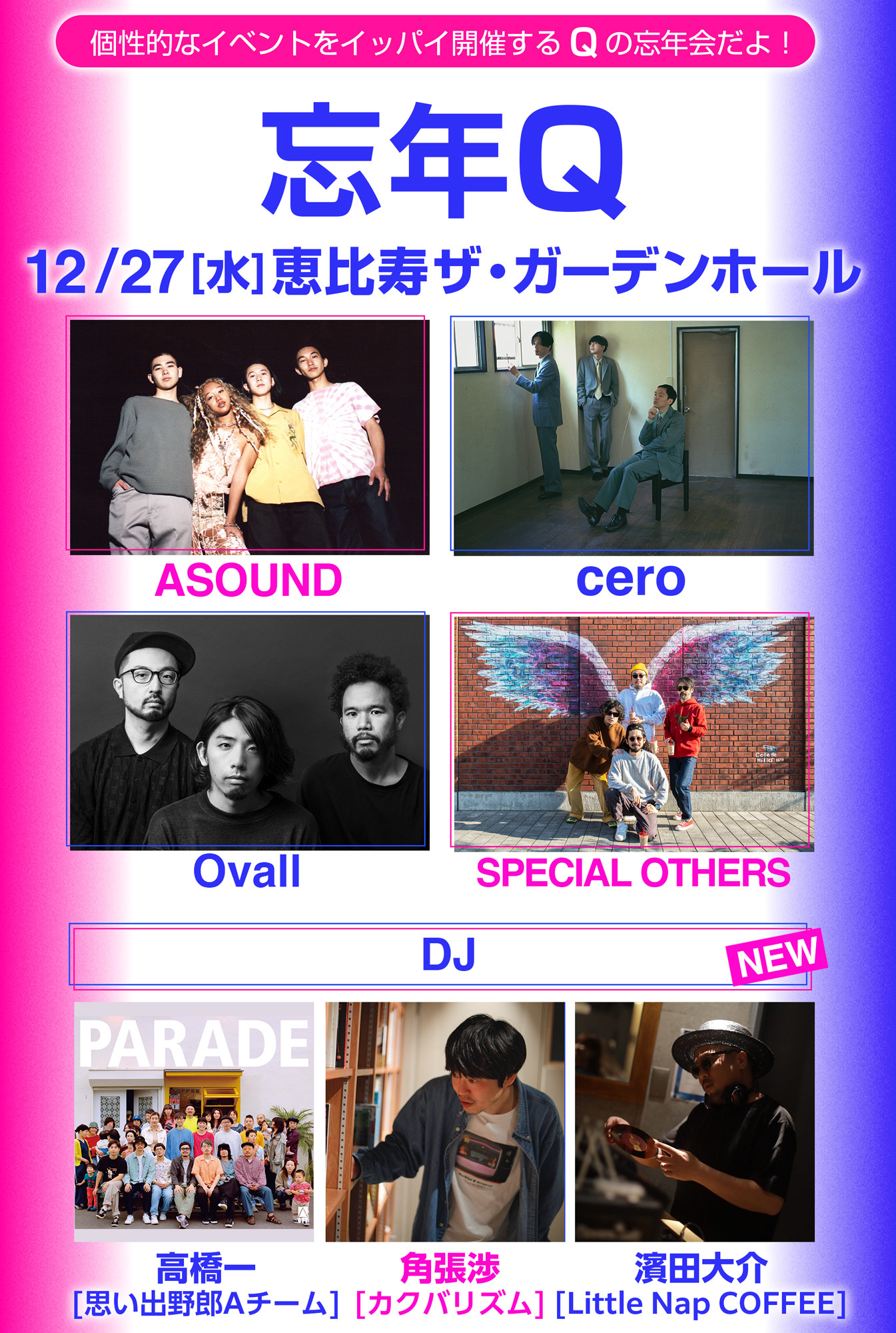 『Q(キュー)』は、2019年に神戸・ワールド記念ホールと東京・両国国技館で初開催されたインドア・フェス。コロナ禍以降、近年は弾き語り形式の回遊イベント『BABY Q』を全国各地で実施されてきたが、今年は4年ぶりに『忘年Q』として年末イベントを復活させる。今回はASOUND、cero、Ovall、SPECIAL OTHERSの4組が出演する。