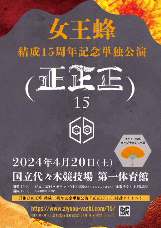タイトルは『女王蜂 結成15周年記念単独公演 「正正正(15)」』。本日・12月25日(月)より、公式ファンクラブ「CLUB OF qb」にてファンクラブ先行チケットの受付も開始となった。