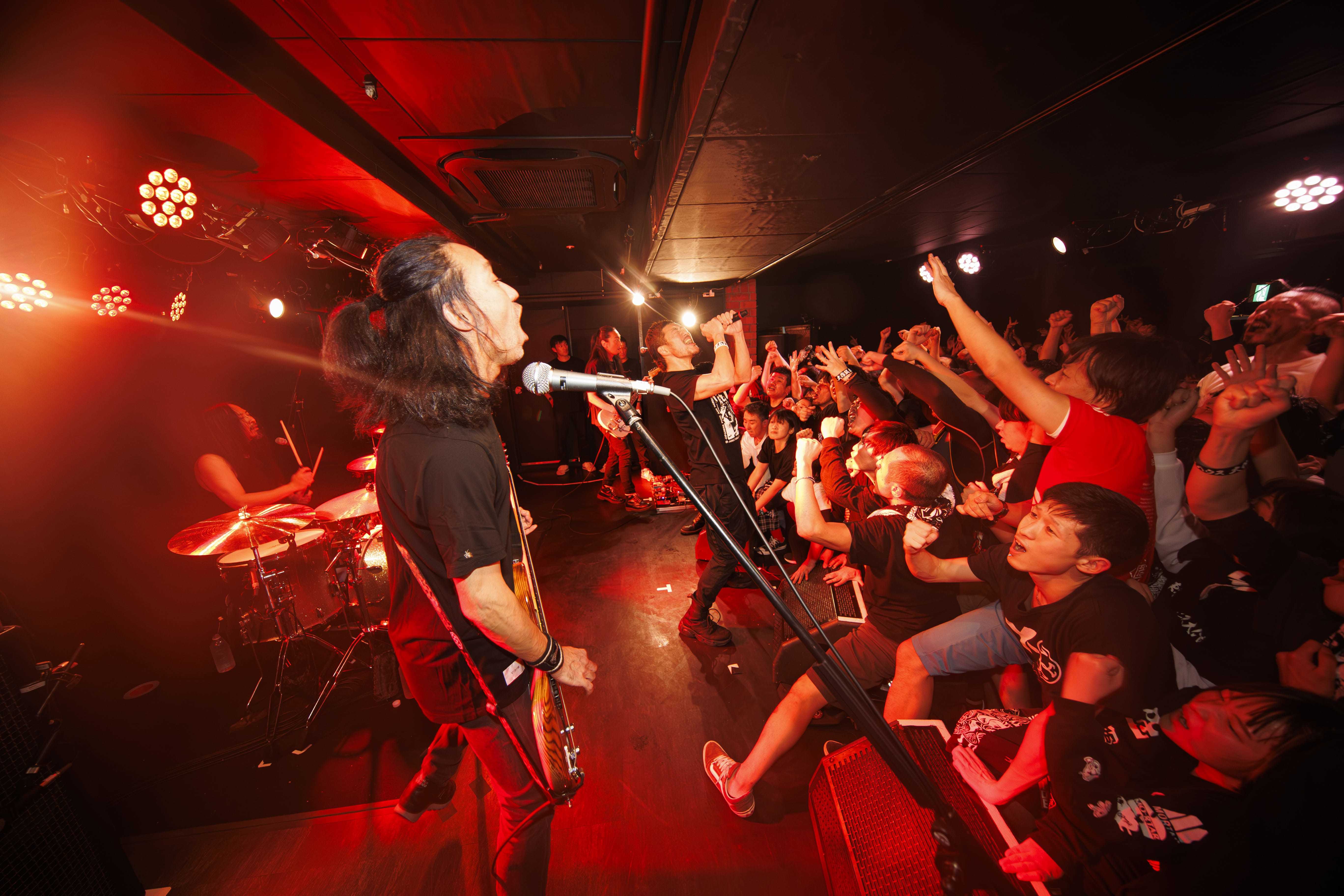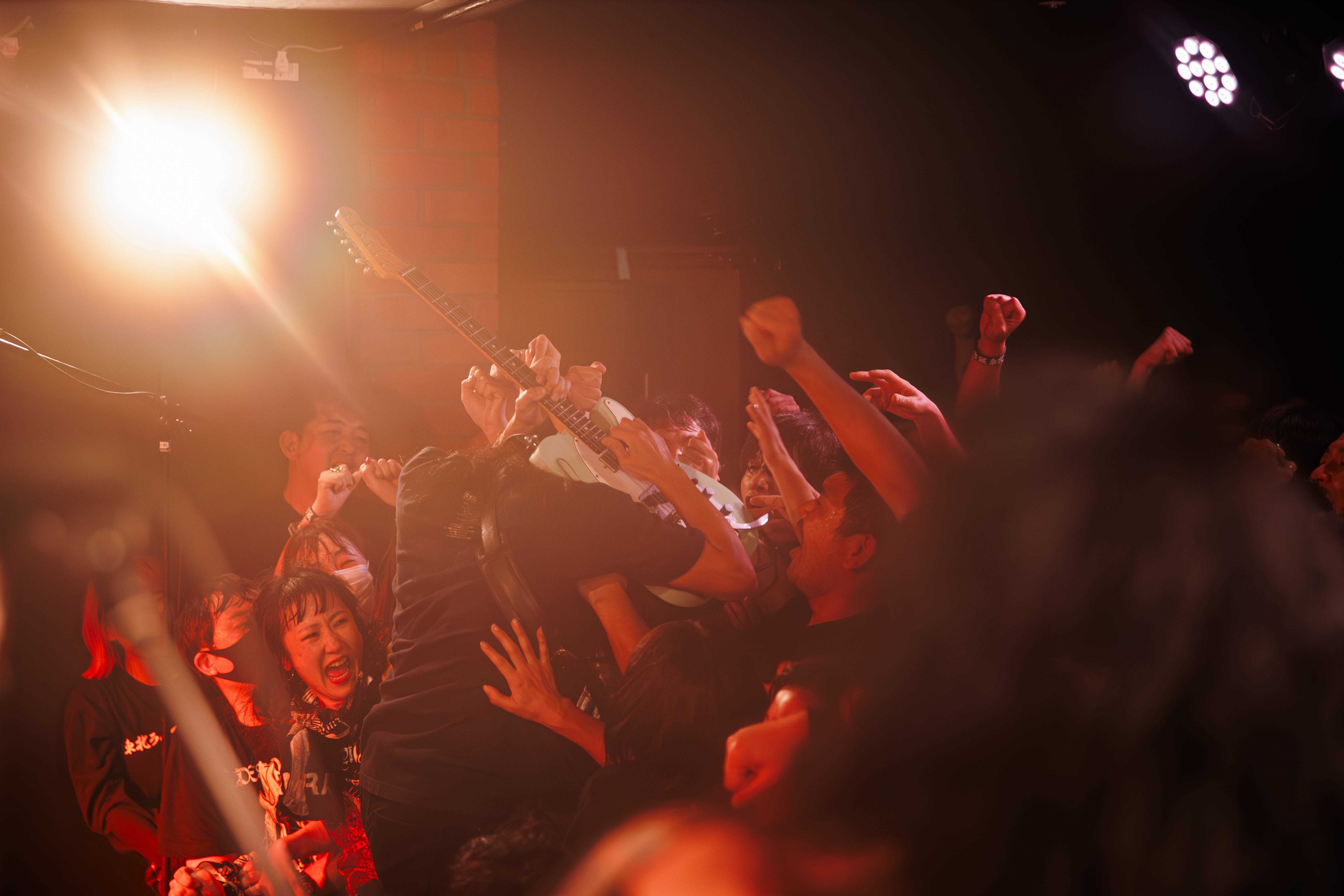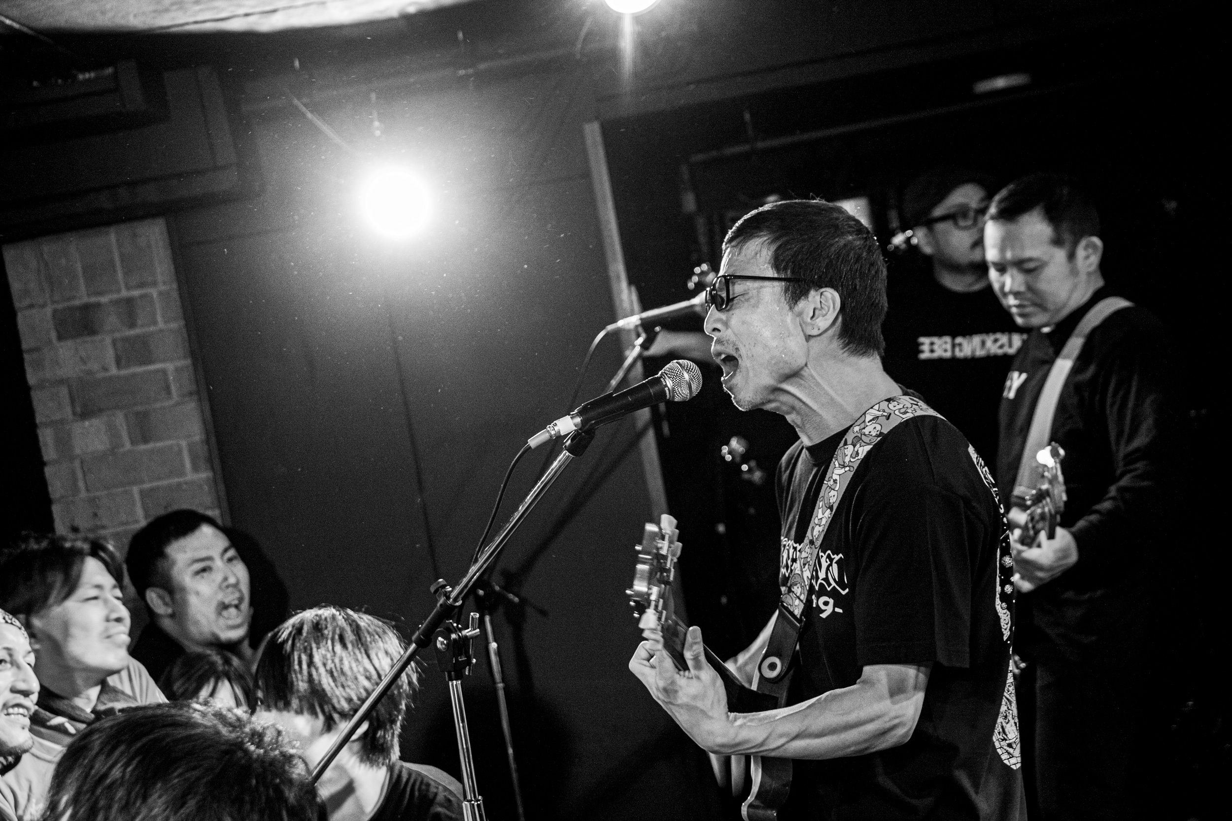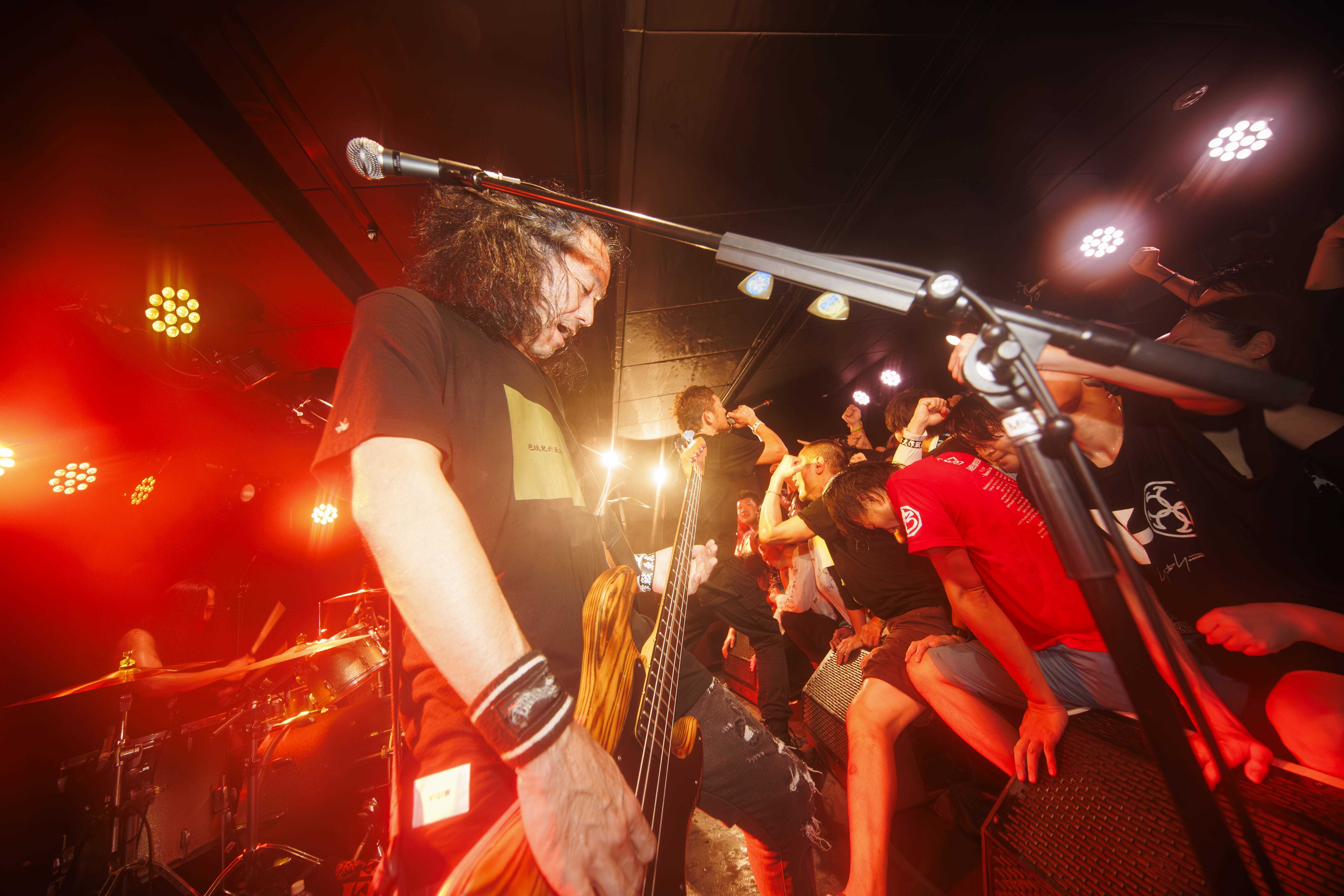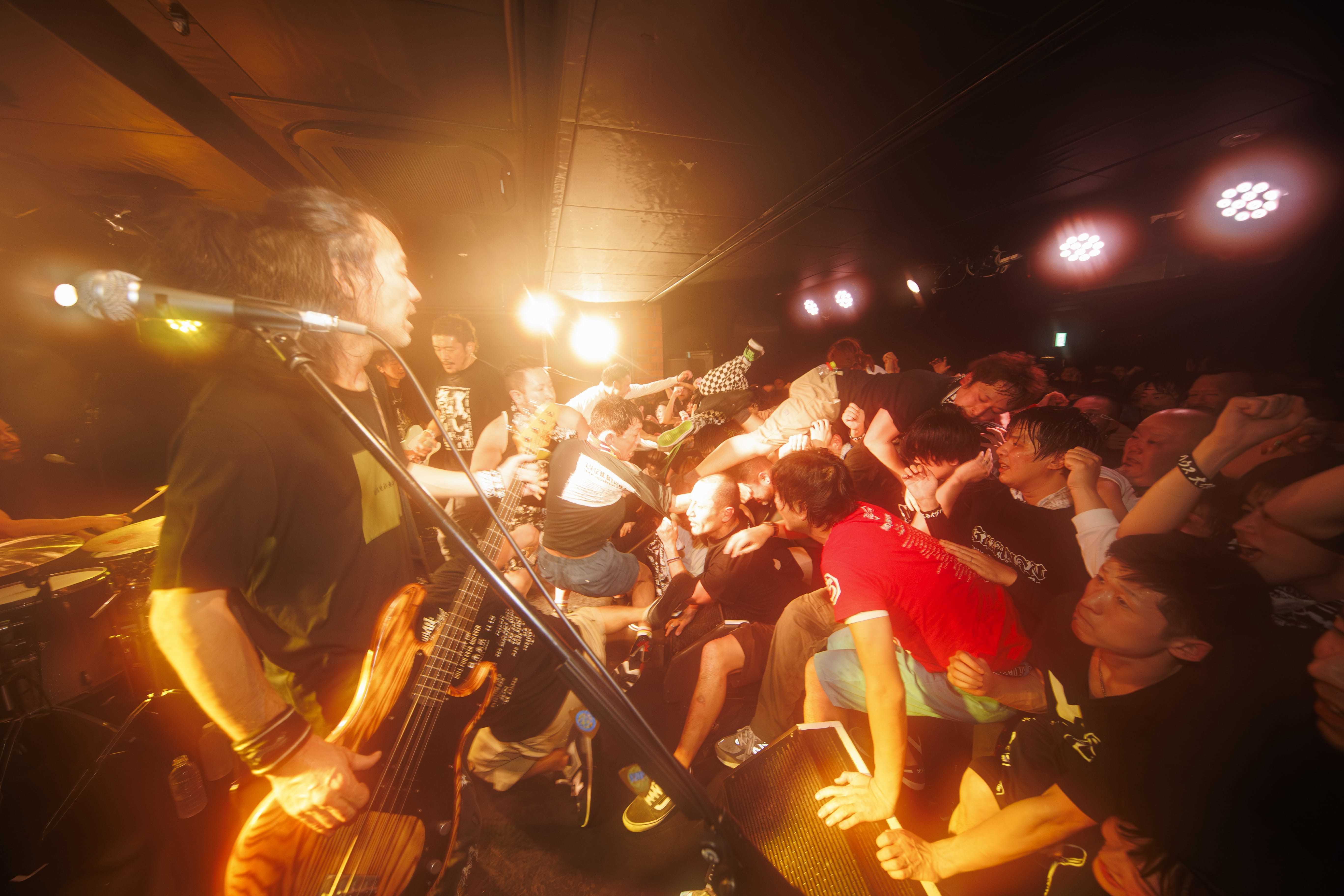 ボリビアのバンドSEMILLAのカバー「MIS 16」を聴いたのはいつぶりか。敬愛するニューキー・パイクスのカバー「LET’S GET ANOTHER PLACE」から初期曲「ARTMAN」で締めるラストなど、もうレアすぎて奇声が出てしまう。ただ、ポカンと置いていかれる客がほぼ皆無なのがもっと貴重でよかった。全曲で迷いのないコーラスが起こり、絶え間なくダイバーが湧き続ける。客席とステージを隔てる柵もない会場、下手にステージに落ちてしまえば演奏の邪魔になる。それを理解しながら、ギリギリの空間を使いながら絶妙のクラウドサーフを決めていく中年たちの素晴らしき身体能力よ。これぞ長年のプロファンと言いたい動きが、フロアのあちこちで起きているのだった。