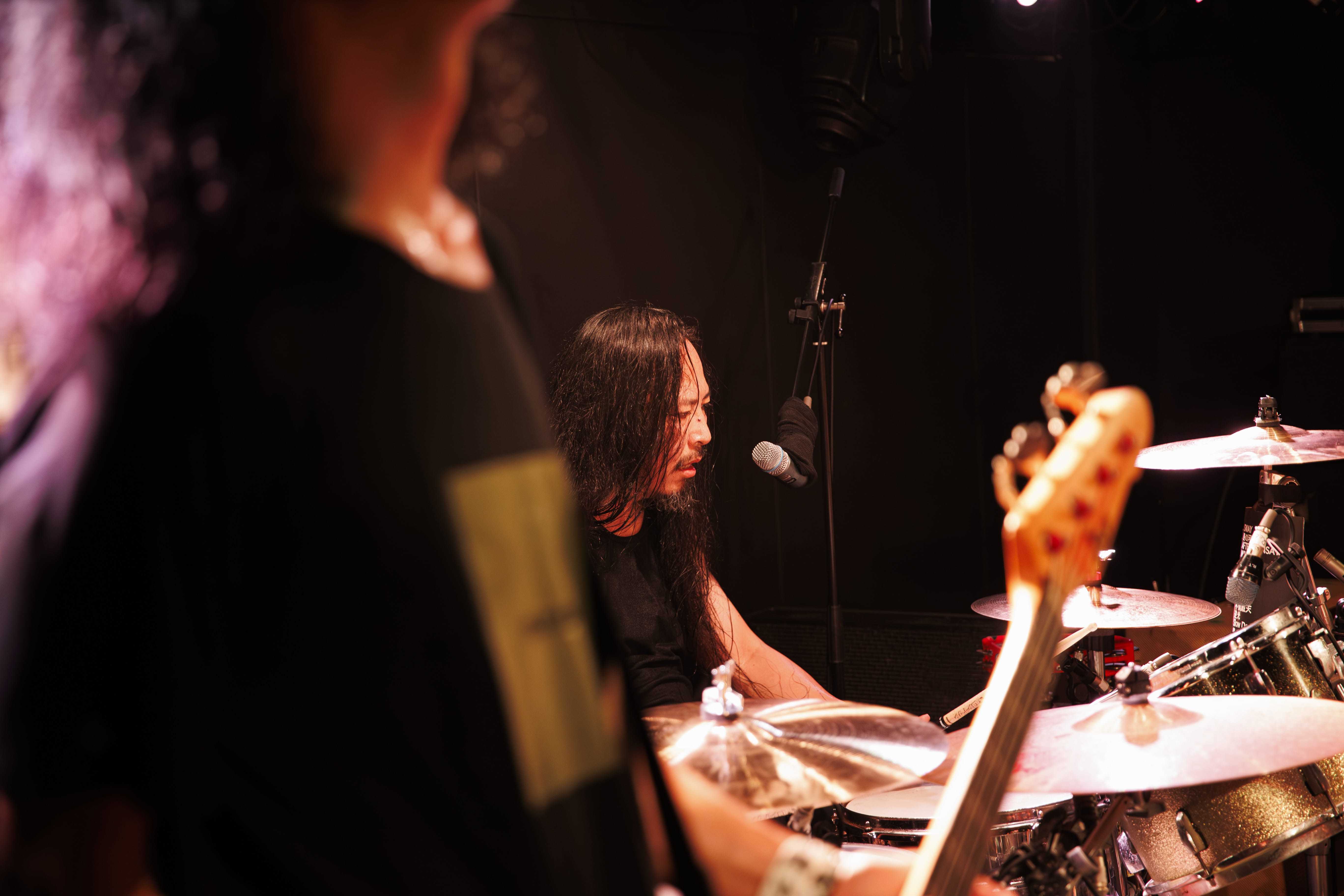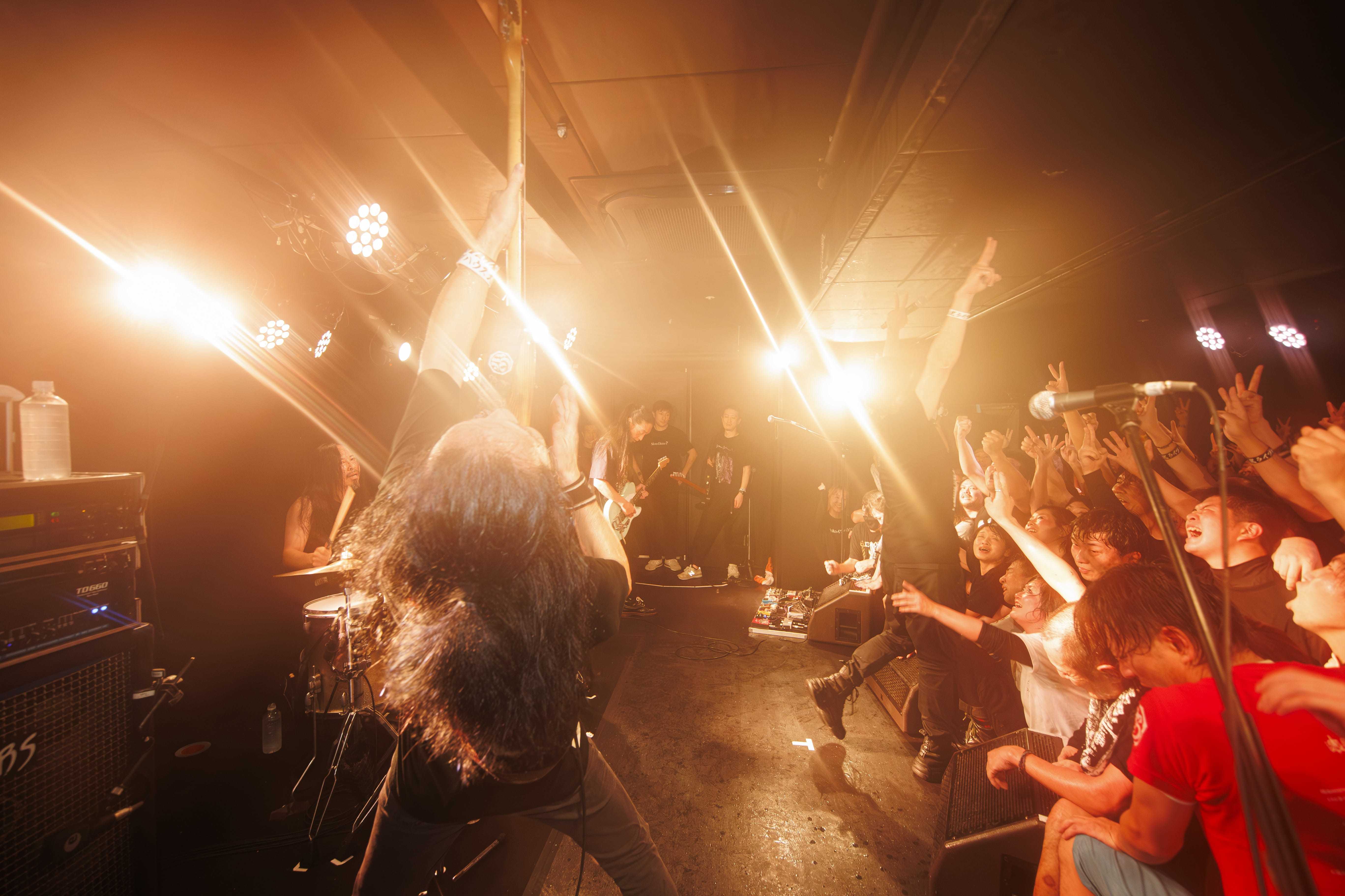 その景色が見えているのかいないのか、メンバーは酸欠気味のステージで一心不乱に演奏を続ける。ただし危うさや乱れは感じられず、さらに中盤、「不倶戴天」では、KOHKI(Gt)が高々と持ち上げたギターを頭上に乗せ、大胆にギターソロをぶちかますシーンもあった。ステージの低い会場、客席からステージ全体が見えにくい会場で、たまに披露するパフォーマンスなのだとか。毎回を全力でやりきる、だけでなく、ちゃんと魅せることを忘れていない。ファンはもちろん、バンドこそが熟達のプロフェッショナルである。