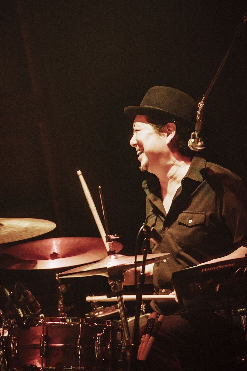 出だしのアカペラ部分をいつも以上に説得力を持たせて聴かせた「Tumblin’」でムードを変え、次の「Route246」ではメンバー3人にもっと我を出せとばかりにギターで絡んでいくRei。「アーオッ」というシャウトの出力もいつにも増して凄まじい。メンバー紹介を挿んで、新曲のポップな歌もの「Sunflower」。続く「COCOA」と「What Do You Want?」では三浦と吉田のリズムが強度を増し、Reiは完全に自己解放した様子でステージ中央に躍り出て激しく弾き倒した。その場の温度変化に左右されずに熱いビートを叩き続ける吉田、佇まいのクールさに対して情熱が零れ出る三浦、メンバーと客に対する信頼の上で小さなカラダを大きく躍動させるRei。ライブはいよいよ異種格闘技の様相を呈しもしたのだが、しかしそれを柔軟に繋いでいたのがTAIHEIだ。過去の『JAM! JAM! JAM!』でも感じたことだが、彼の場の読み力と臨機応変な対応力はたいしたもので、どんなにクセの強いミュージシャンが参加しようが彼さえいればまとまりがつくだろうと、そう思える。