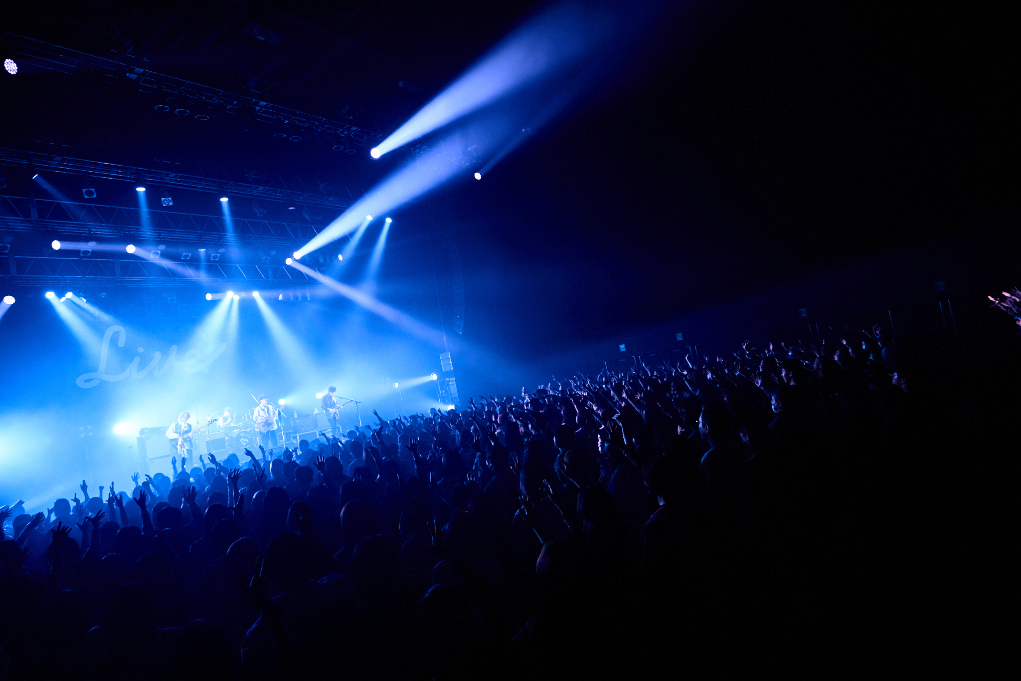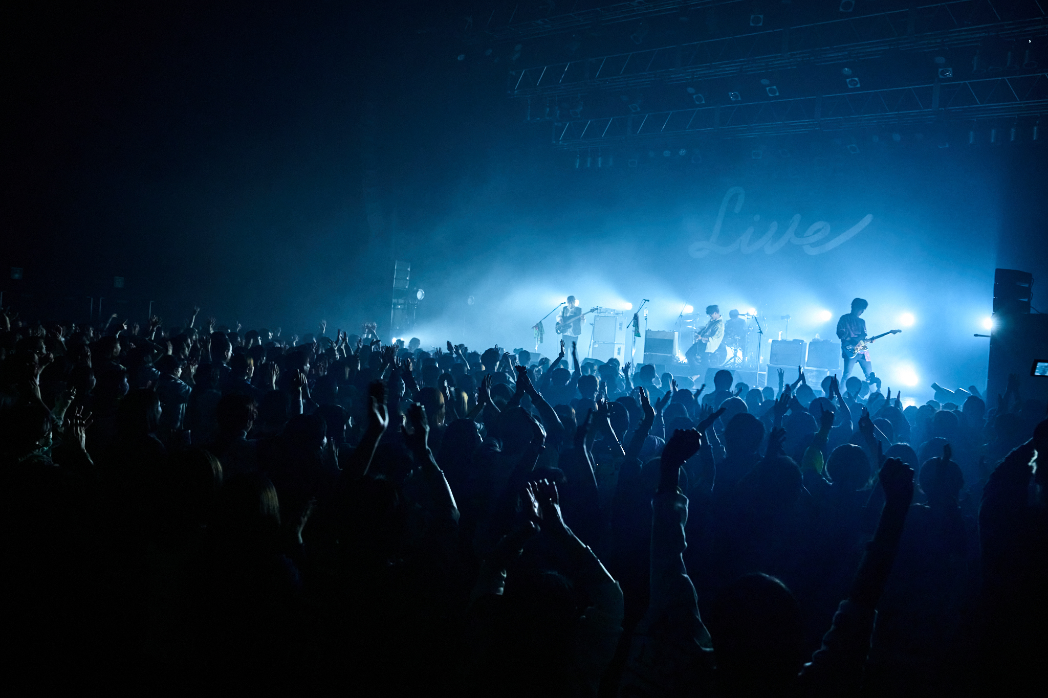 SEに合わせて観客が手拍子を始めると、ステージにPON(Vocal・Guitar)、ikoma(Guitar・Chorus) 、たく(Bass)、LOVE大石(Drums)が登場。彼らが煽ると、開演を待ちわびていた人々の歓声と手拍子が一際高まる。そしてPONがギターを弾きながら歌い始めた1曲目は「Hand」。メンバーたちの演奏が合流して構築されたアンサンブルが会場を震わせる様が心地よかった。続いて「ブレイバー」と「初めの一歩」も届けられたが、躍動する歌と演奏が観客の胸の高鳴りとシンクロしているのを肌で感じた。「楽しんで幸せになって帰ろう! あなたの心に刺さって抜けない歌を歌いにやってまいりました!」とPONが言い、「サニーデイ」に突入すると、穏やかな昂揚感で完全に満たされたZepp DiverCity。「幸せであれ」「あんたが大将」「リフレイン」も披露された頃には、共に同じ空間で過ごすことをステージ上の4人と観客が心から喜び合っていた。