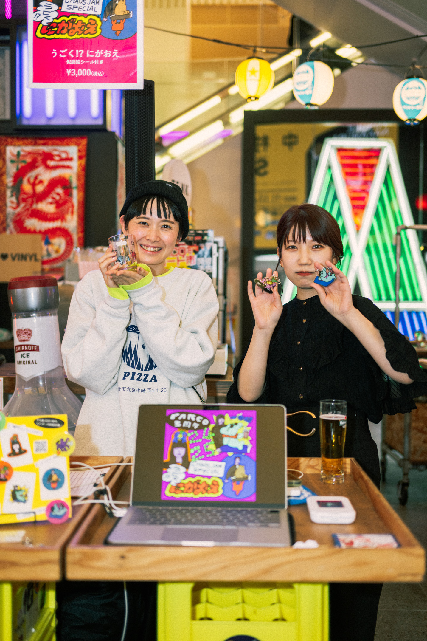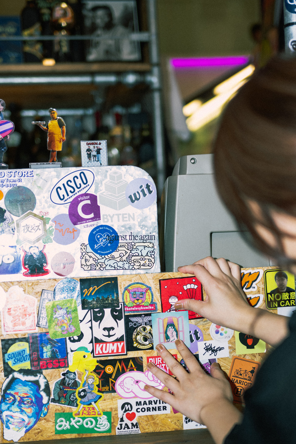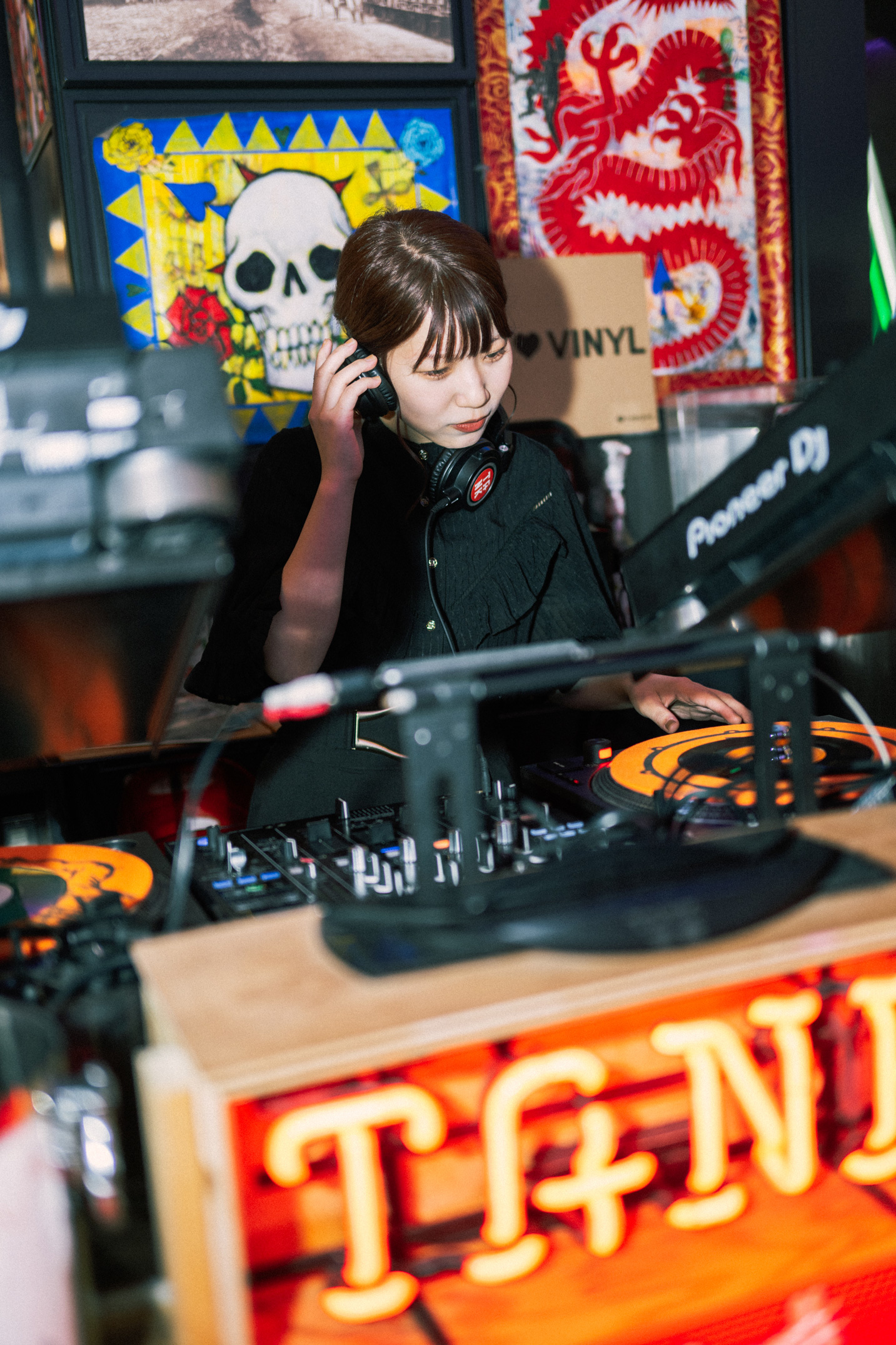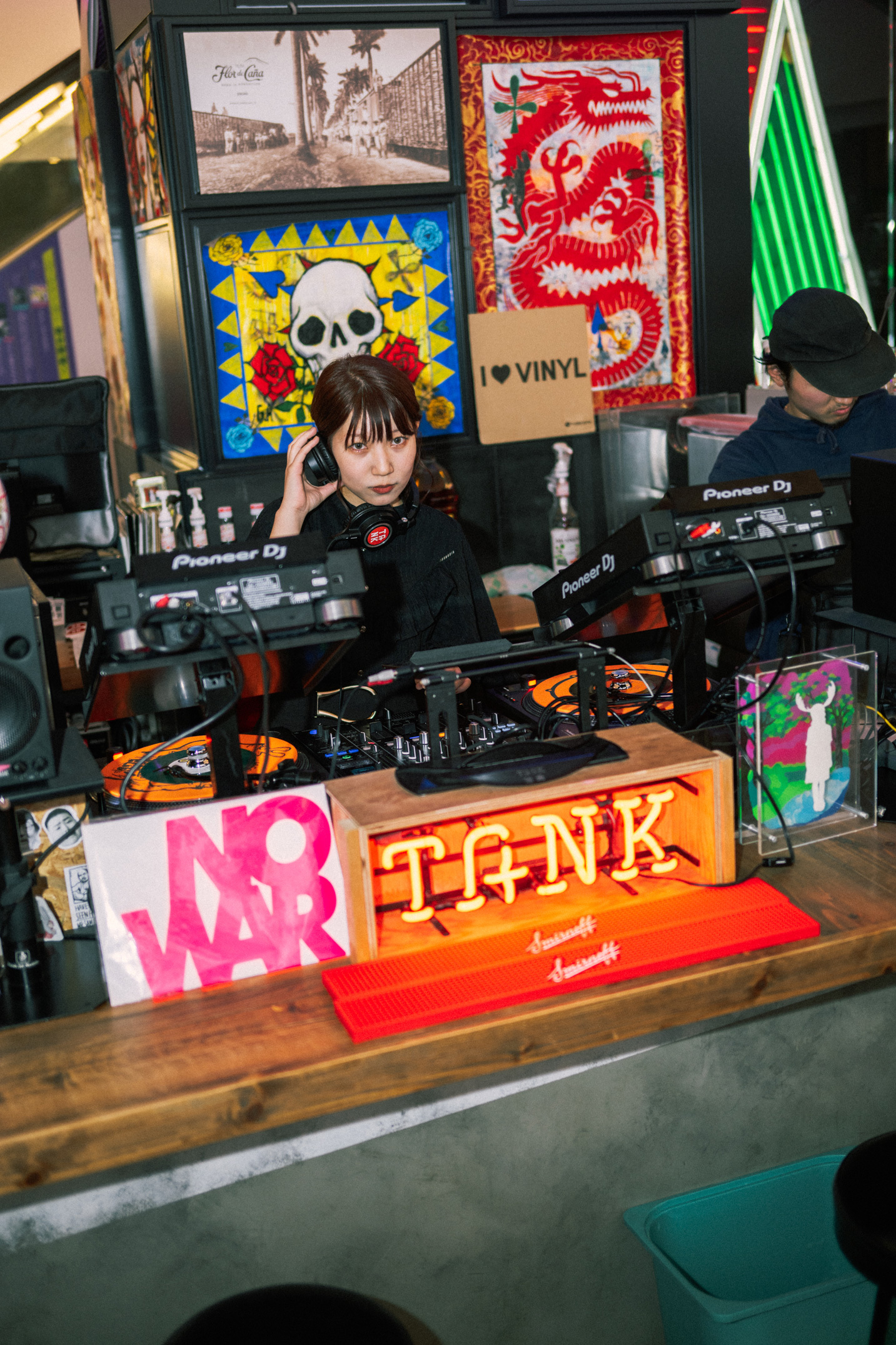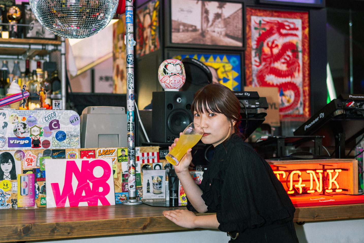 最後は『心斎橋ネオン食堂街』の中心にある「TANK酒場」へ。カルチャーの発信基地として連日DJイベントなどが行われているスタンディングバーで、その盛り上がりっぷりをSNSで見ていたMikanにとっては憧れの場所だったそう。せっかくなので、お酒を飲みながら、マスターの古谷氏にお願いして、記念にバンドのステッカーを貼らせてもらったりDJも体験! PARCOをクルーズしながら、心斎橋の夜をどっぷりと楽しんだ様子。