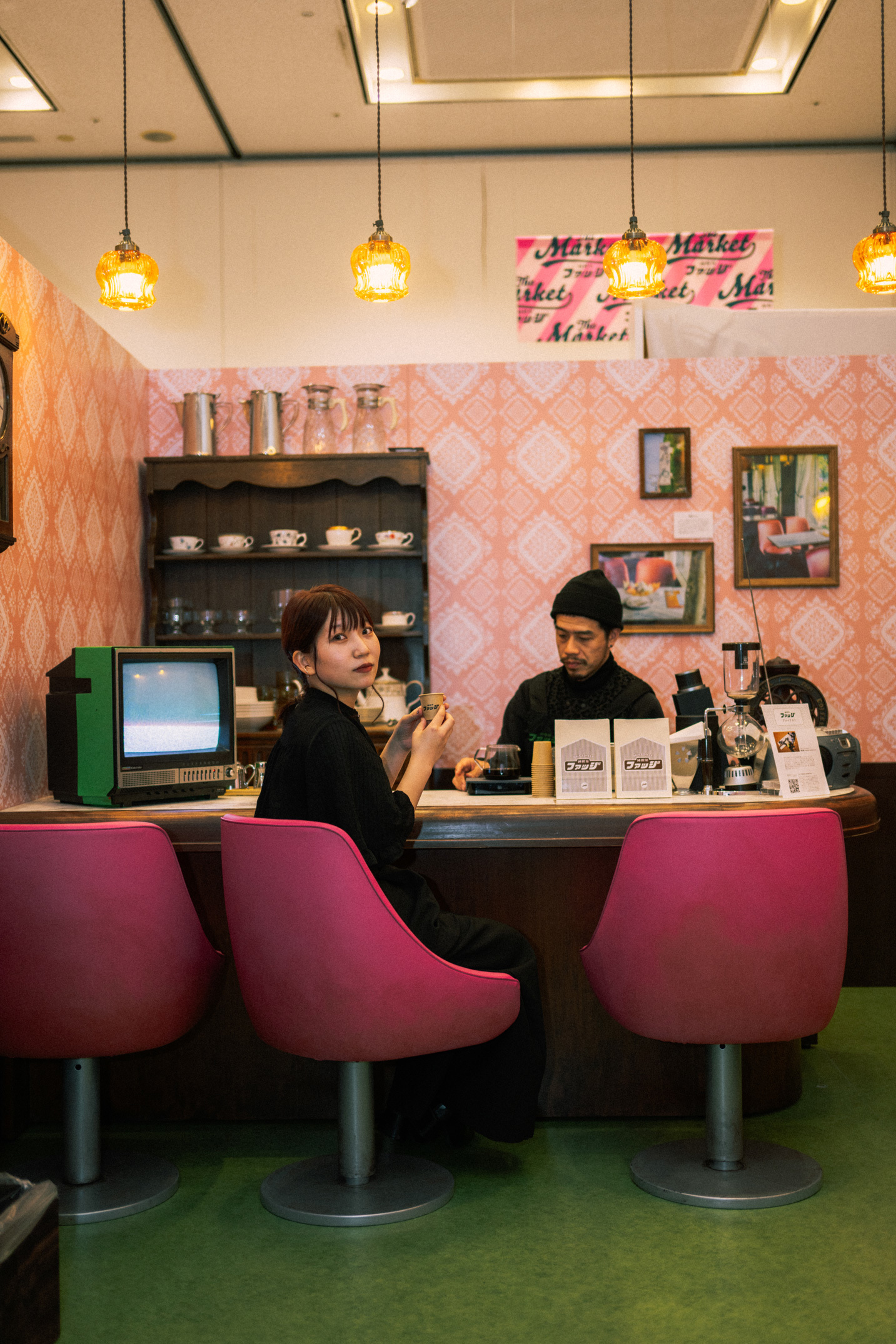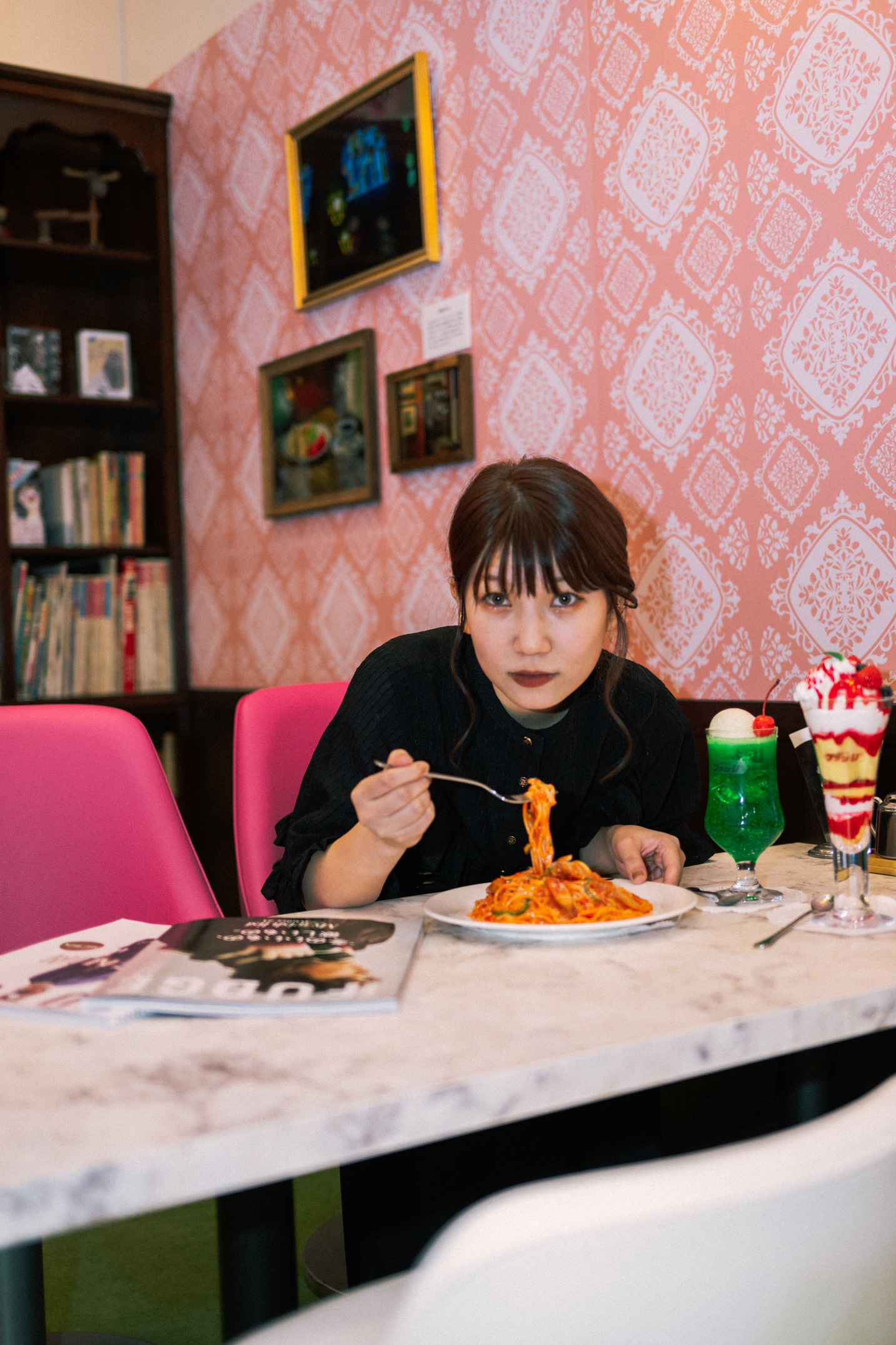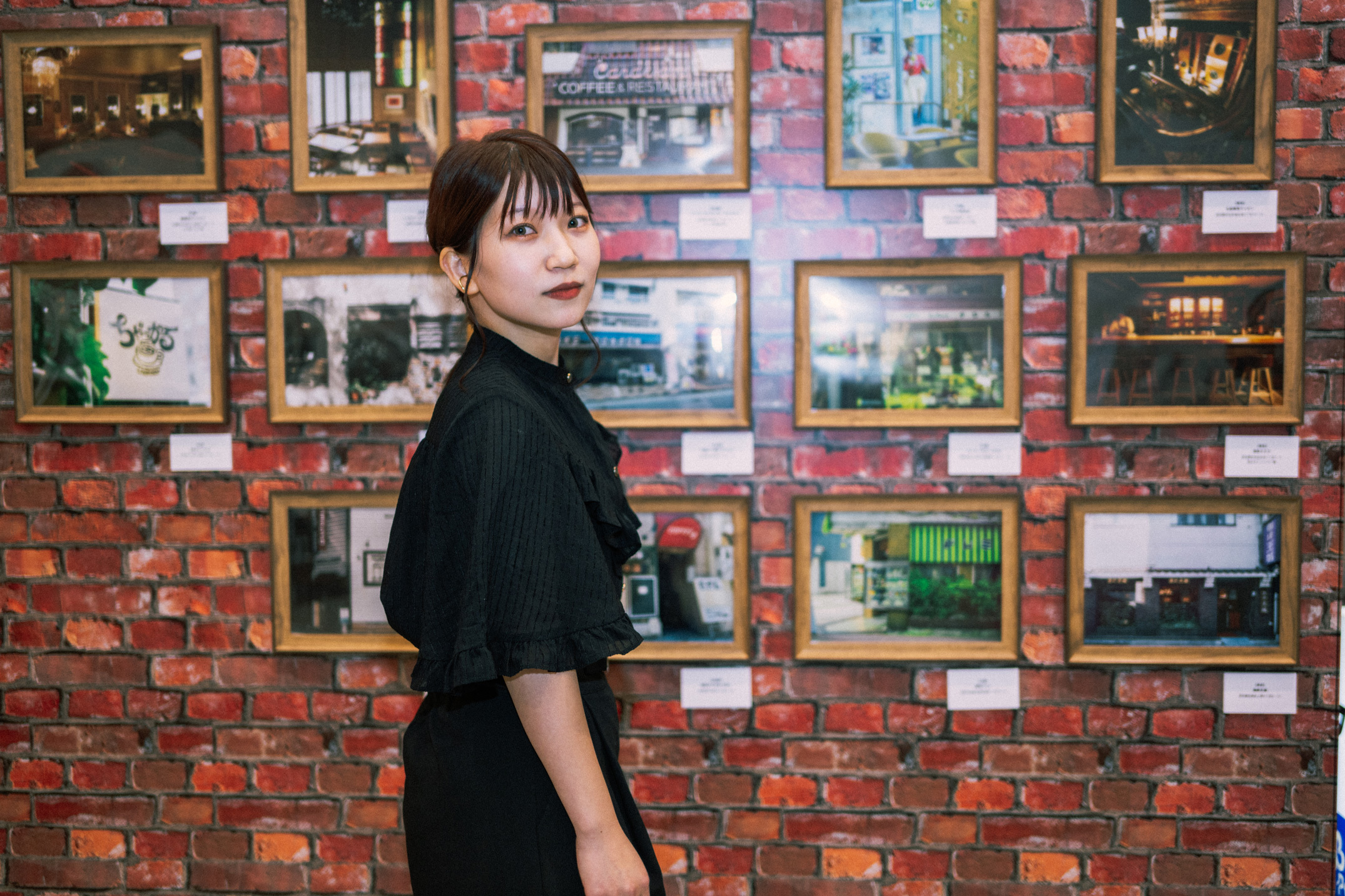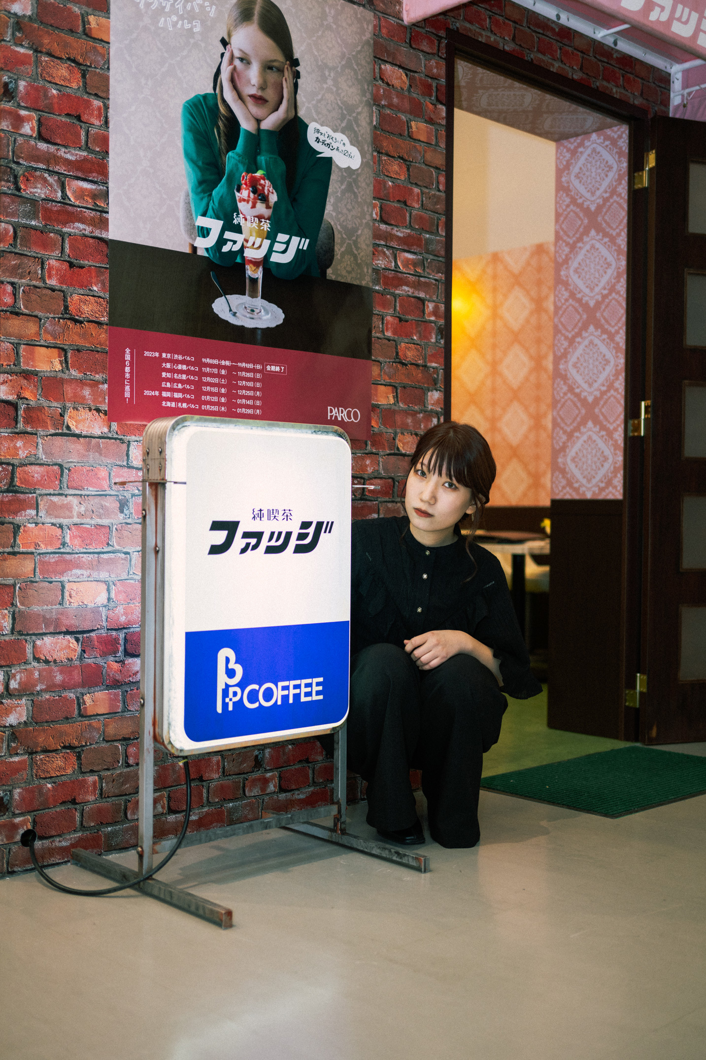 喫茶店を模したフォトブースでは、机に並べられたクリームソーダやナポリタンなど定番メニューのサンプルと記念撮影するMikan。日本のカルチャーが大好きで、音楽やお笑いだけでなく、レトロな純喫茶にも詳しく、展示されている名物喫茶の写真を指差しては「ここも行ったことあります!」とテンションアップ。「台湾にも古いお店はあるけれど、こうやってひとつの文化になるぐらい変わらず今も残っていて、レトロなままずっと愛されているところがすごいです!」と台湾との違いについても話してくれた。
