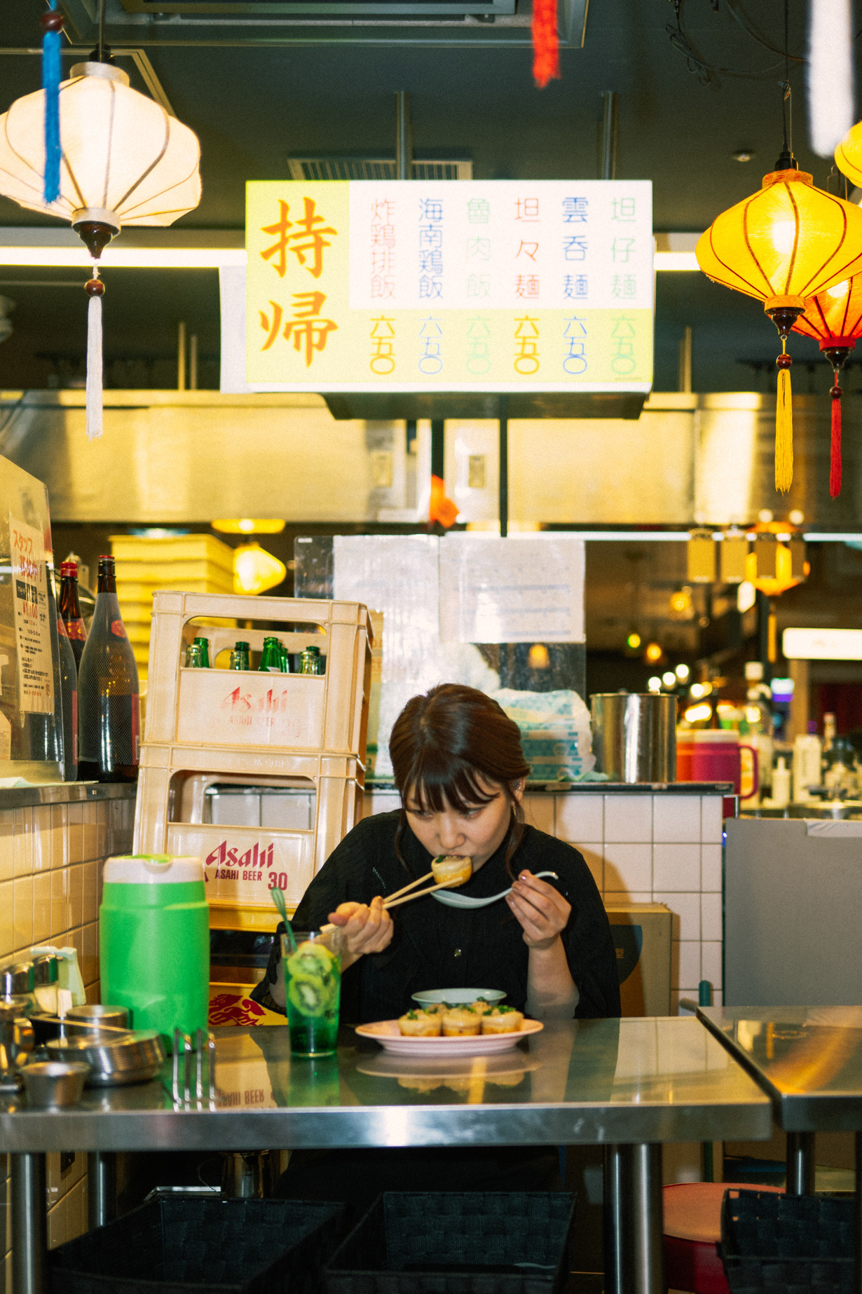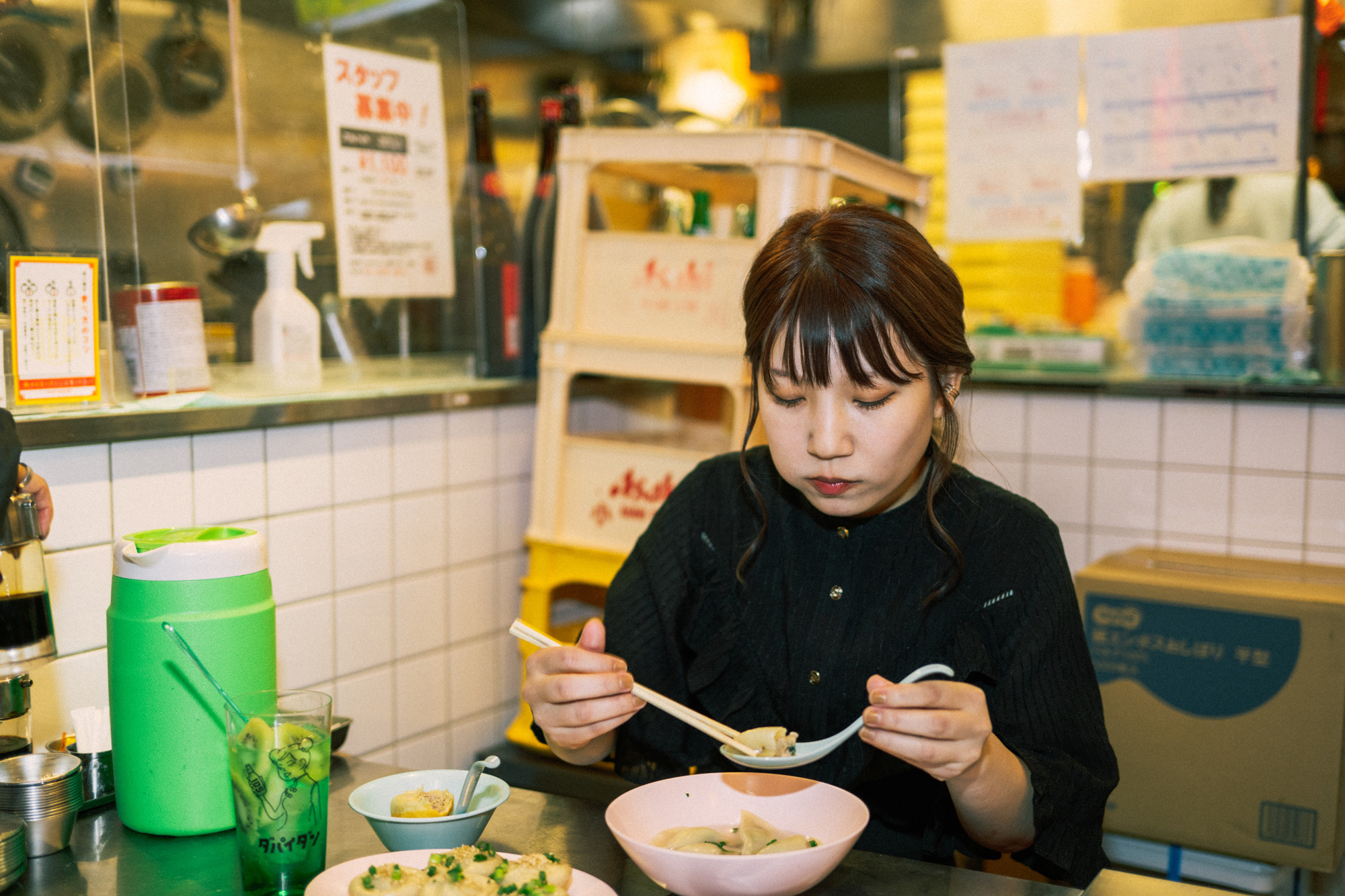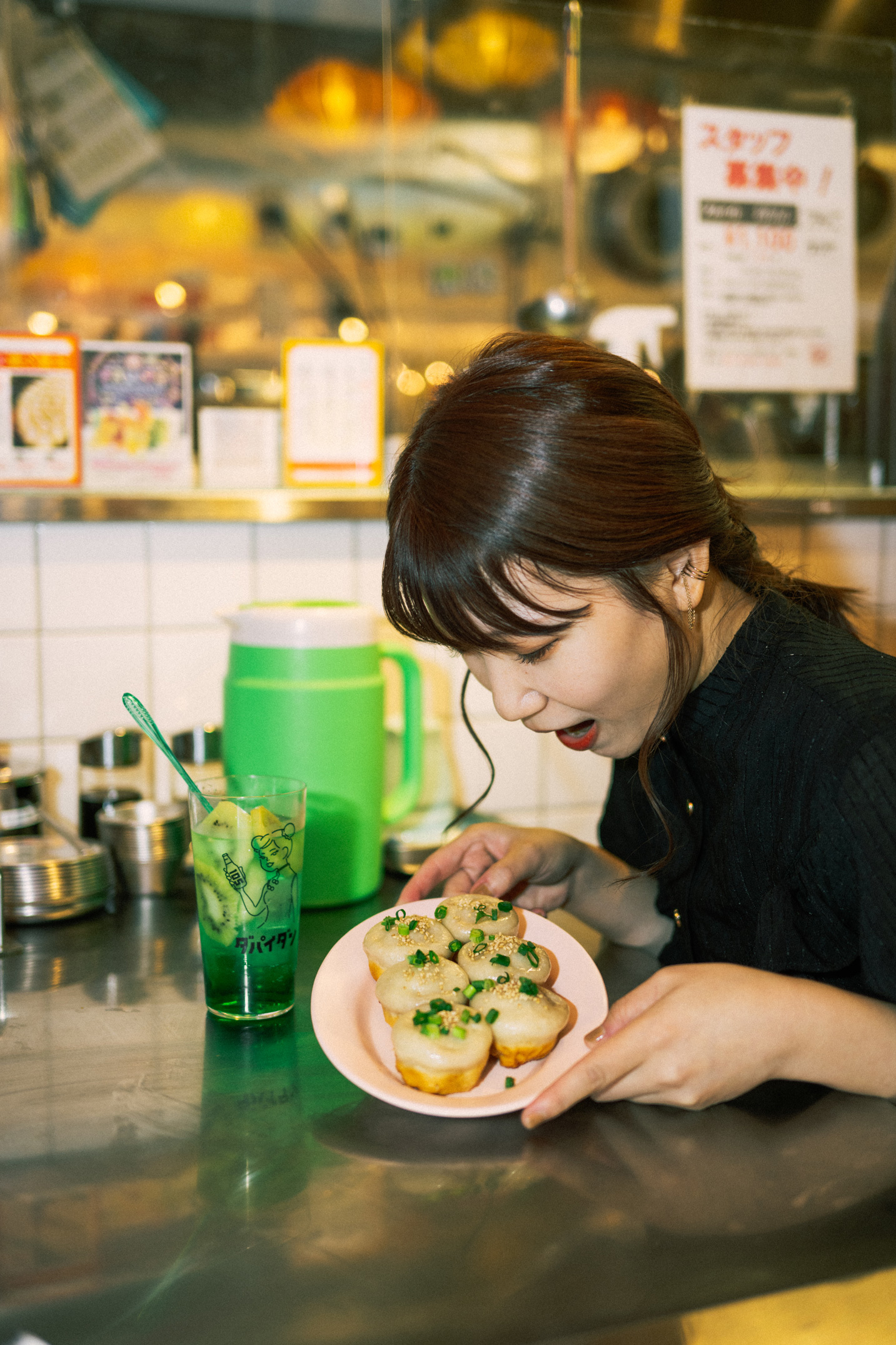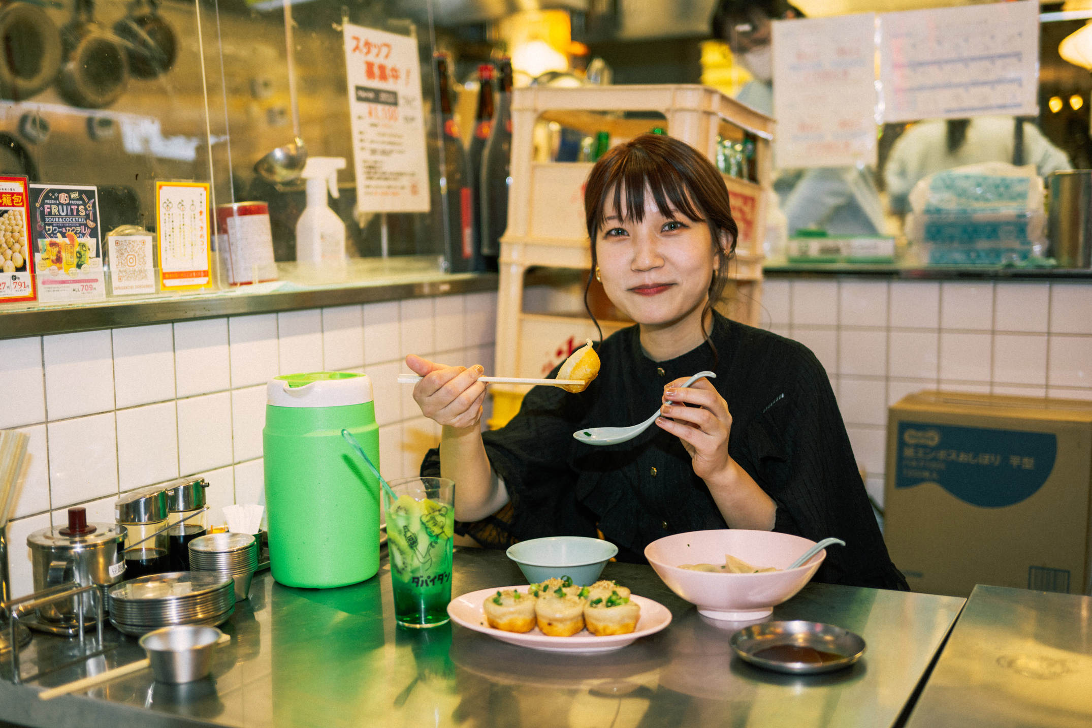 そのまま地下2階の飲食フロア『心斎橋ネオン食堂街』に移動して、本格点心と台湾料理が味わえる「da pai dang 105」へ。キウイ&フルーツカクテルと焼き小籠包、水餃子をオーダーして舌鼓。「地元で食べる味と似ていておいしい! お店の雰囲気は、台湾より台湾でかわいいですね!」と笑顔を見せる。水餃子は冷蔵庫にストックしていて、いつでも食べられるようにしているぐらい大好物なんだとか。