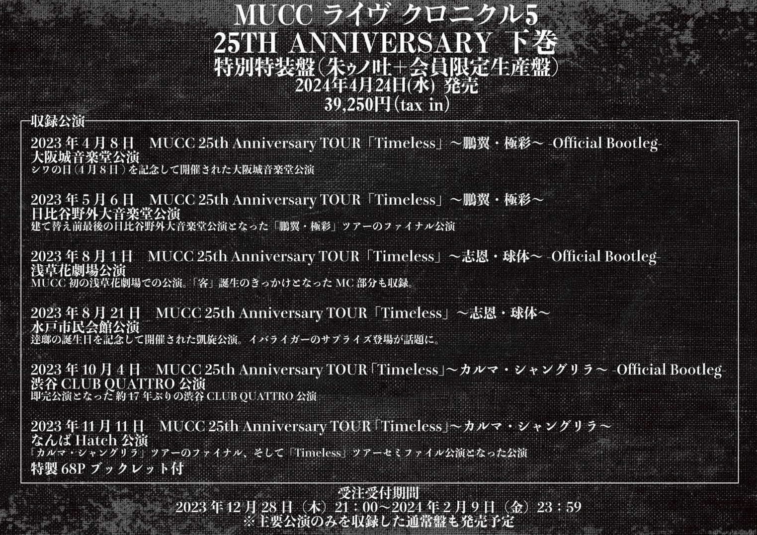 また、25周年イヤーに開催された主要公演をまとめた映像作品『MUCC ライヴ クロニクル5 25TH ANNIVERSARY 下巻』の発売も決定した。2024年4月24日(水)発売のこの作品は、『Timeless』ツアーの「~鵬翼・極彩~」「~志恩・球体~」「~カルマ・シャングリラ~」から各2公演ずつ収録される。「特別特装盤」の受注受付は、本日12月28日(木)21:00から朱ゥノ吐+会員限定で開始されている。「通常盤」の発売も決定しており、詳細は後日発表となる。