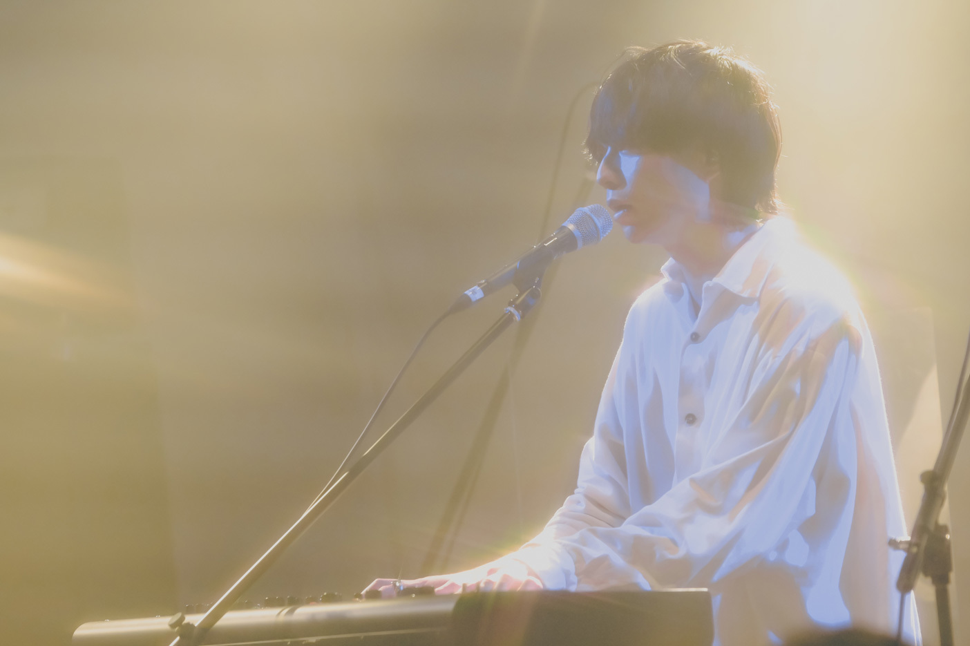 そしていよいよ開演時間。BGMが止み、メンバーが1人ずつ白い衣装で登場。武市が「mol-74です。よろしくお願いします」と挨拶して音を出そうとするも、何かトラブルがあったようで「時を戻していいですか(笑)」と仕切り直し。少し空気がほぐれた会場に「グレイッシュ」を響かせる。柔らかなサウンドに武市のハイトーンボイスが美しく溶けてゆく。演奏の高まりに合わせ、最初は暗めの白と青だった照明が、ゆらぎを伴った白く明るい照明に変化した時は、早くも没入しそうな感覚に襲われた。