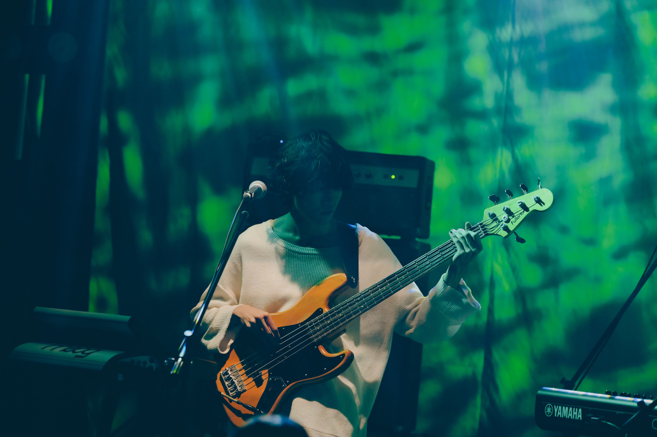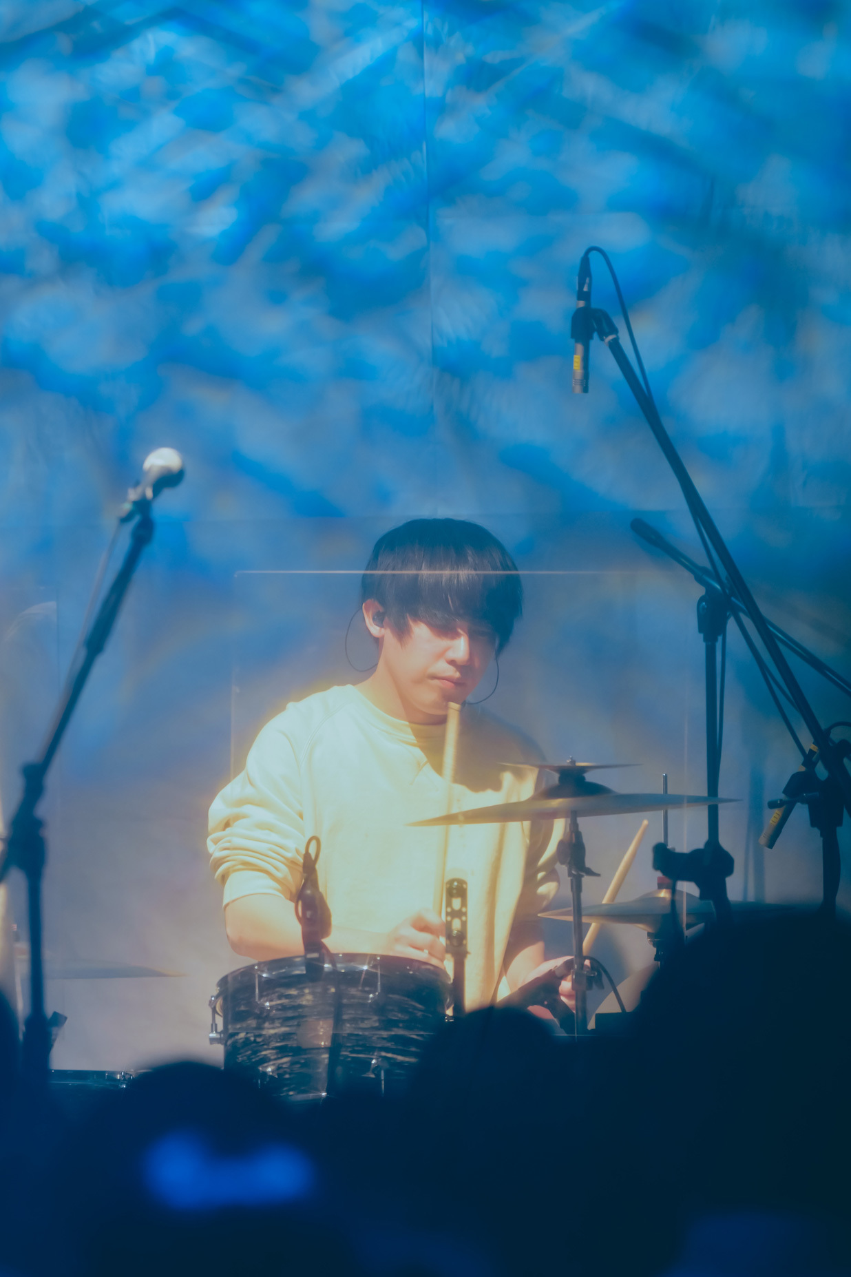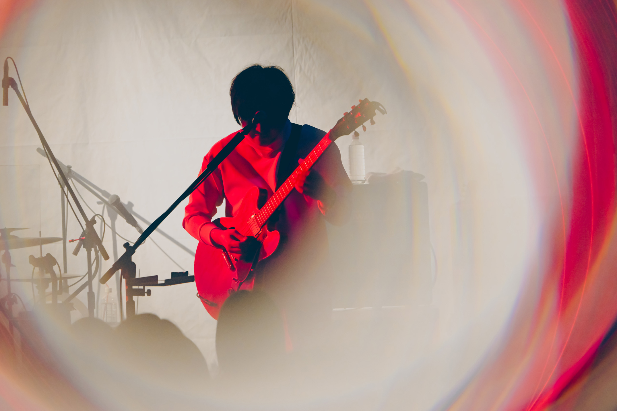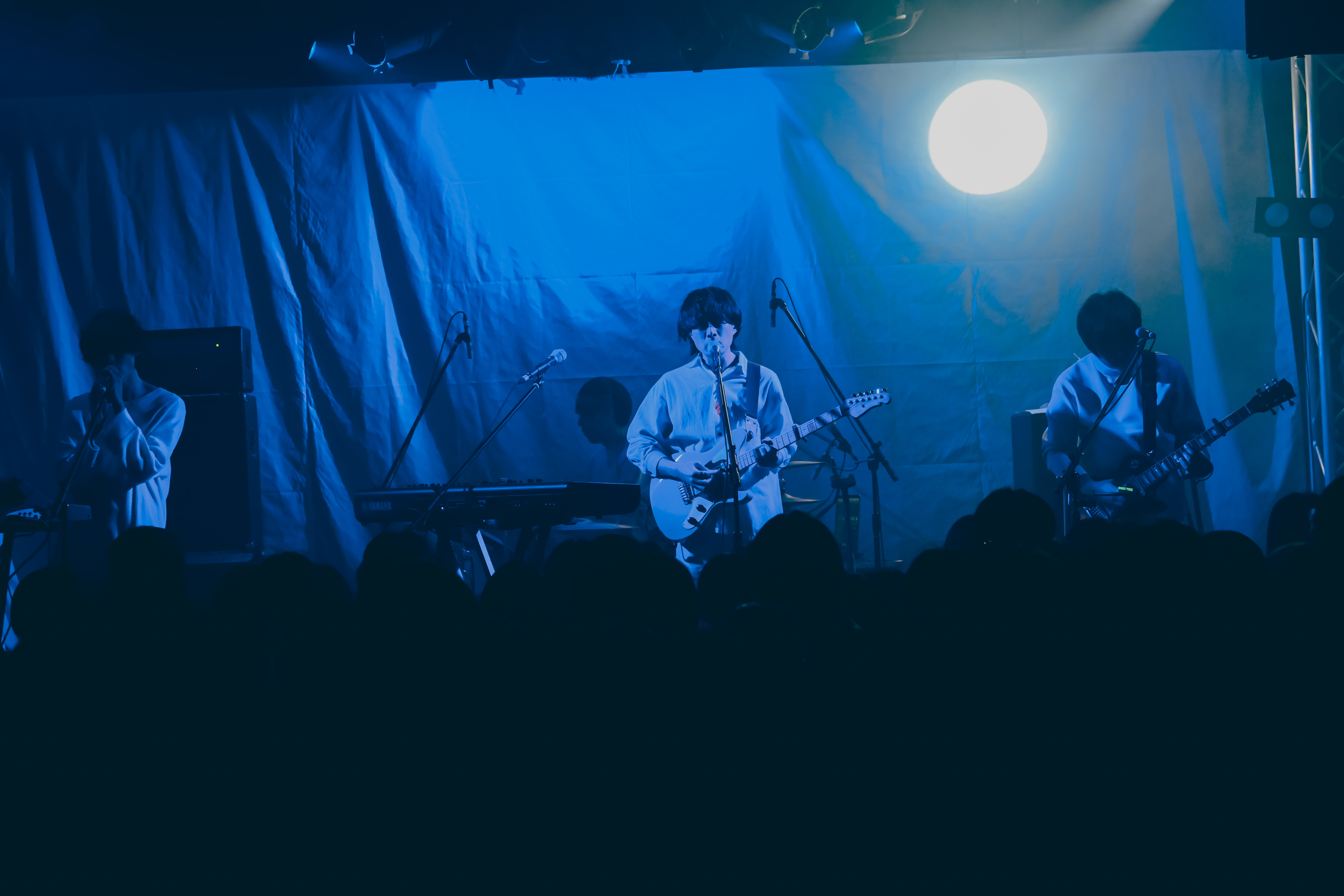長めの静寂を経て、ステージの右上に満月のような丸い光が浮かび、新曲の「Mooner」を披露。以前から知っているような懐かしさのあるメロディラインに浸っていると、井上がボウイング奏法で圧倒的な残響を作り出す。一瞬奪われた思考が戻ってきた時、フロアも自分の着ていた白い服も、純度の高い青色に染められていることに気が付いた。