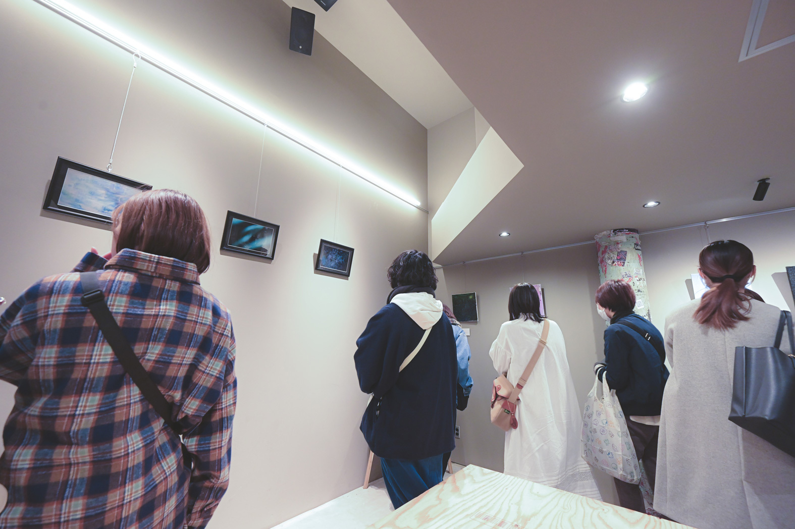 武市和希(Vo.Gt.Key)の作品は、デジタルイラストレーションをキャンバスにプリントしたもの。対比する夜と朝の風景が美しく、どちらもシングルのジャケットに使用されている。井上雄斗(Gt.Cho)が作ったのはレジンアート。6cmの正方形のキューブに閉じ込められた「Mooner」をイメージした月と、「寝顔」をイメージした朝焼けと電線(使用済のギターの弦だそう)がライトアップされ、幻想的な雰囲気を醸し出す。髙橋涼馬(Ba.Cho)は趣味のカメラで撮影した写真作品。多重露光技法を用いた4枚で、2曲の世界観を表現した。そして坂東志洋(Dr)は油絵に初挑戦。楽曲を聴いて受けたインスピレーションを抽象画で表現していた。裏話だが、実は東京公演の時はまだ絵の具が乾いていなかったそう。それぞれの作品の横にはタイトルとキャプションが添えられていて、来場者はみんな写真におさめたり、じっくり作品を眺めて新曲に想いを馳せ、この後のライブへの期待感を高めていた。