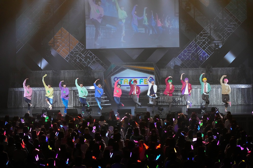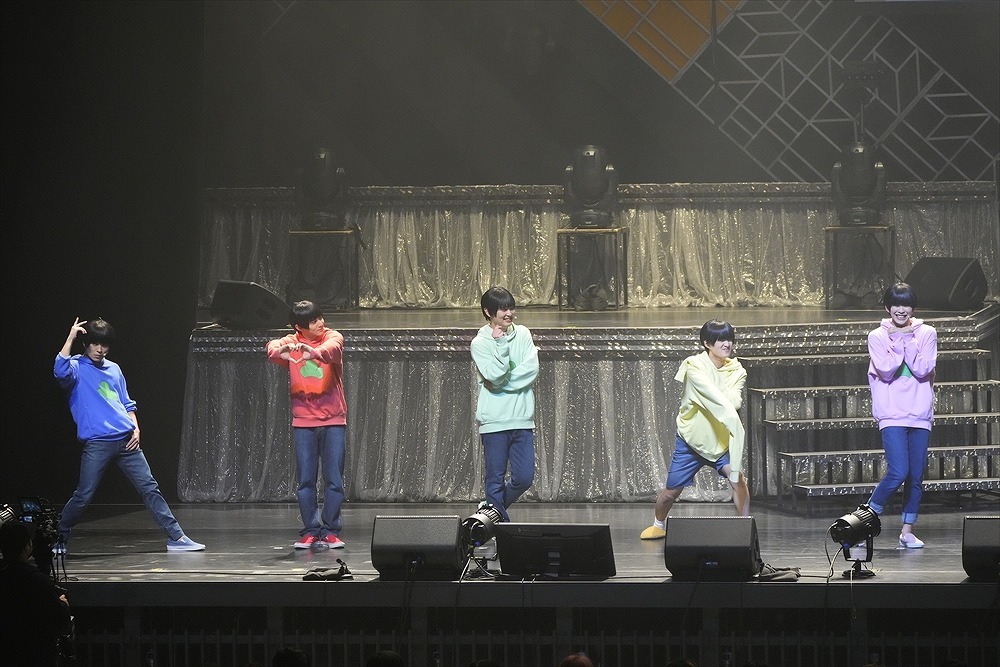 会場の大きな歓声の中、松ステの本公演でも人気を博した「Introduction F(F6)」「CHERISH YOUR SMILE(6つ子)」を息ぴったりのダンスでパフォーマンス! 12人が勢ぞろいしたトークパートでは、Wおそ松(中西智也・草地稜之)が、ある大物アーティストのモノマネを披露したりと個性が大爆発! 勢いそのままに、なんと先ほどF6が歌唱した「Introduction F 」の6つ子Verとなる「Introduction M」を初披露! 「ニート史上1番踊った」「1日で踊りを覚えた」と裏話も飛び出した。続いてはF6負けじと、前作から引き継いだF6の大人気曲「 Fo6ow Your Dreams!!!!!!」を初披露! 「ねぇねぇどうしようF6!」と観客とコール&レスポンスを行いながら、アイドルさながらの盛り上がりで魅了。最後には松ステの定番曲の大晦日限定Ver.「SIX FAME FACES~年越しも最高!!!!!!ffffff 」を全員で歌唱し、松ステワールド全開の爆笑のステージがあっという間に幕を閉じた。