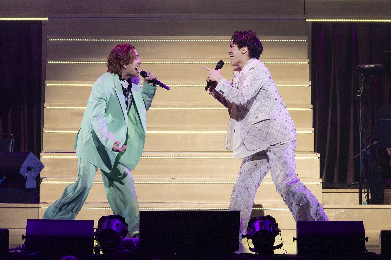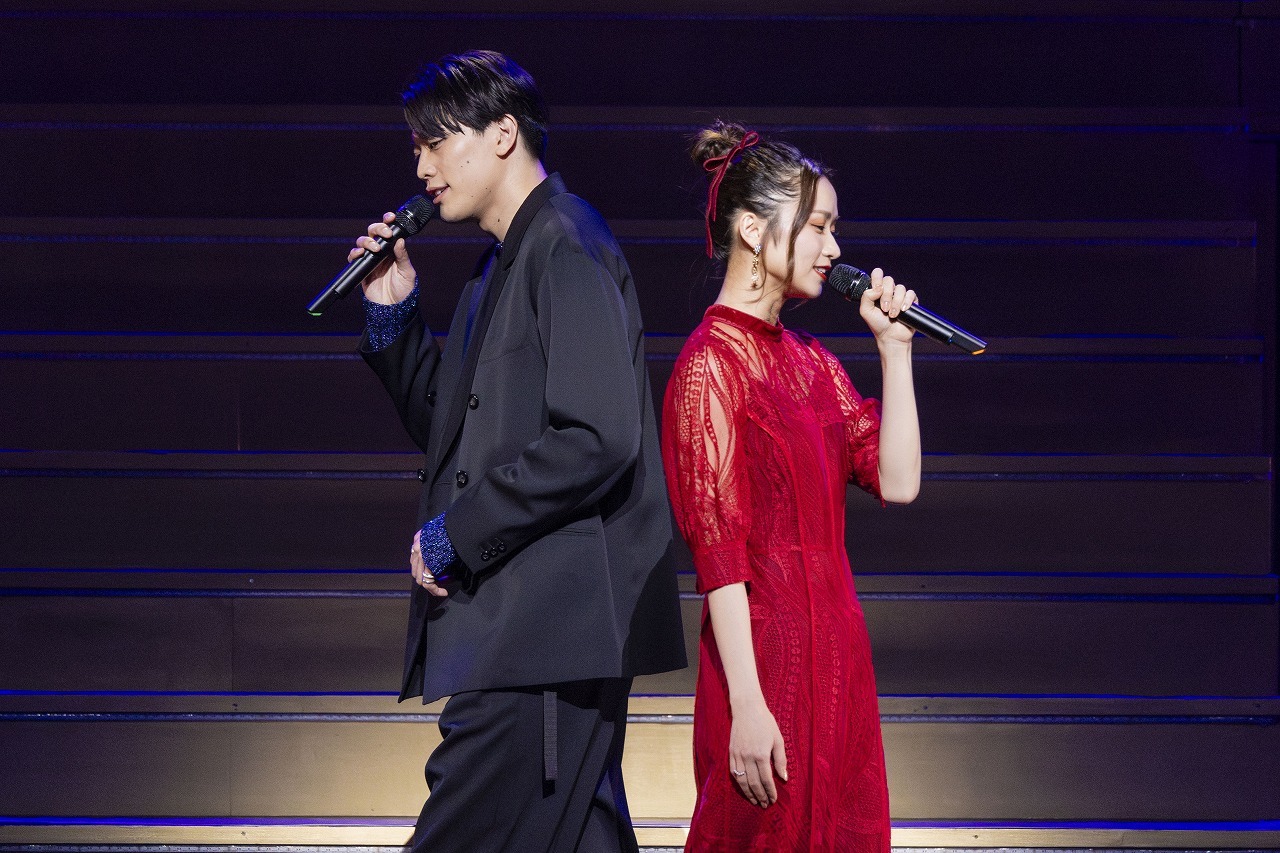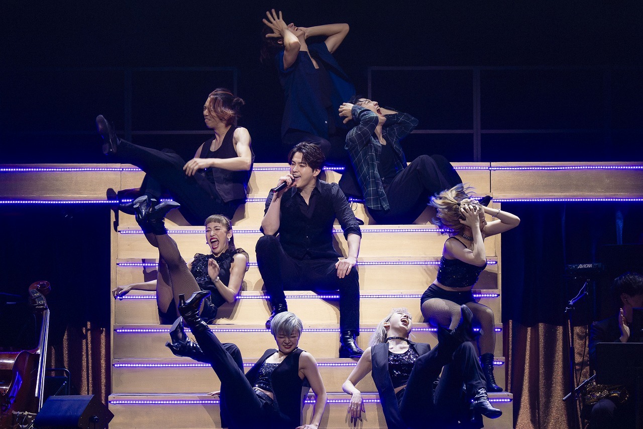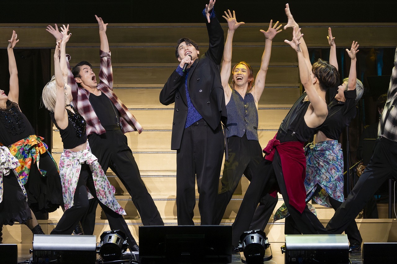 さて、MCのあとは、デュエットやソロで様々な楽曲を披露し、8名のダンサーたちが各曲の世界観を創り上げていく。それぞれが出演した作品からの楽曲では、東が『ジャージー・ボーイズ』の「Oh What a Night」を、甲斐が『デスノート THE MUSICAL』の「デスノート」を、三浦が屋比久とともに『リトル・ショップ・オブ・ホラーズ』の「Suddenly Seymour」を、『ピピン』の「Corner of the Sky」を森崎が歌い、『ロミオ&ジュリエット』の「Aimer」を、21年に出演した甲斐と17年・19年に出演した木下が、主演作『赤と黒』より「赤と黒」を三浦が熱唱。『RENT』の「I’ll Cover You」では、平間が演じたエンジェル役を彷彿とさせるパフォーマンスを東と見せた。『モーツァルト!』の「ダンスはやめられない」を歌った木下、『ミス・サイゴン』の「命をあげよう」を歌った屋比久、『In the Heights』の「In the Heights」を歌った平間も役を思い起こさせる。海宝と木下の『アナスタシア』「In a Crowd of Thousands」はセリフもあり。『ネクスト・トゥ・ノーマル』の「I’m Alive」はダブルキャストだった海宝と甲斐で。『ヘアスプレー』の「You Can’t Stop the Beat」を三浦と平間が踊りまくり、海宝が『ノートルダムの鐘』の「Out There」をたっぷり聴かせた。本公演だけのスペシャルコラボとなったのは、sara の『CHICAGO』(All That Jazz)、森崎と sara の『塔の上のラプンツェル』(輝く未来)、木下と屋比久の『Wicked』(あなたを忘れない)。そして、全員で歌った『RENT』の名曲「Seasons of Love」は、その歌声の豊かさが沁み入った。