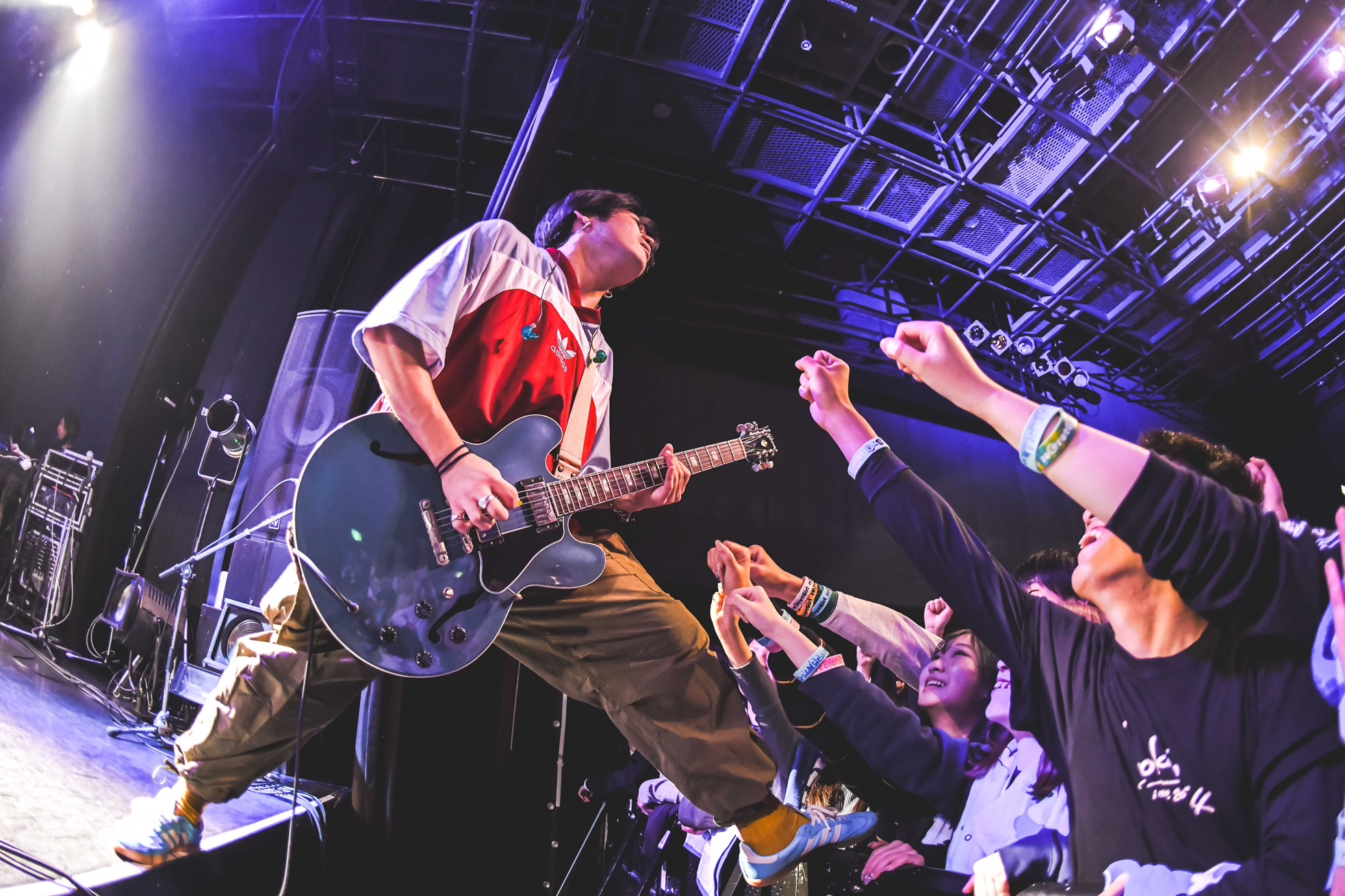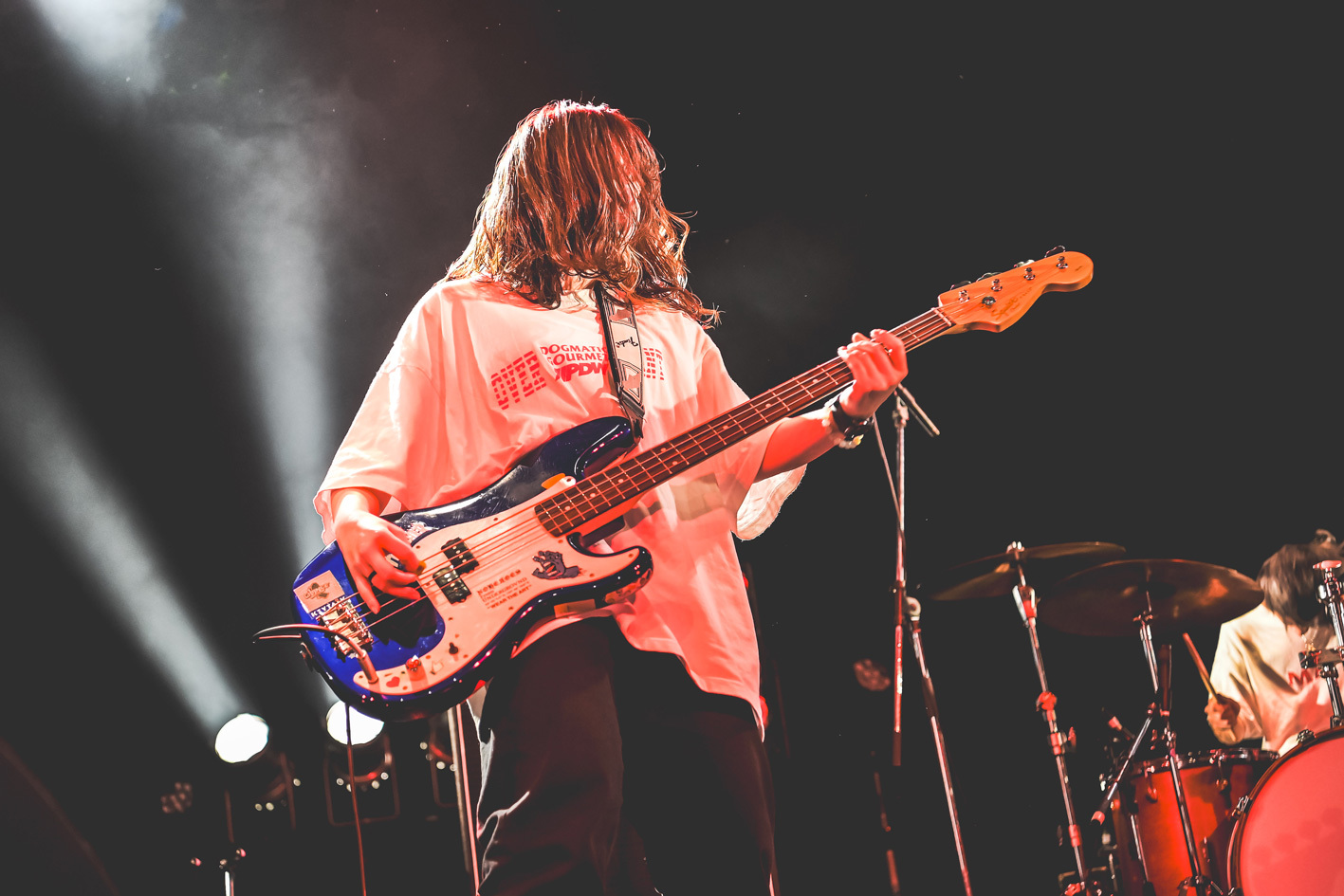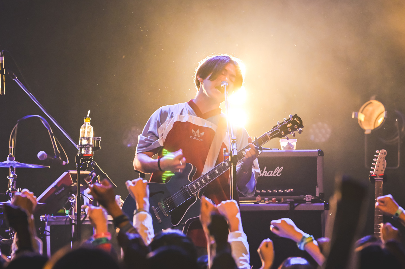 浜口は「後ろで見てる人も良かったらこっちおいでよ!」と声を掛け、ウェルカムな空気を作り上げていった。キャッチーな「センチメンタルガール」に続き、軽快なギターリフで思わず踊りだしたくなる「ラストラブレター」を演奏し終えると浜口は「大阪最高です、ありがとう!」と笑顔。「今年大阪でライブしてきたから、大阪がどんだけやれるか知ってるので、コールアンドレスポンス、やってもいいですか!」と<ラーラーララララ>で練習を兼ねてシンガロング。そんな「アダムとイブ」のサビは、もちろん全員の歌声が会場に響く。