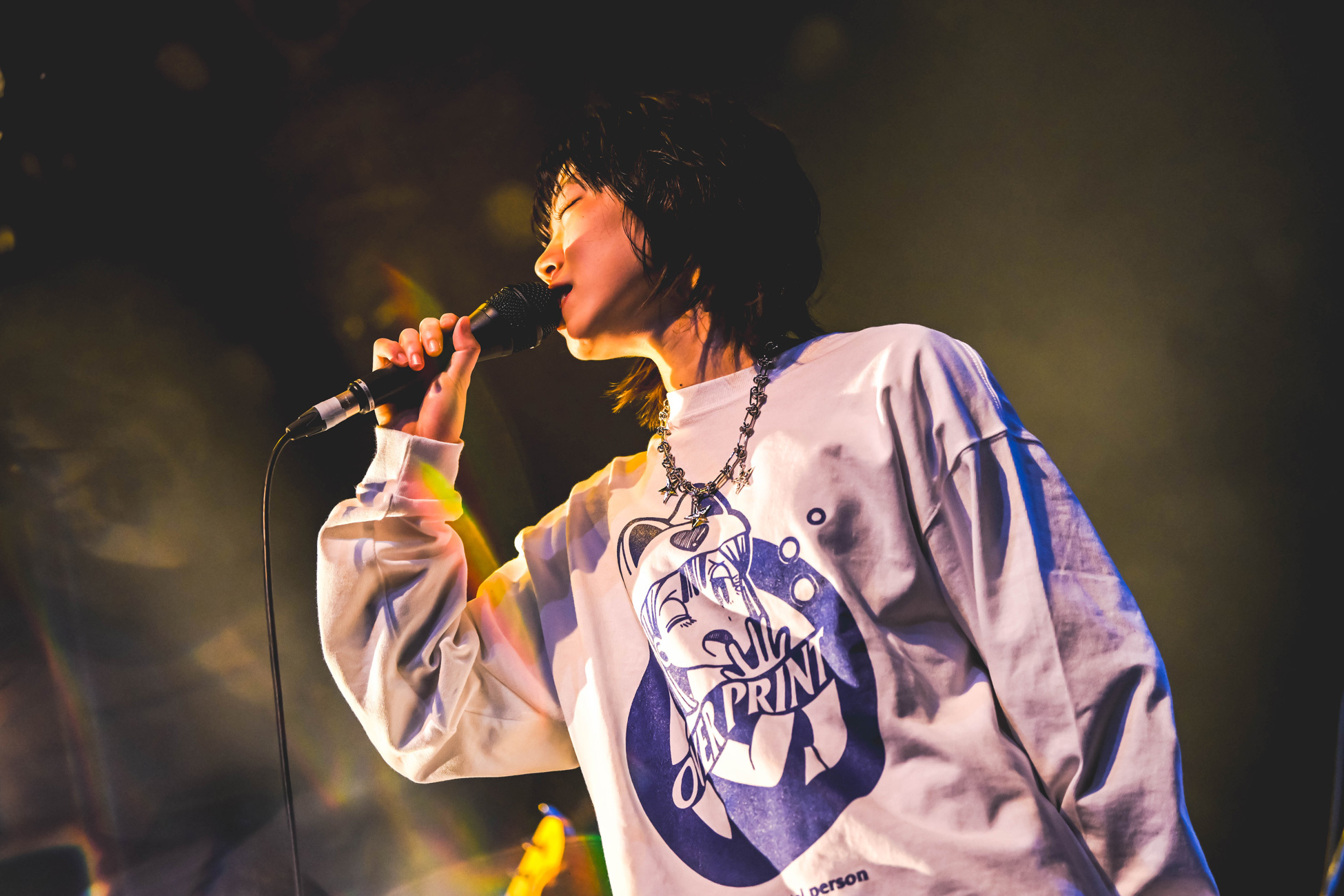「さっきmoon dropが言ってたけど、いつまでも大事やと思ってるものを大事にできるのってカッコ良いし、そういうのって思いやりに繋がる。皆ライブハウス好きって手上げてたやん。その繋がりだけあればひとつになれると思う。ここからもう1個ギアあげていきます!」と昔の恋人への想いを歌った「ルックバック」を経て、「1番ざわめける曲やります!」と投下された「ホワイトアウト」では、のっけからシンガロングが発生。サビではその声がより大きくなり、文字通り会場全体が一体に。
