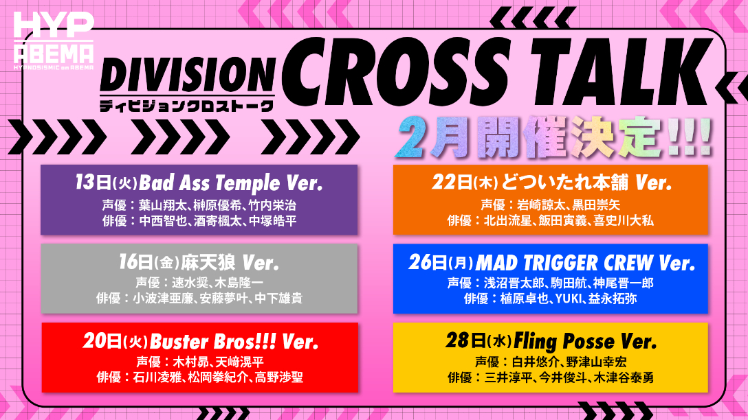 2月9日(金)から3月31日(日)まで開催される『ヒプノシスマイク -Division Rap Battle- Hypnosis Flava@Mixalive TOKYO』(『Hypnosis Flava2』)にて、「DIVISION CROSS TALK」が行われることがわかった。