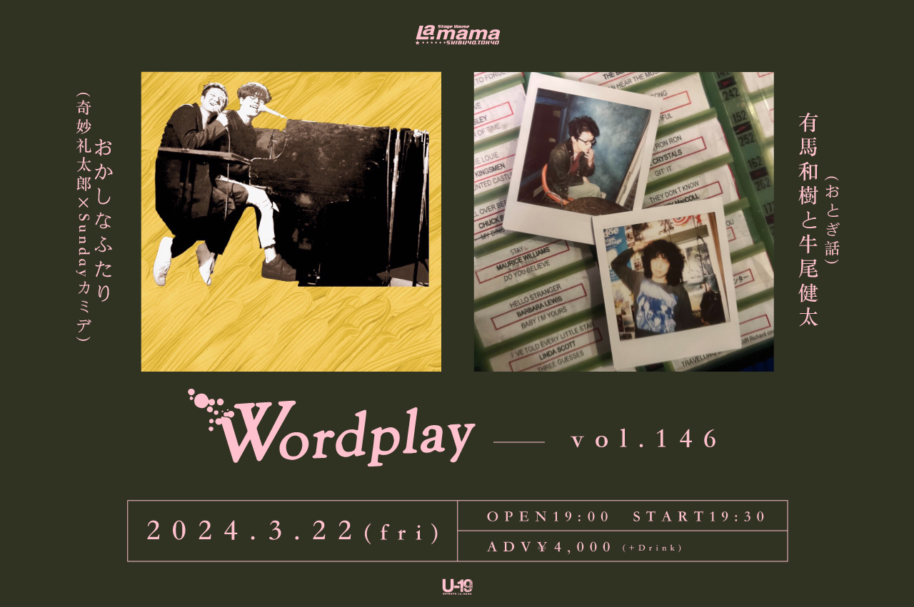 おかしなふたり(奇妙礼太郎×Sundayカミデ)と、有馬和樹と牛尾健太(おとぎ話)の2マンライブ『Wordplay vol.146』が、2024年3月22日(金)に渋谷La.mamaにて開催されることが発表された。