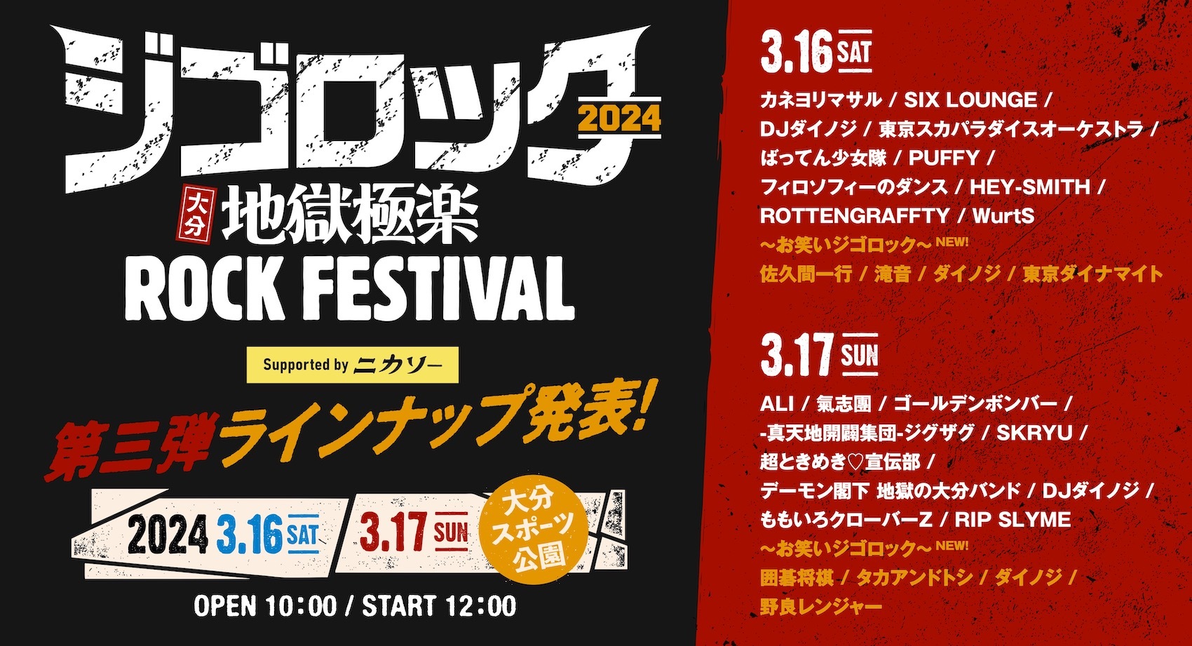 2024年3月16日(土)・17日(日)に大分スポーツ公園にて開催される、大型野外フェス『ジゴロック2024~大分“地獄極楽”ROCK FESTIVAL~ supported by ニカソー』の第三弾出演アーティストが発表された。