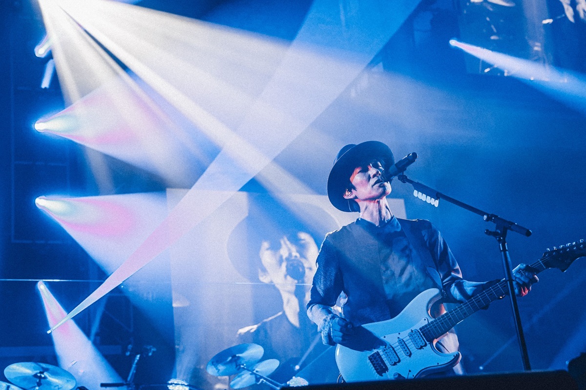 開演時間の3~4分前、注意事項に続いて「それではまもなく6年5ヵ月ぶりの日本武道館公演を開催いたします」というアナウンスが。そうか、武道館はそのぐらい振りなのか、あえてそのことを観客に伝えるくらいにはある種の特別感もある公演なのだな、と思っていたところで客電が落ちた。因みに後のMCで草野自身も触れていたが、初めてSPITZが武道館で公演したのは2014年7月だから10年前。結成から27年目の年だった。ファンにはよく知られたことだが、かつて彼らは「武道館ではやらない」と公言していた。90年代半ばから2000年代半ばにかけて何度か彼らの取材をしたが、新宿LOFTに出ているようなバンドに憧れてそこに出ることが結成当初の目標のひとつではあったけれど天邪鬼であるゆえ“目指せ武道館”といった風潮にはノリたくない、ライブハウス→ホール→武道館といった(当時の)ロックバンドの上がり方にも逆らいたいと、そんなようなことを話していた記憶がある。では今の彼らは武道館という場所、そこで公演することをどんなふうに位置付けているのか。そのあたりのスタンスがなんとなくうかがえるようなMCが本編中にあったりもしたので、それについてはあとで書こう。