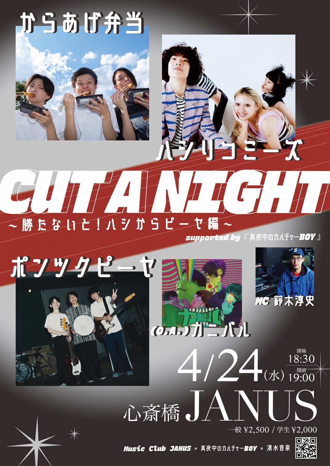 大阪・心斎橋のライブハウス・Music Club JANUS主催、ABCラジオ『真夜中のカルチャーBOY』と関西のイベントプロモーター・清水音泉協力の初イベント『CUT A NIGHT〜勝たないと!ハシからピーヤ編』が、4月24日(木)に開催される。