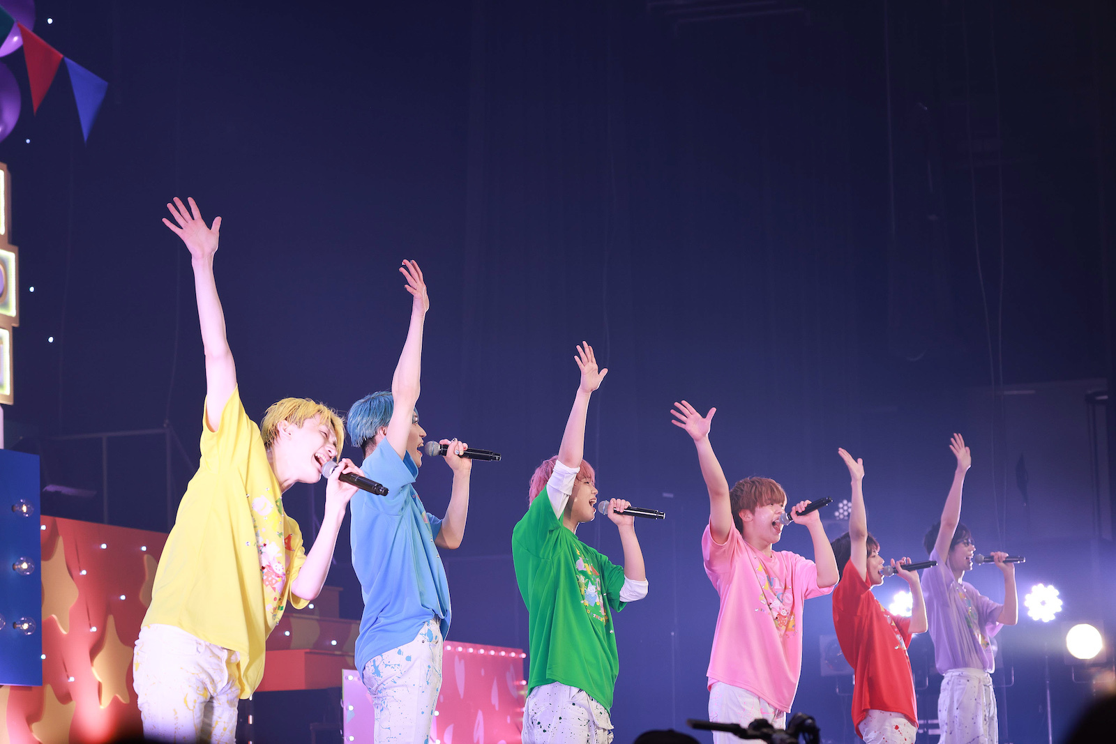 メンバーの名前が入ったブロックや、色とりどりのガーランドや風船、ロボット型のモニターなど、まさに“おもちゃばこ”のようなステージに現れた6人。<おもちゃ箱みたいな 飽きない恋をしよう>というフレーズが開幕にぴったりな「ない♡Night」、「Crack」と、雰囲気の違う2曲を続けて披露。会場に纏うオーラを一気に塗り替えていく彼らに、スタートから期待が高まる。