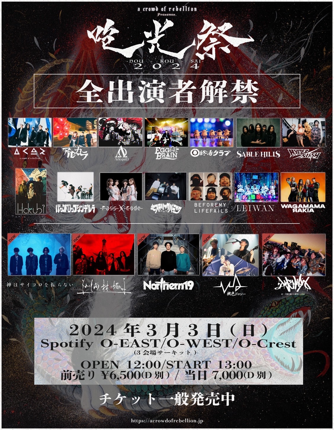 3月3日(日)に渋谷Spotify O-EAST、O-WEST / O-Crestの3会場にて開催される、a crowd of rebellion主催のサーキットイベント『“咆光祭”2024』の最終出演者として、神はサイコロを振らない、夕闇に誘いし漆黒の天使達ら5組が発表された。