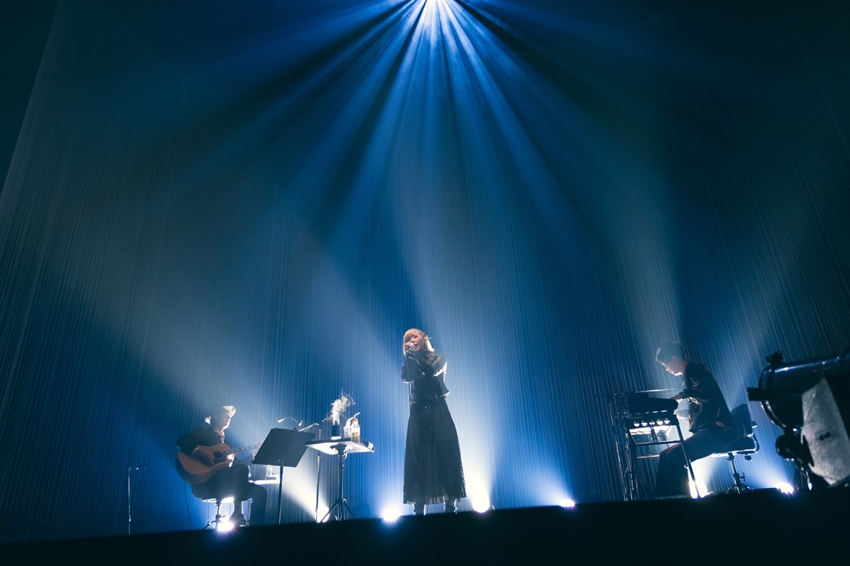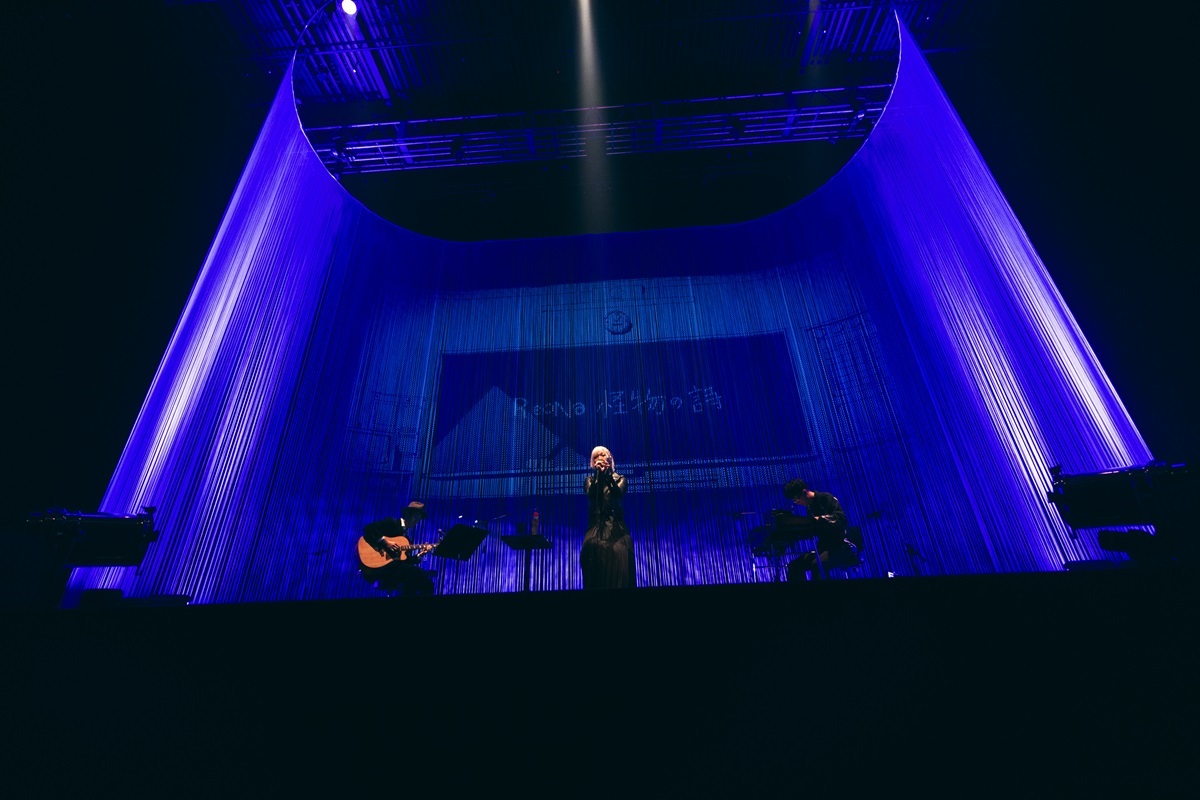 ステージには長く細い白糸を束ねたカーテンが半円状に設置されている。今回はキーボードの荒幡亮平、アコースティックギターに山口隆を迎え、ボーカルのReoNaとのスリーピースのミニマムなスタイル。ReoNaの楽曲はアンプラグドと相性がいいのはすでに周知の事実だが、今回のツアーの一曲目は『月姫-A piece of blue glass moon-』EDテーマである「Believer」。単音から始まり、次第に衝動を鍵盤に叩きつけるような荒幡のピアノの音から始まったロックチューンは、アコースティック編成とは思えない熱量で届けられた。