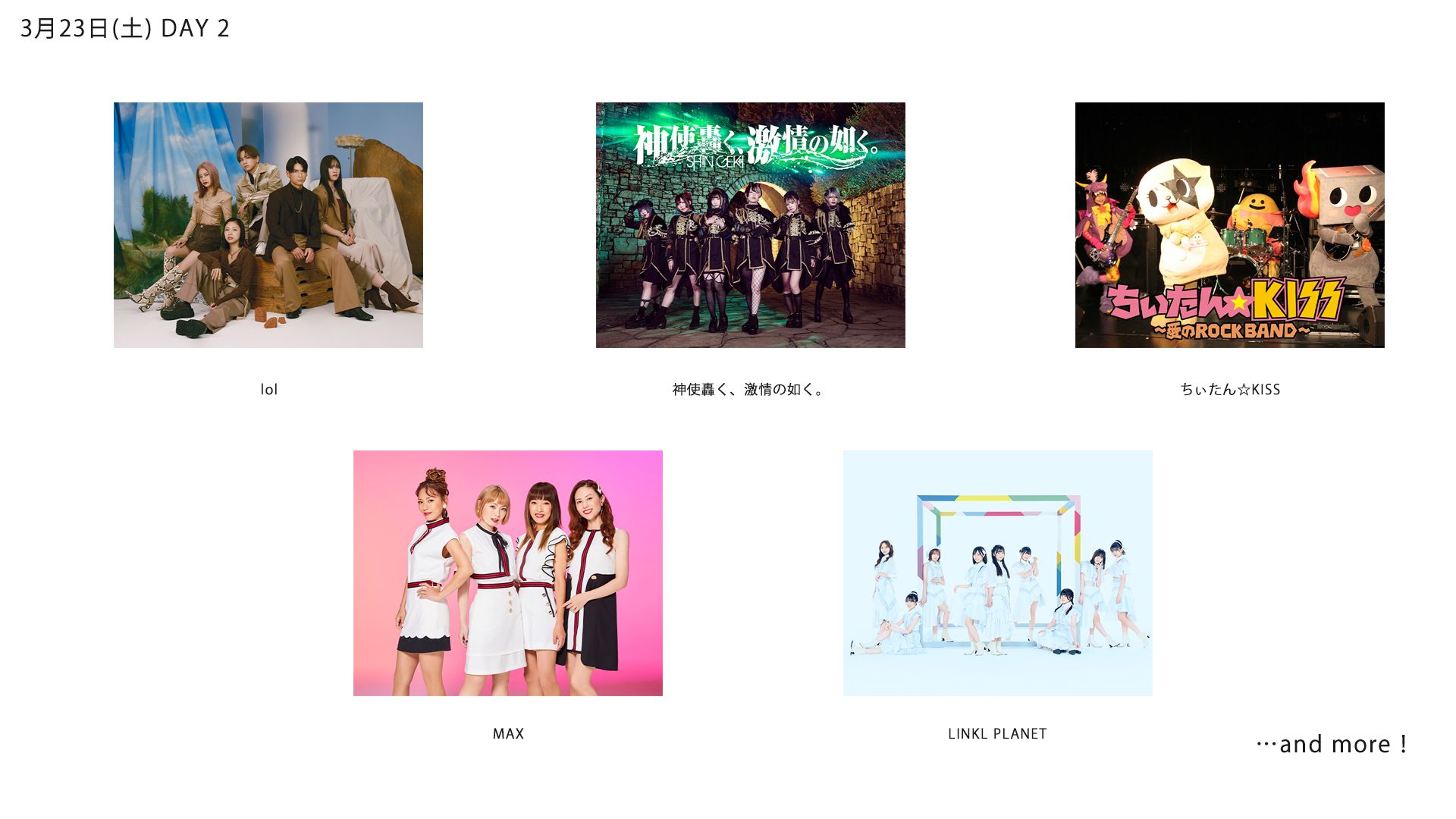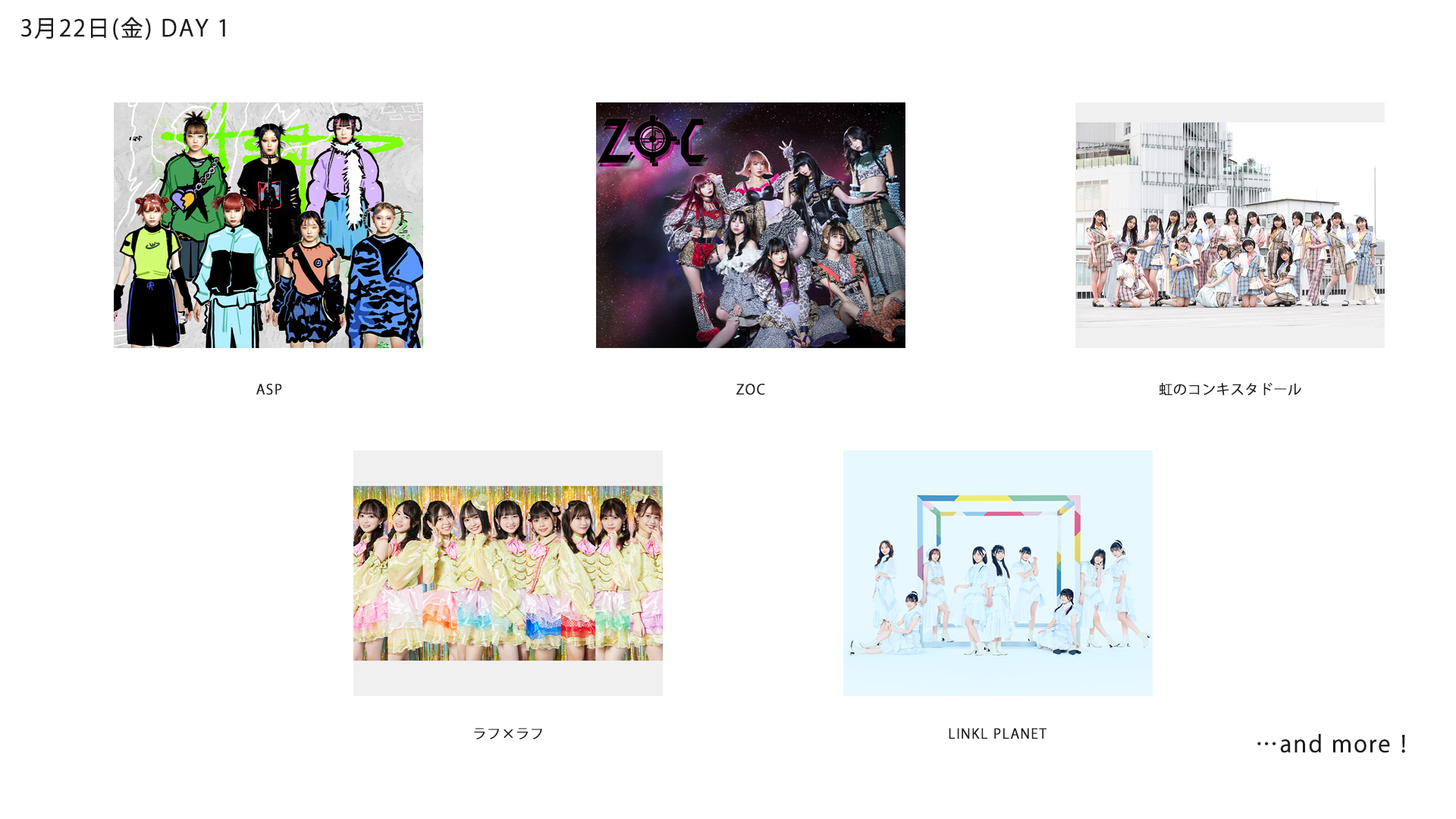 「HYPER STAGE」に出演する12組のアーティストが第一弾ラインナップとして発表されている。3月22日(金)にはASP、ZOC、虹のコンキスタドール、ラフ×ラフ、LINKL PLANETが出演。3月23日(土)にはlol、神使轟く、激情の如く。、ちぃたん☆KISS、MAX、LINKL PLANETが出演。3月24日(日)には玉置成実、BACK-ON、LINKL PLANETが出演することが決まっている。