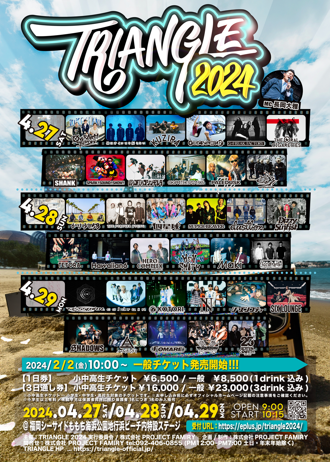 2024年4月27日(土)・28日(日)・29日(月祝)に、福岡・シーサイドももち海浜公園地行浜ビーチ内特設ステージにて開催される福岡の野外音楽フェス『TRIANGLE 2024』の日割りが発表された。