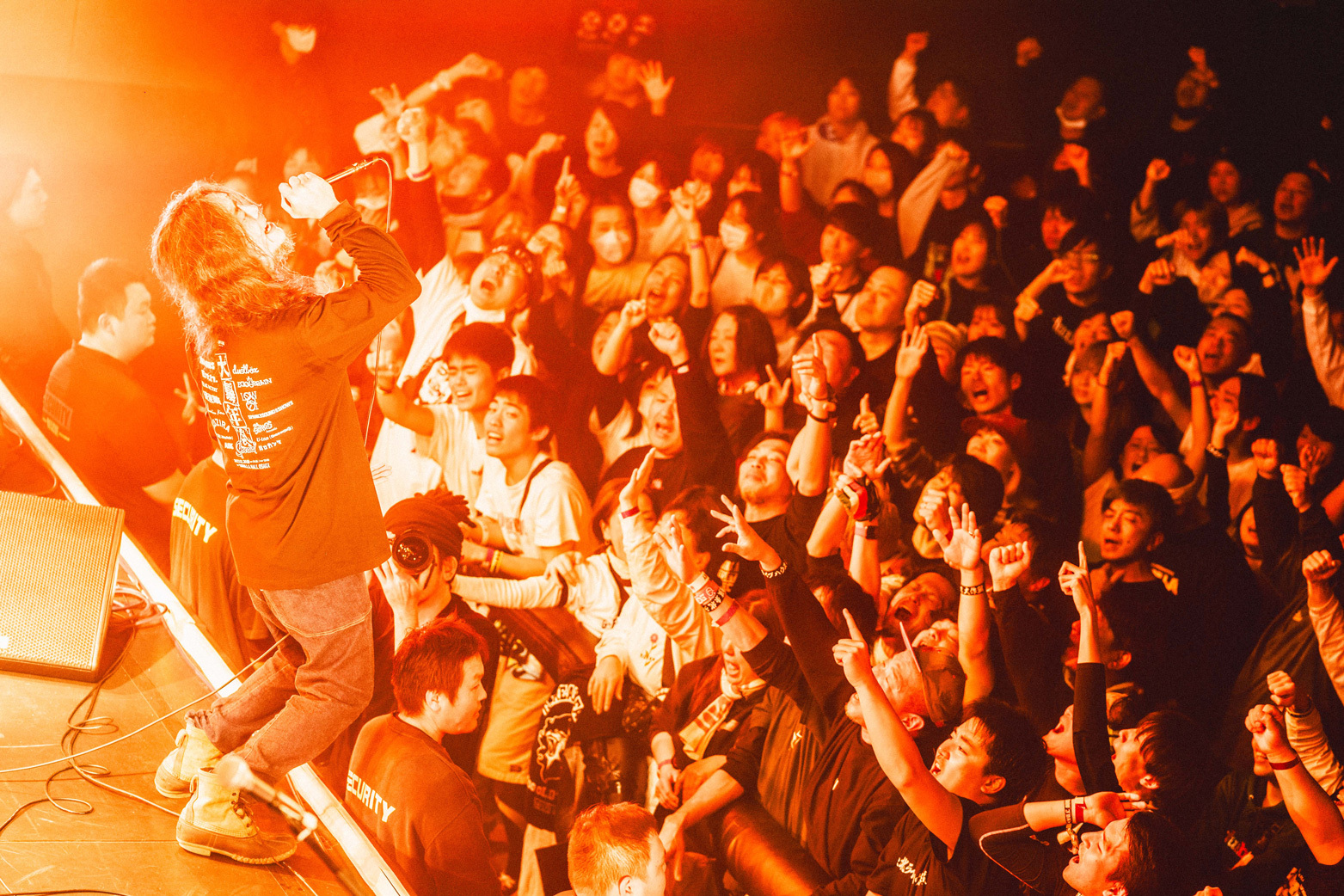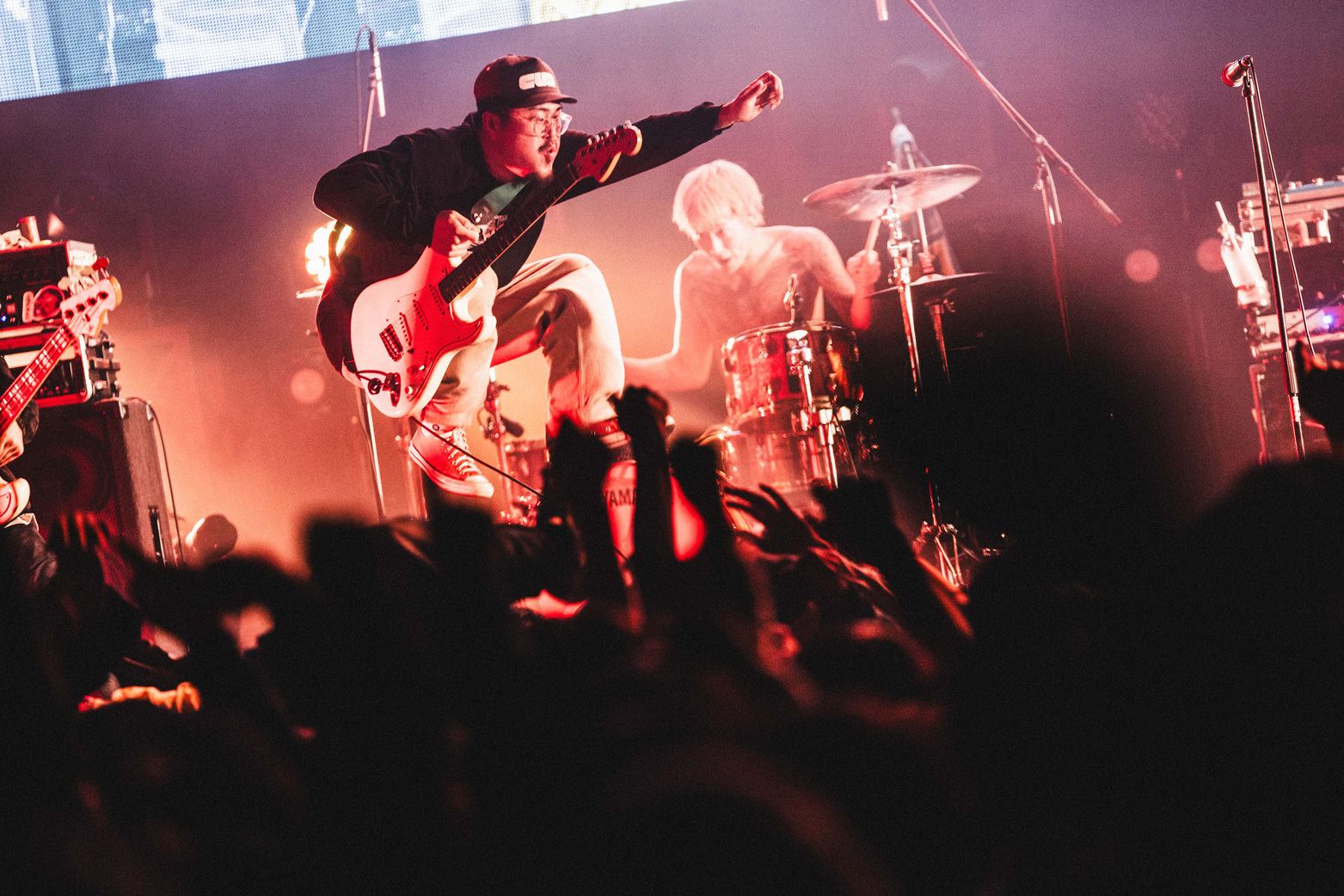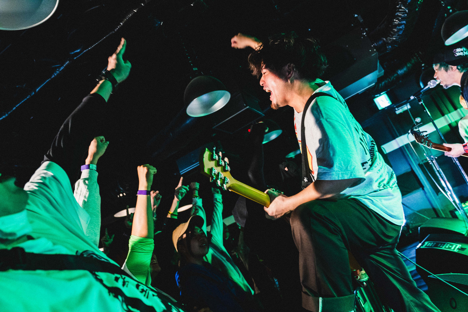 「かませ!」、シンプルな煽りのひと声でフロアに強烈なハーコーが発生。「Senses」「Overcome」、さらには「Tourette’s/NIRVANA」のカバーと、頭上から降り注ぐ轟音を浴びながら全身で音に塗れていく観客たち。「最高! みんな優勝!」、観客の豪快な暴れっぷりにメンバーも満足気だ。その後もダイバー量産型サウンドを投下し続け、出演者が次々に飛び入り参加してはフロアに飛び込んだりと、「大暴年会」の名にふさわしいステージに。「来年も大好きなバンドとライブハウスをよろしく!」と、グッドメロディを爆音で届け、颯爽とステージを後にした。