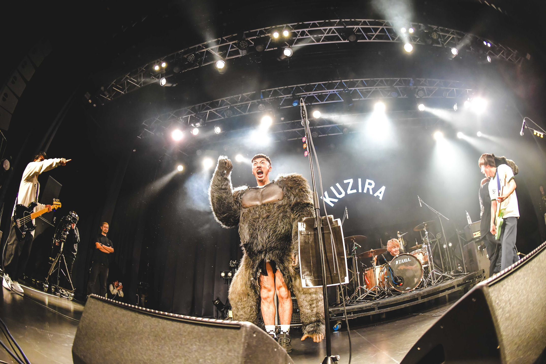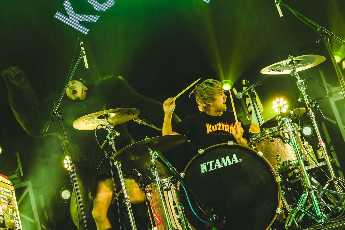 パワフルながらメリハリのある演奏だからか、末武の歌声がよく聴こえる。熊野は大声で煽り、シャー:D(Dr)はスティックを華麗に回す。MCで末武は「大阪、今年もお世話になりました! 大阪ってもうちょっと元気だったよね? こたつでぬくぬく過ごすんじゃなくて、ここを選んだんですよね? じゃあもっと来てくれないと!」と鬼気迫る様相で煽った「Clown」ではゴリラくんが登場。よく見ると、ゴリラの足の間から人間の足が見えている(笑)。頭を取ると、現れたのはスサシのイチロック。これにはオーディエンスも大歓喜! さらに割れんばかりの轟音で「Muggy」をプレイした。