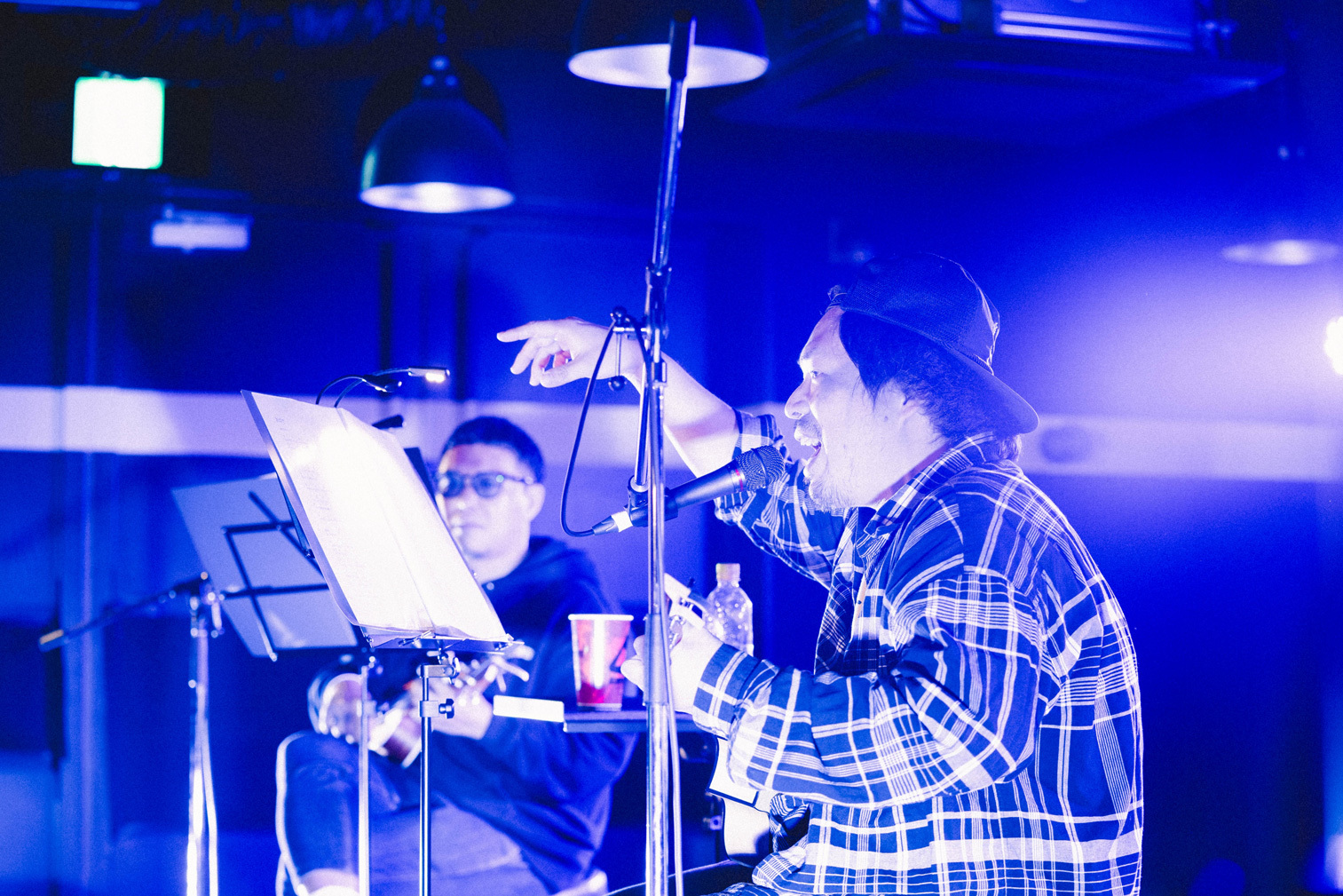 持ち時間の半分をトークで使って笑わせたのは、LOCANDA&トンマ(Xmas Eileen)からなる#ロカンマ。LOCANDAは「皆さん年の瀬、ようこそゴリラホールへー! 暴れまくる用意はできてますかー!」と明るく煽り、しばし2人でゆるいトークを繰り広げる。そして2人はゴリラホール・オーナーの中村氏にもらったというウクレレを奏で、中村氏のことを歌った「ナカムラ」を歌唱。そんな様子をバーカウンターで見守る中村氏。実に愛されているオーナーだ。