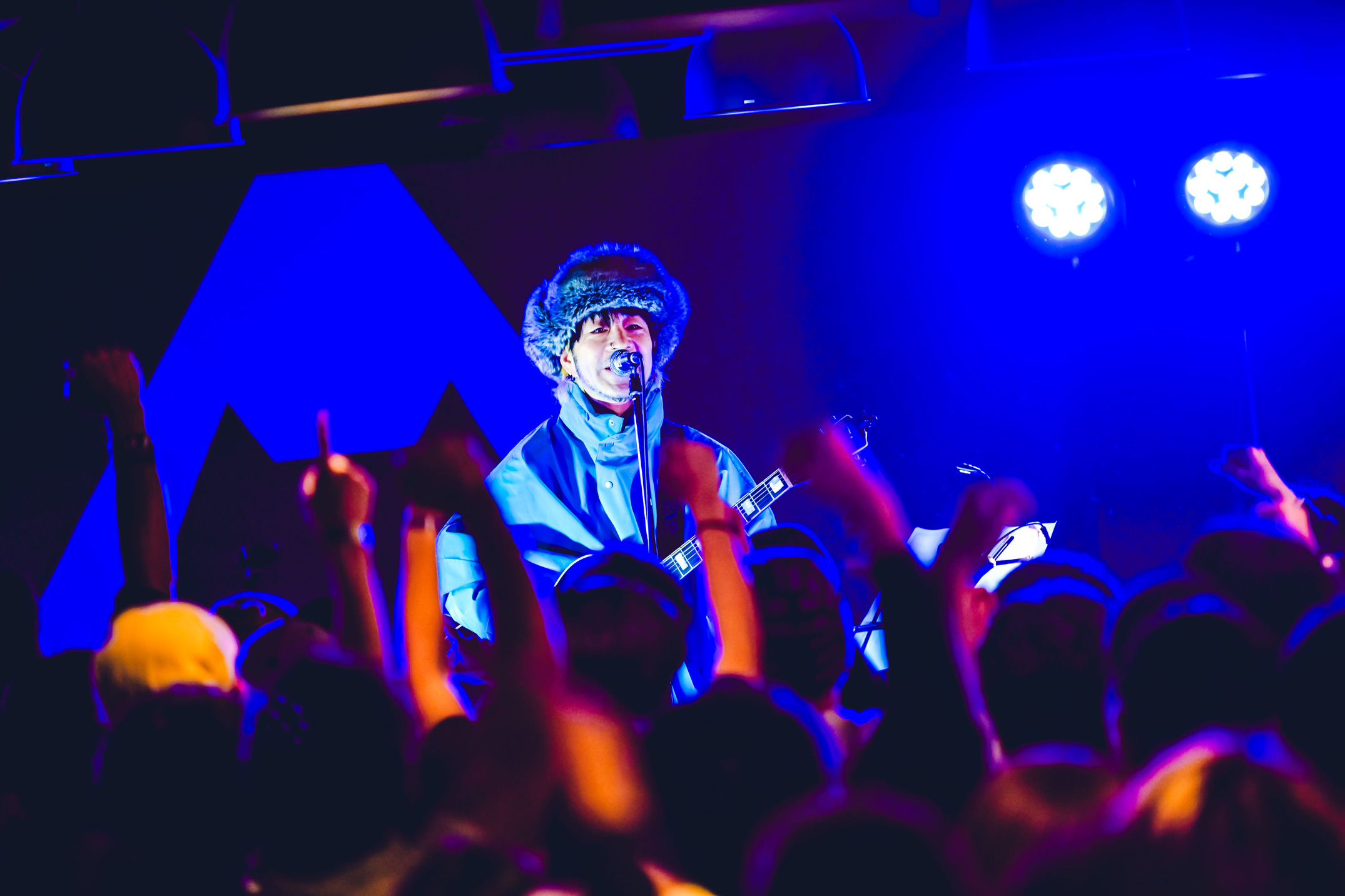 エスキモーハットにアコギを抱えて登場したLOW IQ 01。冗談を交えた軽快なトークで飛ばしつつ、「Snowman」をメロディアスに響かせる。早速クラップとシンガロングでひとつにすると、長渕剛の「とんぼ」をカバー。オーディエンスも巻き込んでワンマンさながらの大合唱! MCではフロアとコミュニケーションを取りつつ、モノマネ満載&濃厚キャラで会場を大爆笑に。さらにBRAHMANの「ANSWER FOR. . .」と「今夜」をカバーして大喝采を浴びた。