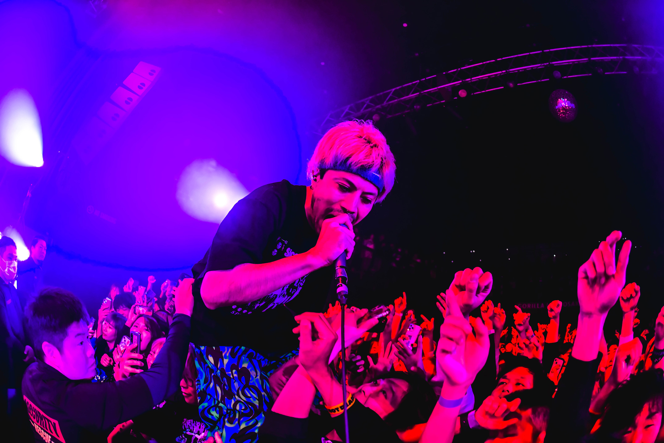 絶好調のフロアにJOEYは「最上級の愛を込めて。CAN’T HELP FALLING IN LOVE(WITH OSAKA)!」と曲を贈り、「CROSS THE SKY」「SCISSORS」を連投すると、さらにフロアは前のめりに。そんな様子を見たJOEYは、KUNとUchieに耳打ちして「大阪元気良さそうやから、曲変えるわ」と急遽ステージ上でセトリ変更! 聴こえてきたアンセムは「MUZIC」。ストップモーションの溜めで爆発力が増し、リフトからのダイブ、クラウドサーフ、ウィンドミル、サークル出現とてんやわんやの大騒ぎ。