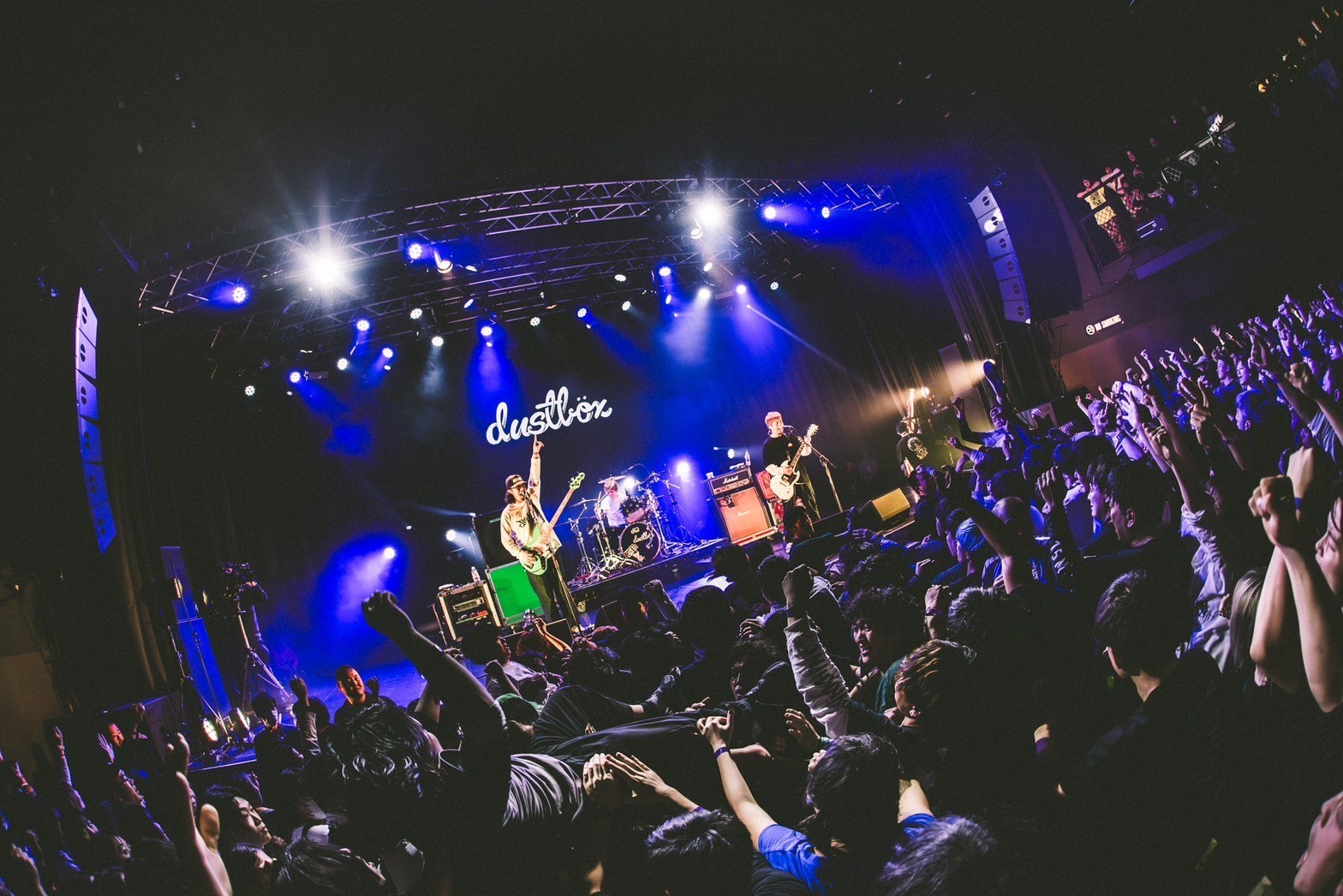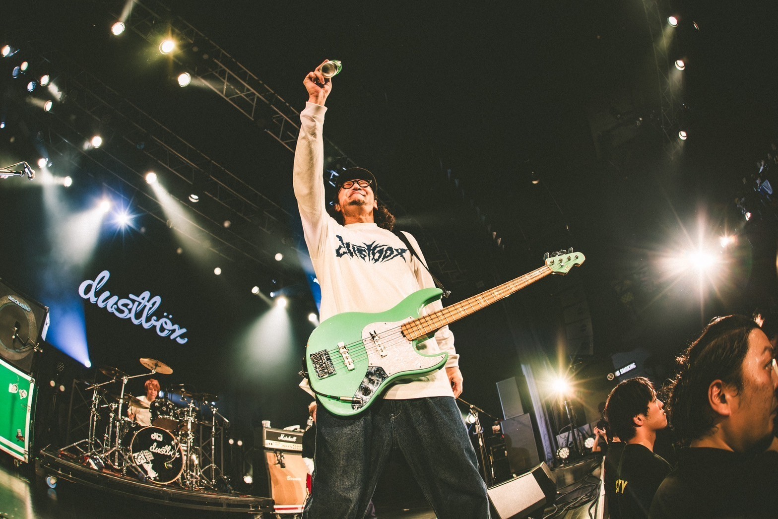 「待たせたなー! 大阪、思いきりいくぞ!」。”ロックの遊び場”と化した大暴年会、そしてGORILLA HALL OSAKAの一年を締めくくる大トリはdustbox! 期待募るステージ、1曲目に選んだのは「Riot」。SUGA(Vo.Gt)のギターリフを耳にしただけで観客は大喜び。満面の笑みを浮かべながら踊る子どももいれば、たまらずフロアに飛び込むバンドマンも続出し、スタートダッシュの速さに思わず目まいがしそうだ。開演からすでに8時間以上が経過し、観客はモッシュにダイブにと大暴れしてきたはずだがまだまだみんな元気! 「Rise Above」「Not Over」とグッドメロディ&瞬発力の高いサウンドに全力で応えていく。