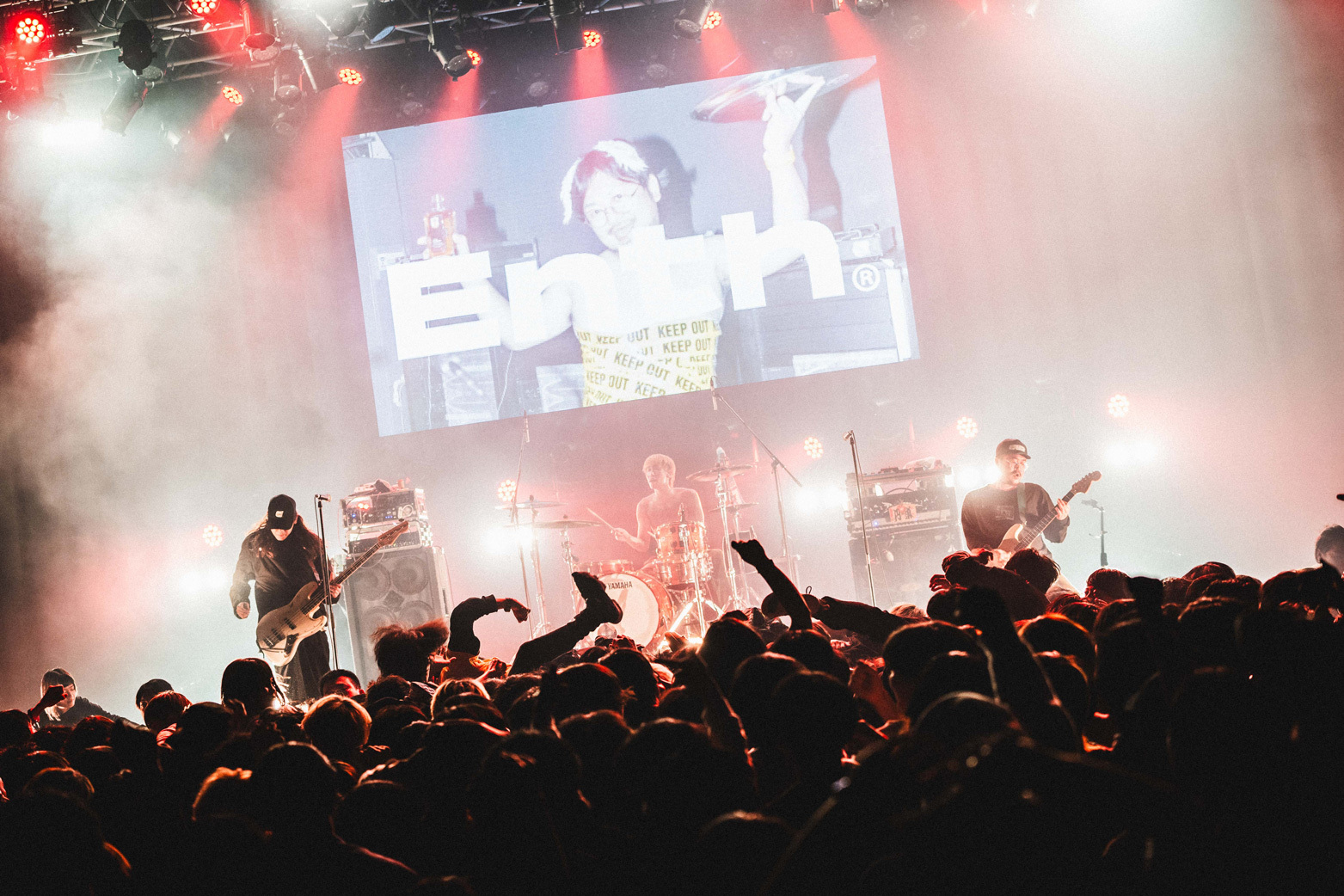 「よっしゃ! 暴年会、カチこんでいこーぜ! ラストがゴリラホール、ここで良かったなって思えるものに!」。サウンドチェックから飛ばしまくりのステージを展開していたENTH。おなじみのテキーラショットをあおり、「ムーンレイカー」をコールした瞬間にフロア前方の人口密度が急増。ダト・ダト・カイキ・カイキ(Vo.Ba)のシンプルだけど美味しいとこどりなリズムに揺られ、フロアが大きなうねりを上げる。さらに「"TH"」でも豪快なギターサウンドにテンションが大きくバースト。うるさくってタフで、ゴツい音が次々に体にぶつかってくるんだけど、それがまた気持ちよくって誰もが前のめりに。「LOVE ME MORE」ではおなじみの下ネタコール&レスポンスで遊び、観客を巻き込んでさらにテキーラをグイっとおかわり。