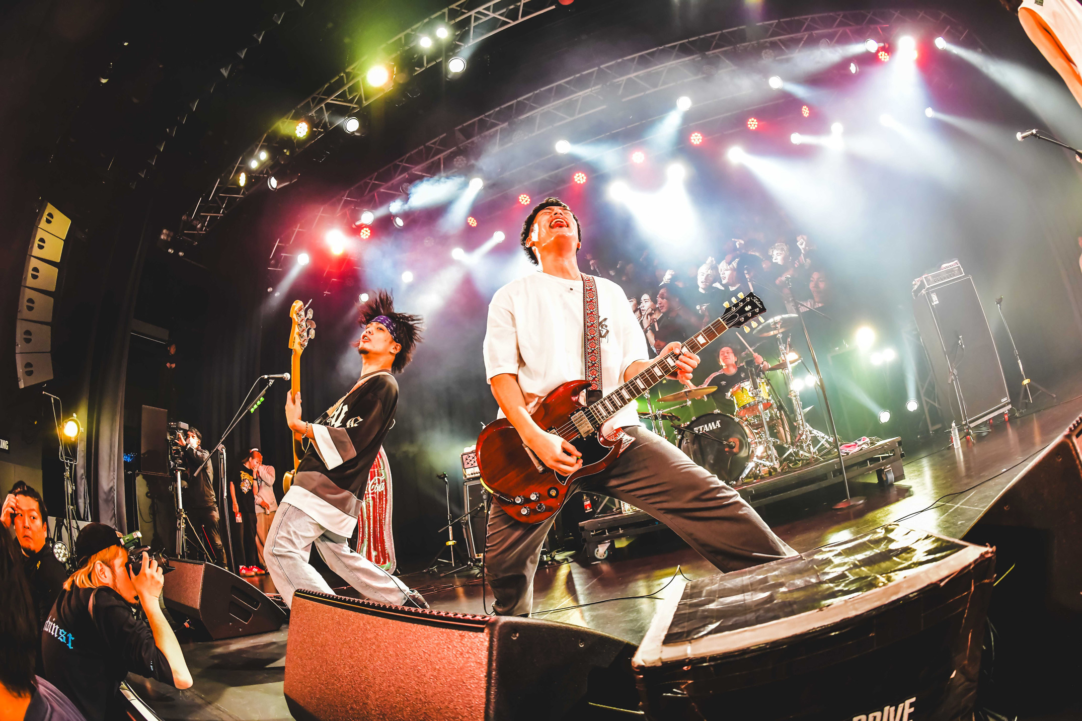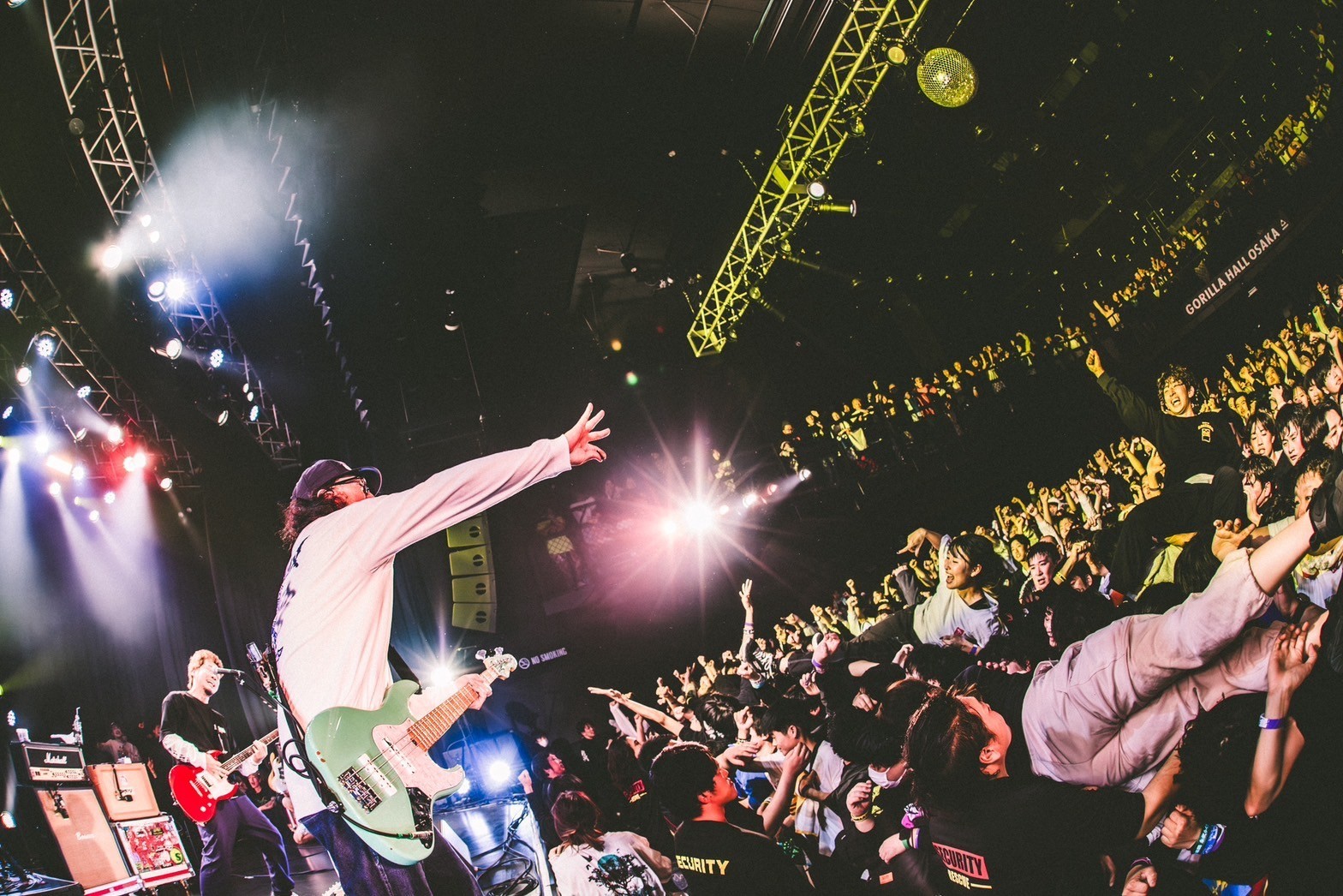 名古屋発のスカパンクバンド・FIVE STATE DRIVEはリハからフロアを踊らせて、ここまでのバトンをしっかりと引き継いだ。SEに乗せてHora(Gt)、Yoshiki(Dr)、Takuya/Gorilla(Ba)、Montero(Vo)が1人ずつ登場し、Monteroが「俺は今、踊りてえんだ!」と叫ぶと、挨拶代わりに「Theme of FSD」を披露。間髪入れず「Raise the Flag」「FUCK YOU」が投げ込まれるとフロアは全力でスカダンス! Monteroは「今年は大阪が大好きになりました。ゴリラホールができたから! 最高のライブハウスです、ありがとう!」と愛を叫び「Drive Me Crazy」では歌詞に<Osaka>を入れてテンションを引き上げる。