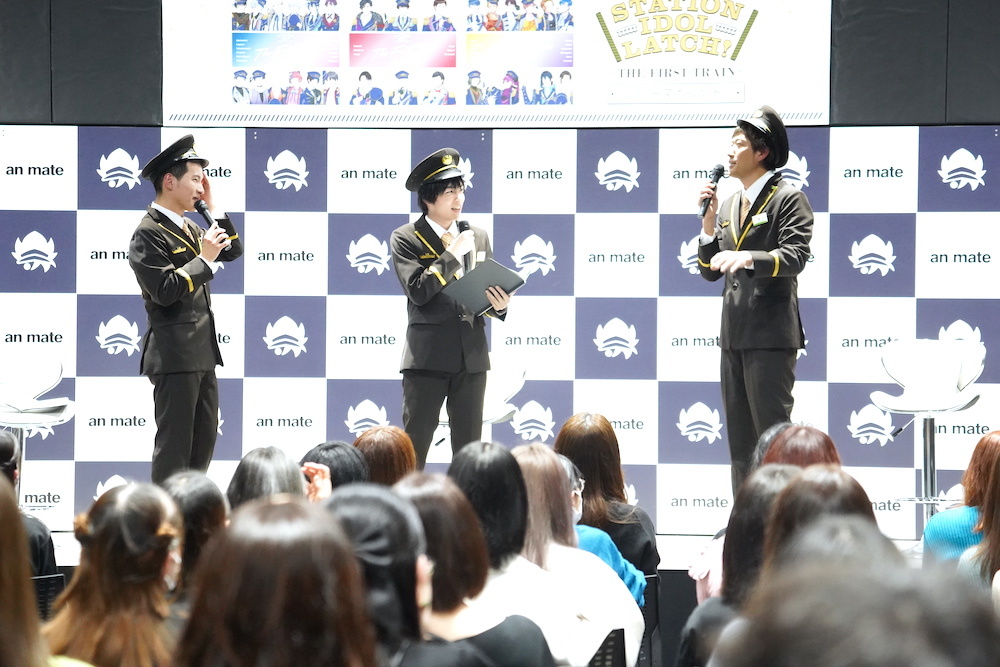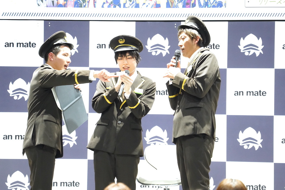 山手線各駅の個性豊かな駅員キャラクターが、業務時間を終えるとアイドルとして活躍するまったく新しいアイドルプロジェクト『STATION IDOL LATCH!(ステーションアイドルラッチ)』の1st Album『THE FIRST TRAIN』の発売を記念した<トーク&特典お渡し会>が1月19日、アニメイト池袋本店 9F animate hall BLACKにて開催され、高橋英則(恵比寿駅/饗庭紡麦役)、鈴木裕斗(秋葉原駅/雷電遊生役)、福崎那由他(代々木駅/樅野葵役)がファンとの交流を楽しんだ。