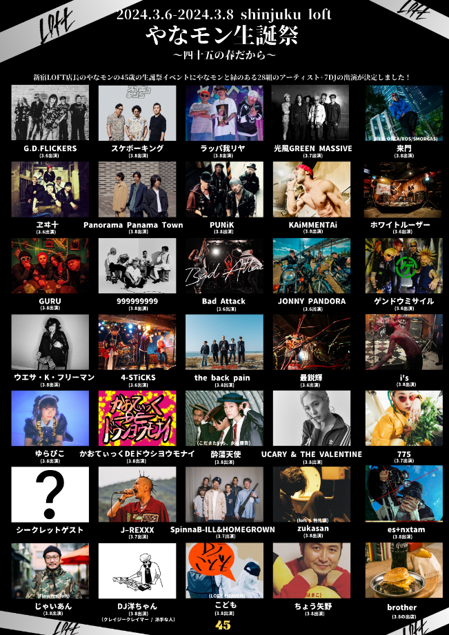 『やなモン生誕祭〜四十五の春だから〜』は、新宿LOFT店長“やなモン”こと柳沢英則氏の45歳を祝う生誕祭イベント。これまで、3月6日(水)・8日(金)に開催されることがわかっていた。