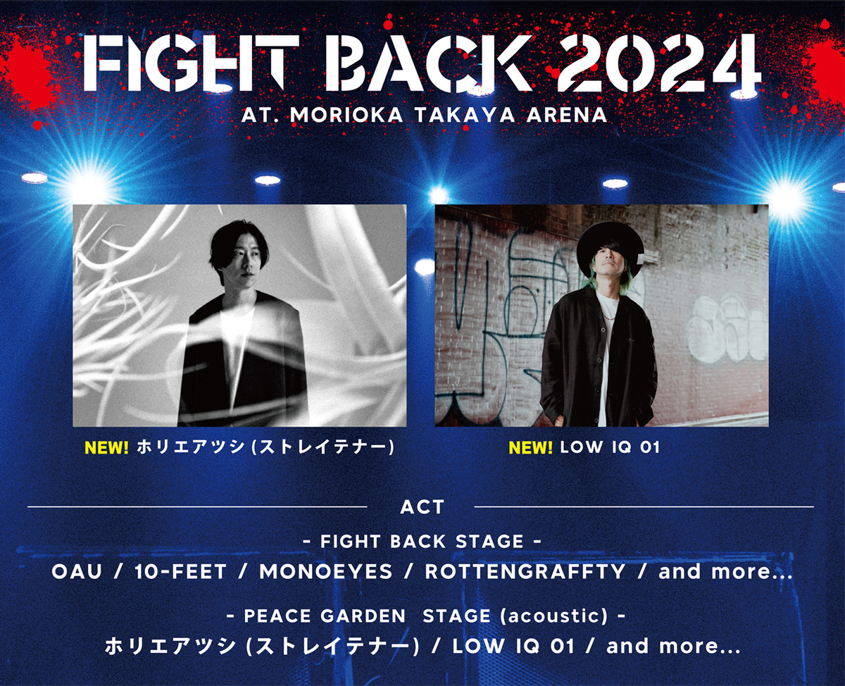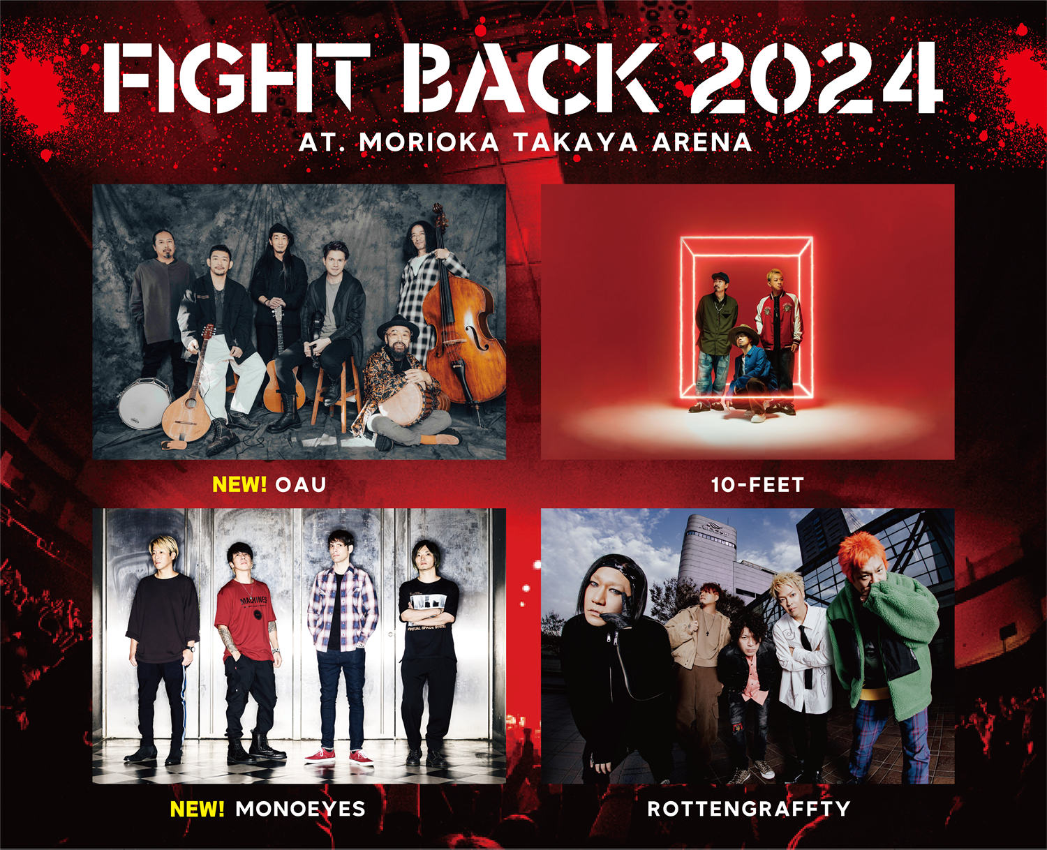 『FIGHT BACK』は、ライブハウス・盛岡ClubChangeの20周年を記念して、2022年12月に同会場にて開催されたアリーナイベントで、2年ぶりの開催となる。第1弾発表では、10-FEET、ROTTENGRAFFTYの出演が決定。今回の第2弾発表では、OAU、MONOEYES、ホリエアツシ(ストレイテナー)、LOW IQ 01の出演が決定した。