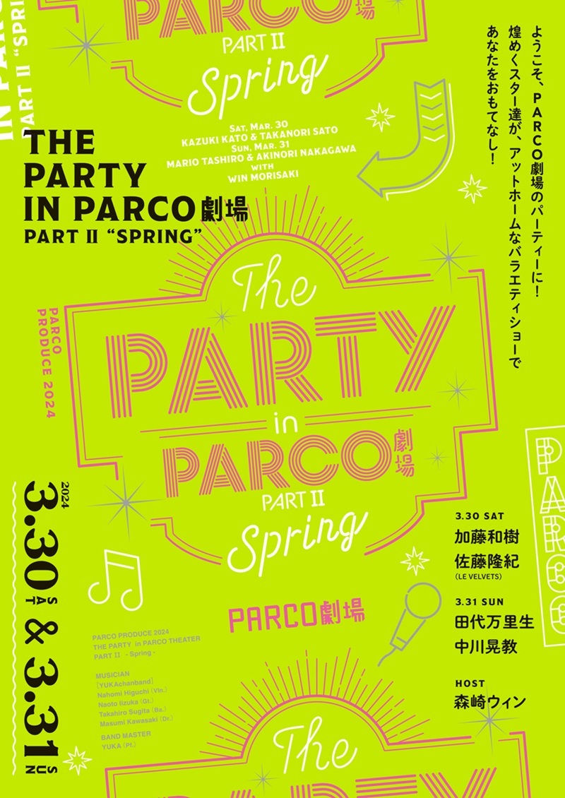 豪華ミュージカルスター多数の競演で2022年秋に開催された『THE PARTY in PARCO劇場~VARIETY SHOW & MY FAVORITE SONGS~』。第二弾となるパルコ・プロデュース2024『THE PARTY in PARCO劇場 PARTⅡ~Spring~』が2024年3月30日(土)31日(日)PARCO劇場にて上演されることが決定した。