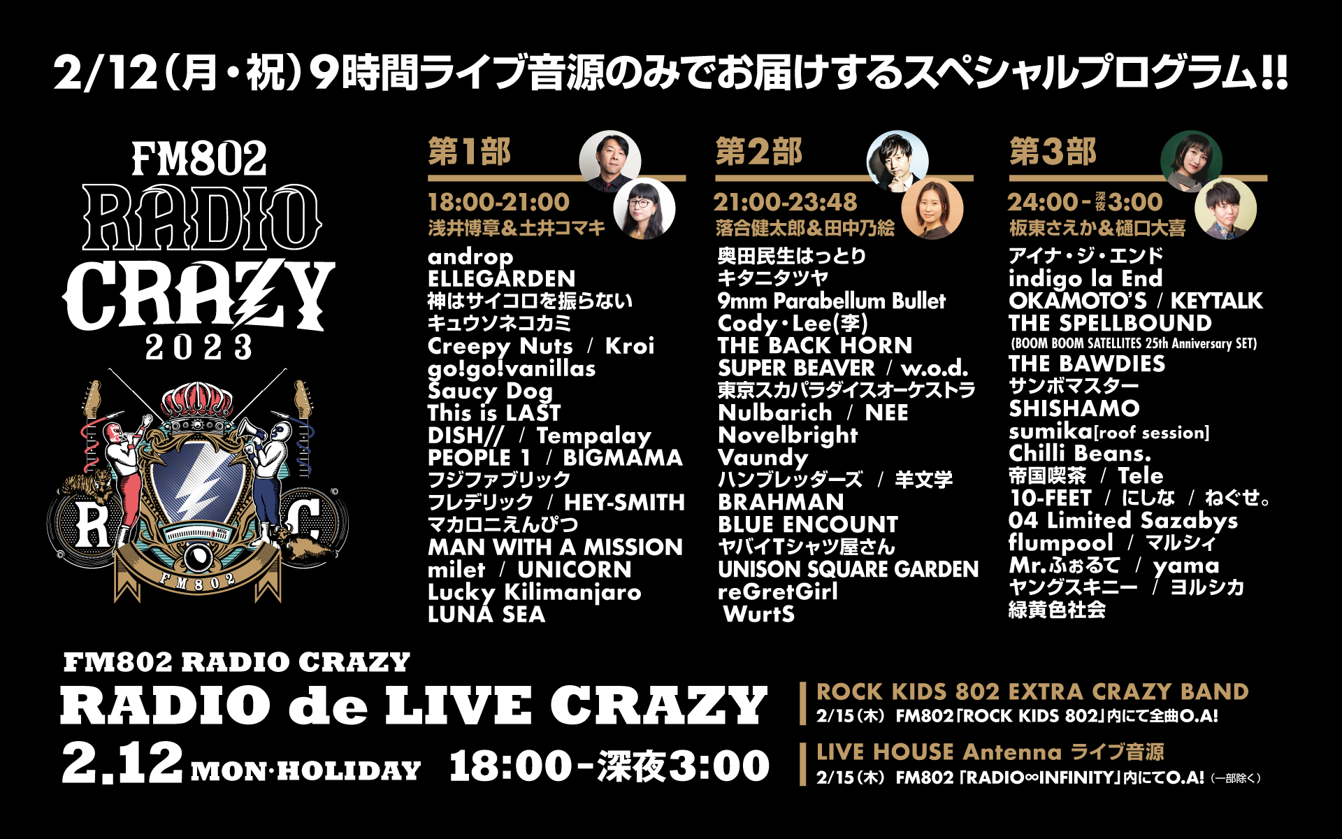 FM802が2023年12月27日(水)~29日(金)の3日間、インテックス大阪にて開催したロック大忘年会『FM802 RADIO CRAZY』。このイベントの貴重なライブ音源をたっぷりオンエアされるスペシャル番組『RADIO CRAZY RADIO de LIVE CRAZY』が2月12日(月・祝)18:00~深夜3:00まで9時間の生放送が決定した。