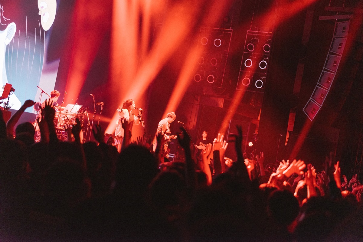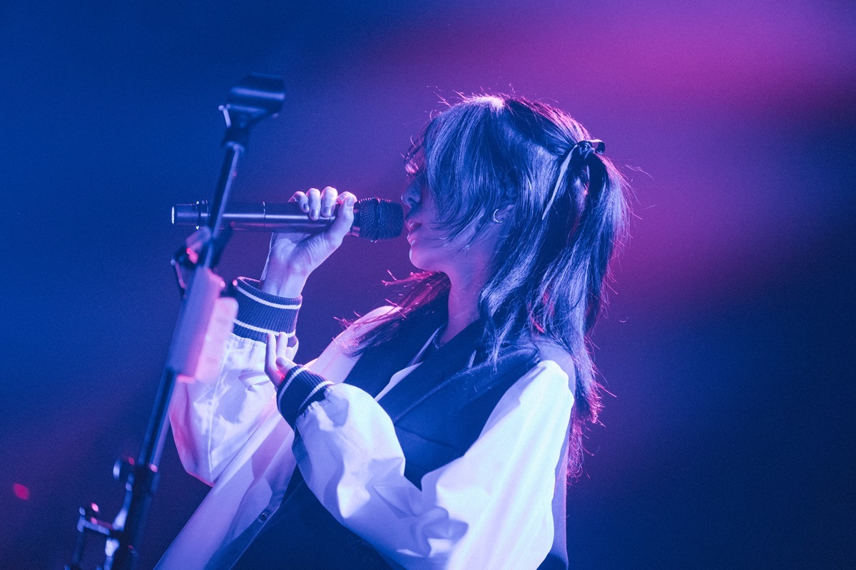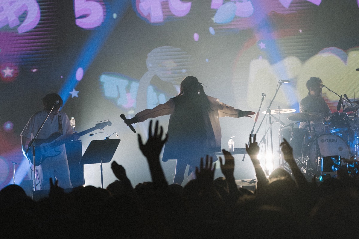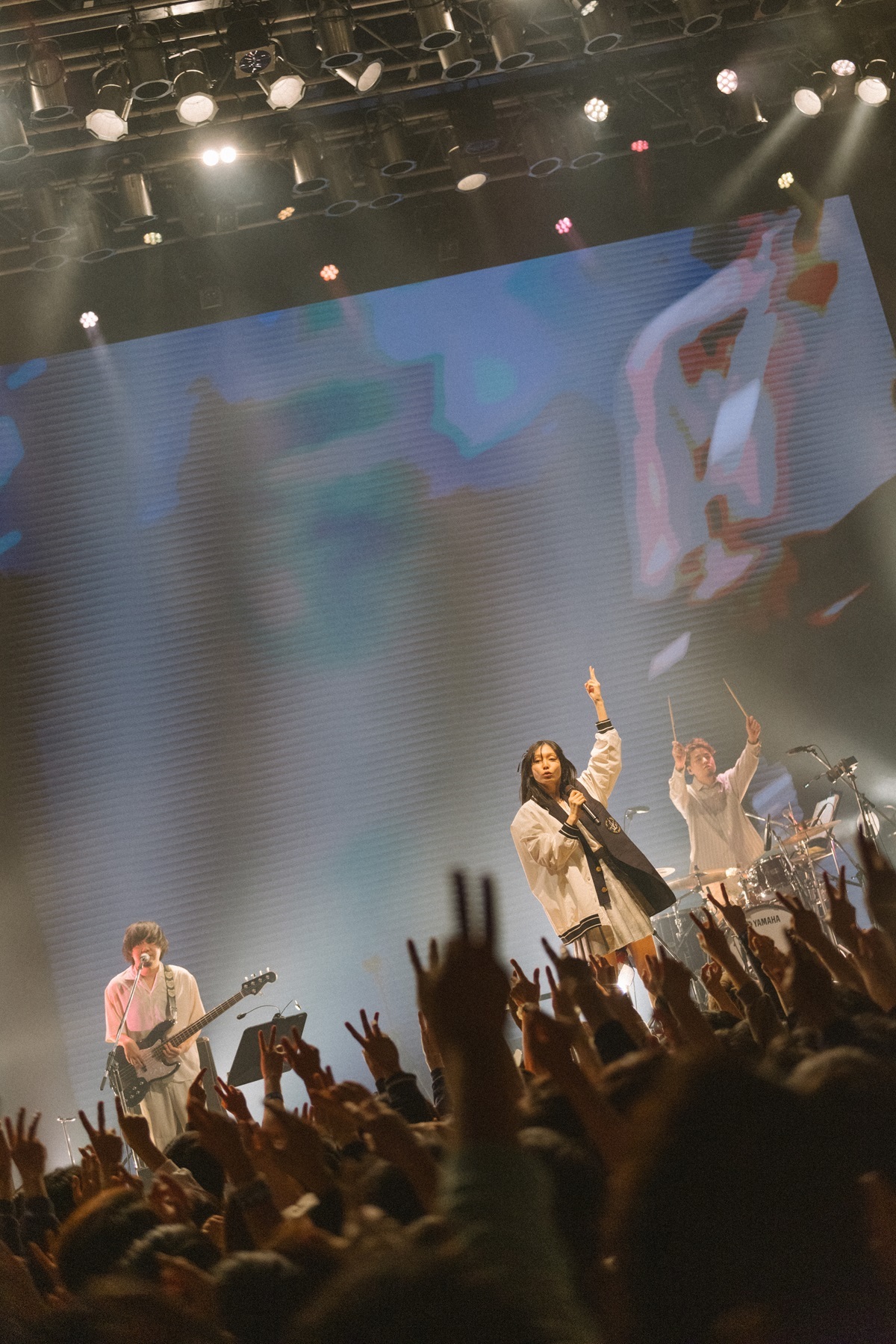 「外、寒かった? 雨も降ってた? ほんまにごめんって感じ(笑)。ここで温まってもらおうと思うんですけど、みんな、準備はできてますか?」――最初のMCを経て披露された「ヤンキーダンス」「忘れないでベイベー」「事象と空想」は、豊かな表現力をますます感じさせてくれた。キュートでありつつ雄々しさも兼ね備えている彼女の歌声は、耳を傾けていると深く引き込まれる。ステージから届けられる音を噛み締めながら胸を震わせている観客の波動が、周囲の空気を通じて伝わってくるような気がした。