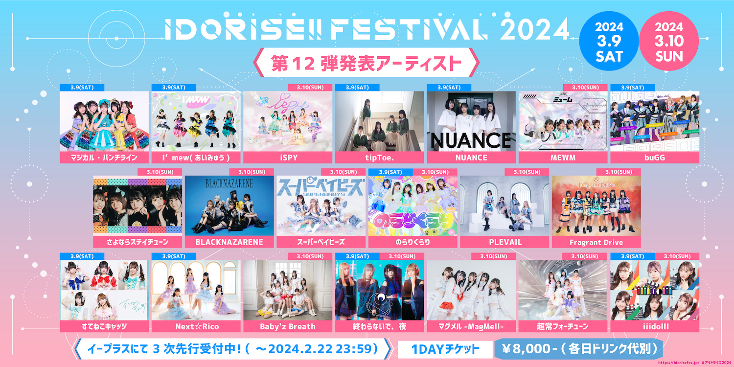 第12弾アーティストとして、マジカル・パンチライン / I'mew (あいみゅう) / iSPY / tipToe. / NUANCE / MEWM / buGG / さよならステイチューン / BLACKNAZARENE / スーパーベイビーズ / のらりくらり / PLEVAIL / Fragrant Drive / すてねこキャッツ / Next☆Rico / Baby'z Breath / 終わらないで、夜 / マグメル-MagMell- / 超常フォーチューン / iiiidolllといった計20組の出演が発表された。今回の発表で総勢160組となったが、出演者は随時追加予定となっている。